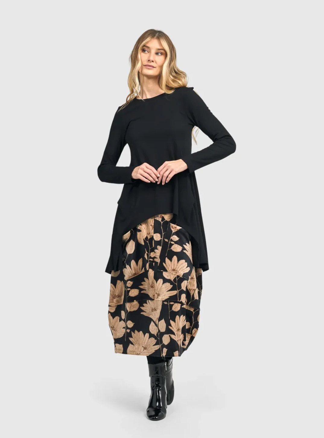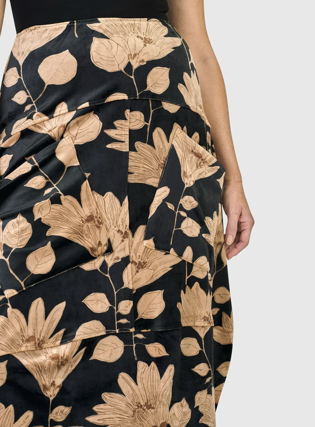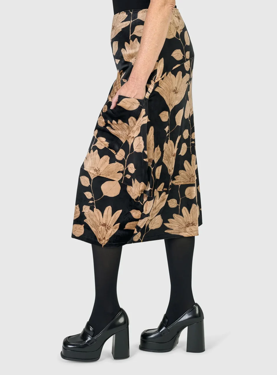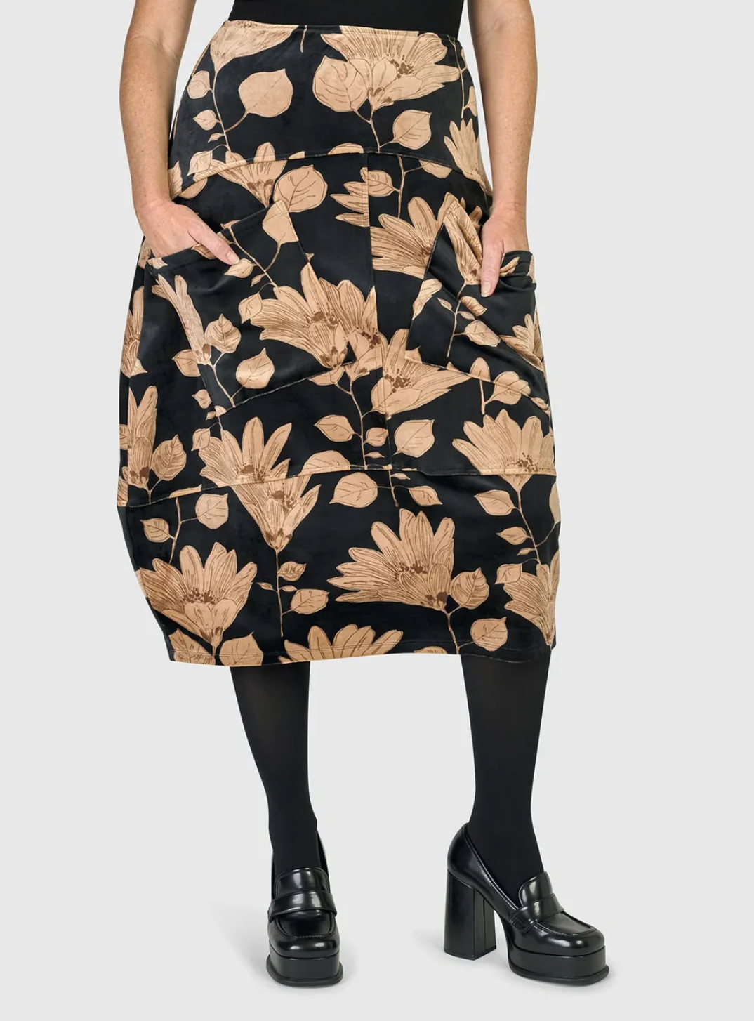 This high-waisted midi skirt has a thin all-around elastic waistband and drop-waist panel that falls into a cocoon shape. Front patch pockets, middle back vent at hem, and made in a mid weight velvet.