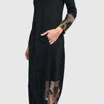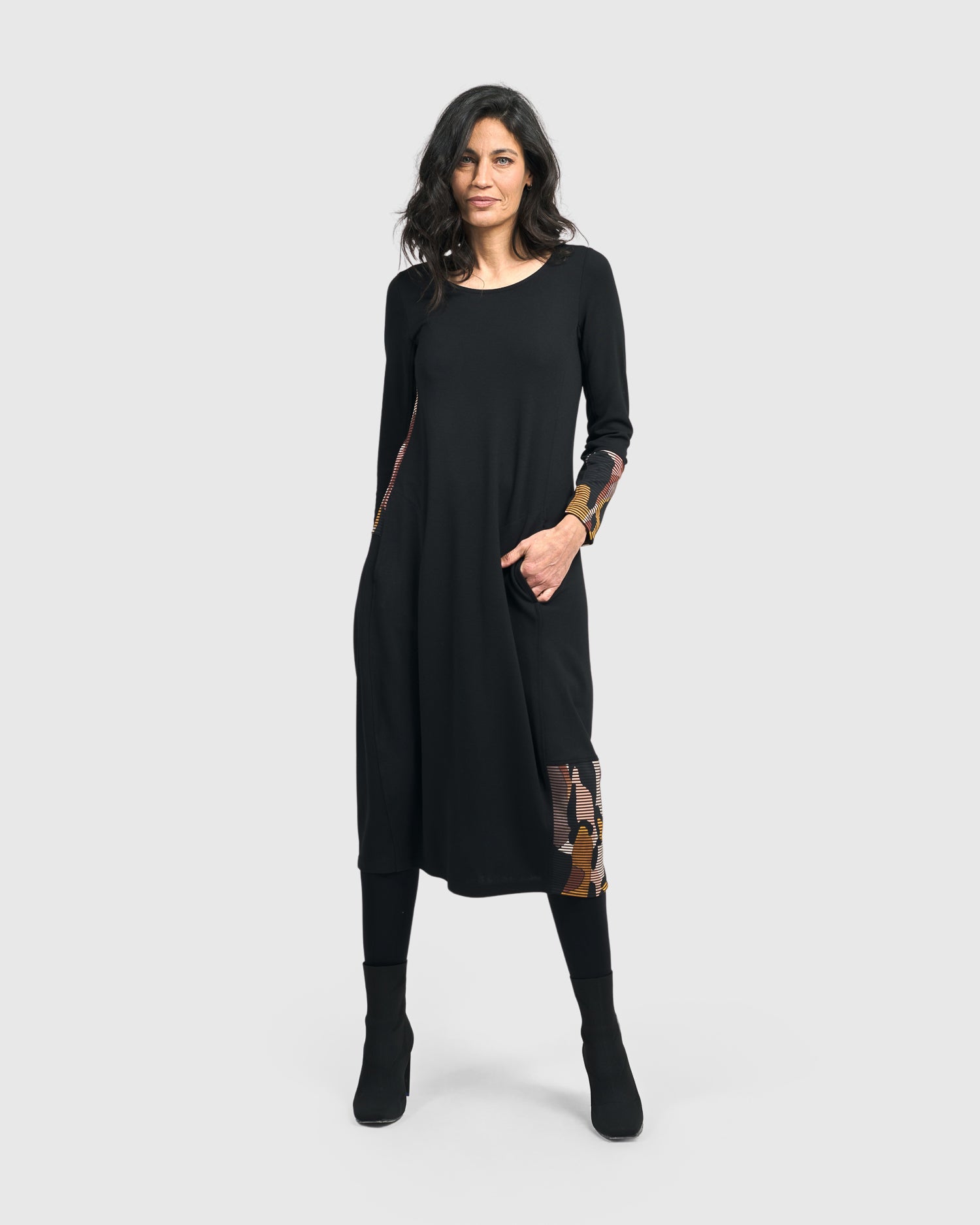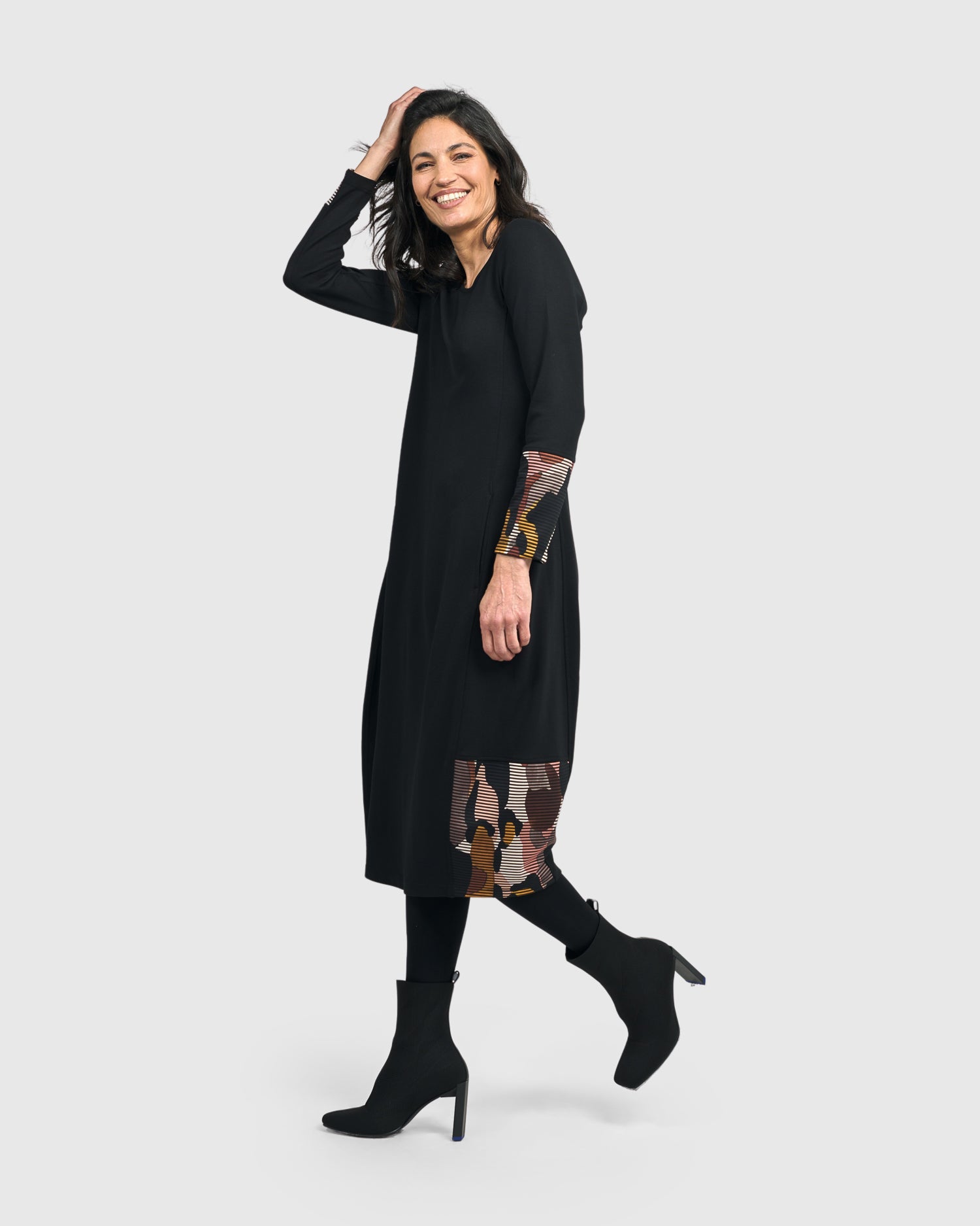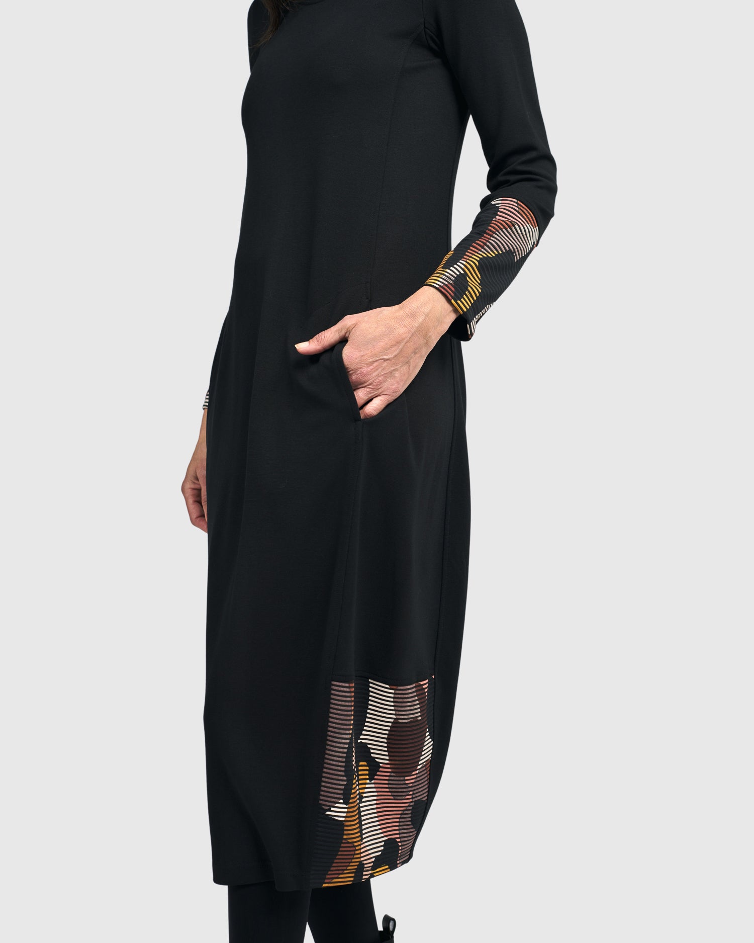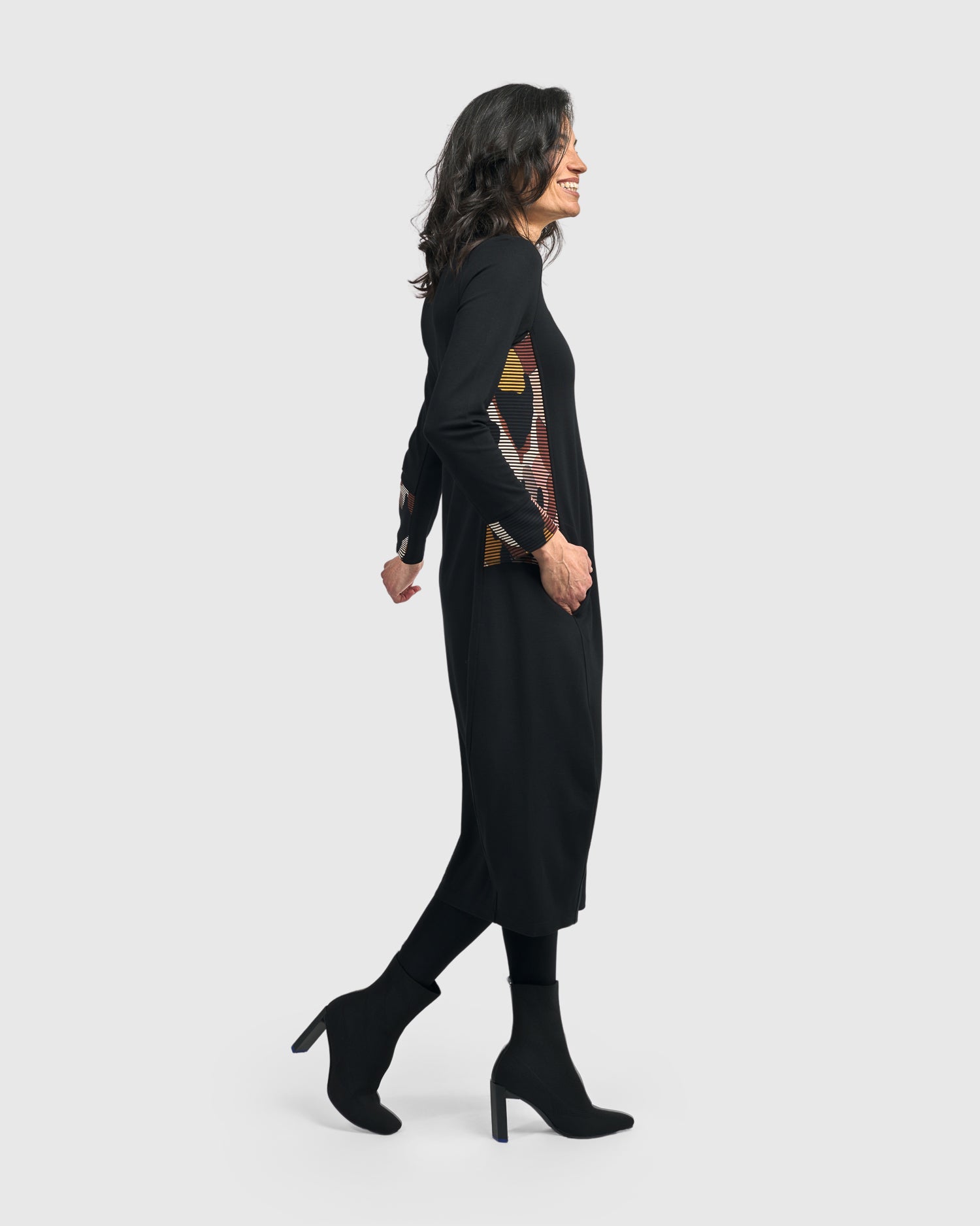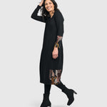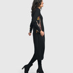 This defined cocoon dress is crafted from a mid weight viscose knit, featuring a wide neckline and long sleeves, hugging the bust before elegantly flaring into a cocoon skirt. The colourful, textural abstract patches add a unique touch. Pair with your favourite colourful shoes to complete a striking, artistic look.