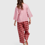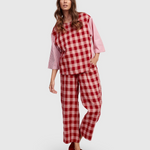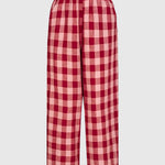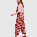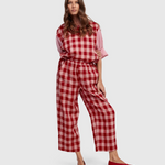 These stylish pants from Alembika offer a fresh and playful look. Featuring a relaxed fit with an elasticated waist and convenient pockets, they come in a vibrant red and pink check pattern. Crafted from breathable linen, they are ideal for warm weather. Wear them with the coordinating top for a polished outfit or pair with a white tee for a chic, casual appearance.