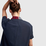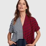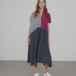 Take a trip in the Sail Away Midi Dress, a nautical dream. This navy pullover dress is made in a mix of cotton poplin and French terry for a casual-yet-refined feel that's wearable whether you're beachside or inland. This style has a V-neck and drop shoulder short sleeves, plus an oversized fit, A-line silhouette with drop waist and apron pockets.