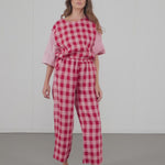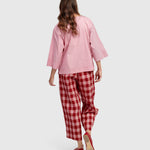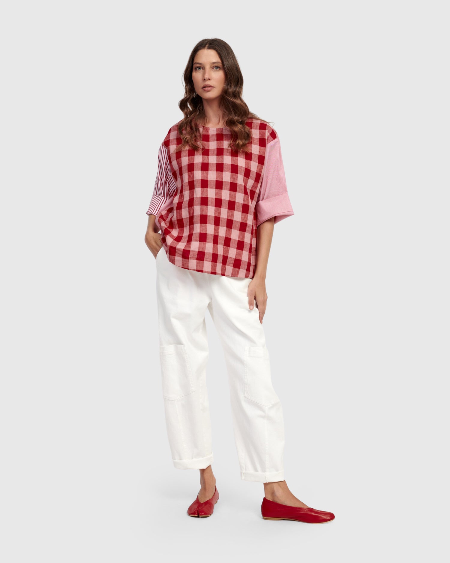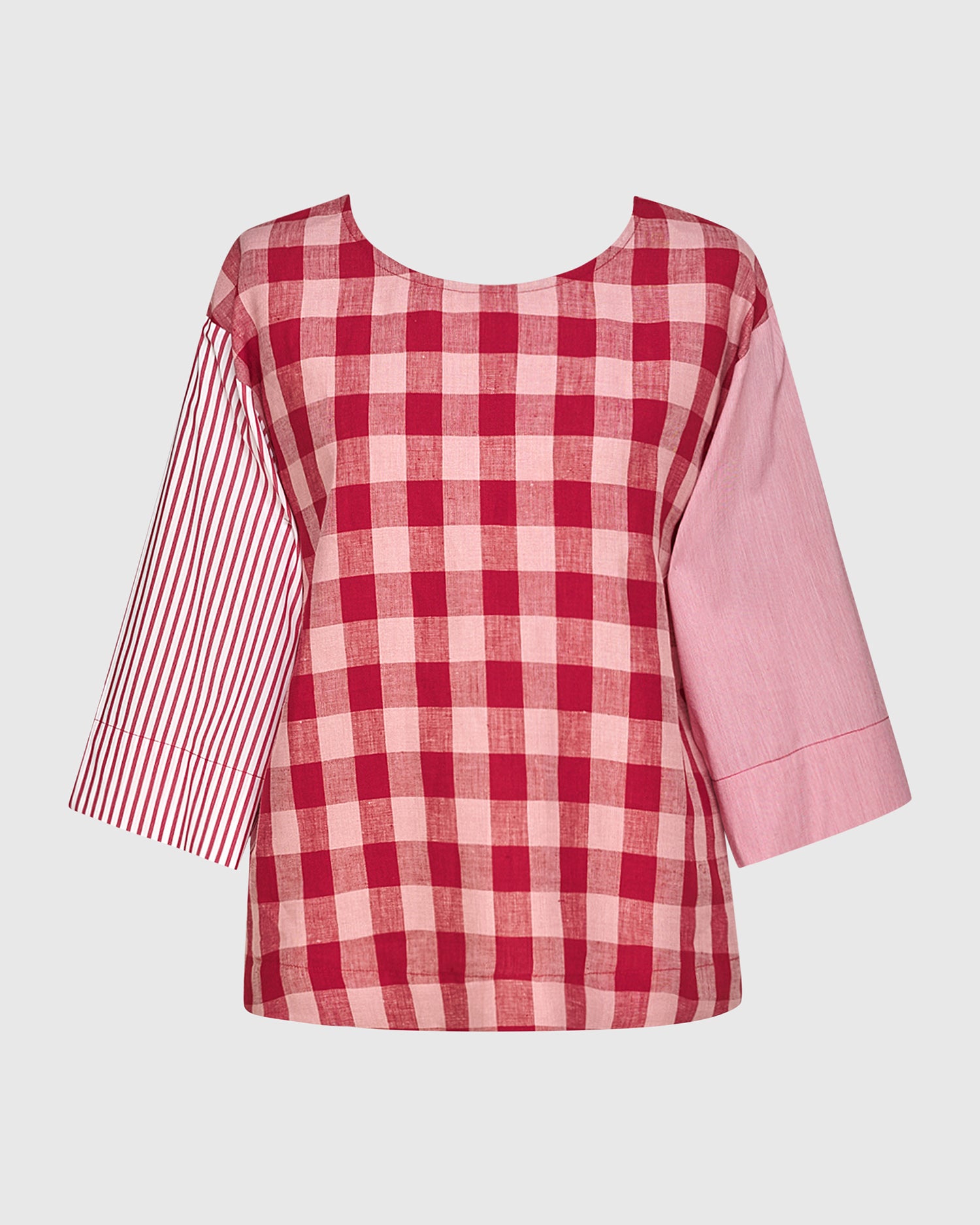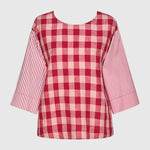 A loose-fitting T-shirt made from a combination of high-quality fabrics with various patterns in shades of red, white, and pink. It has wide ¾-length sleeves & a round neckline