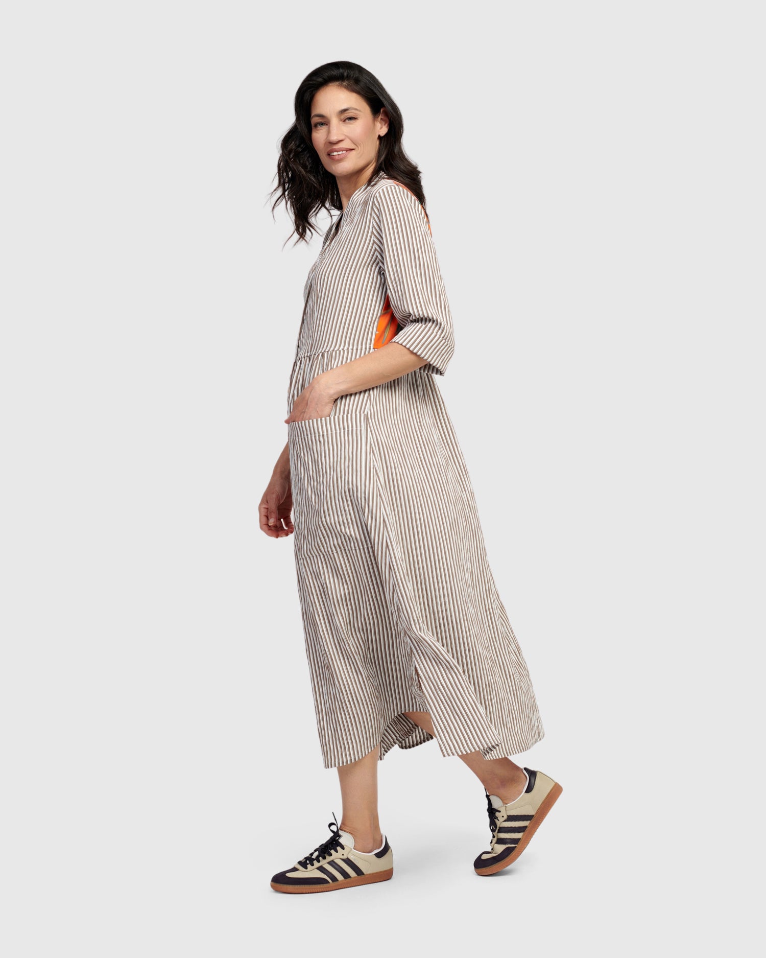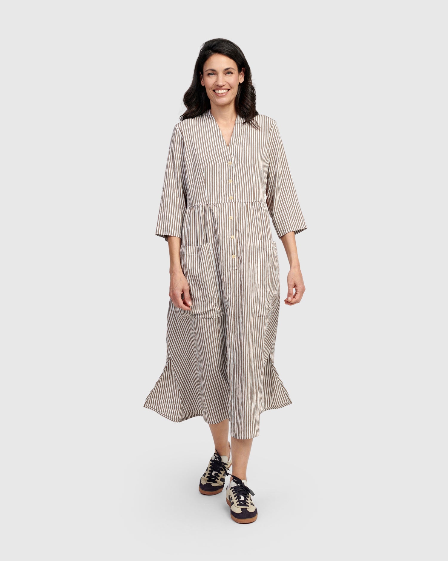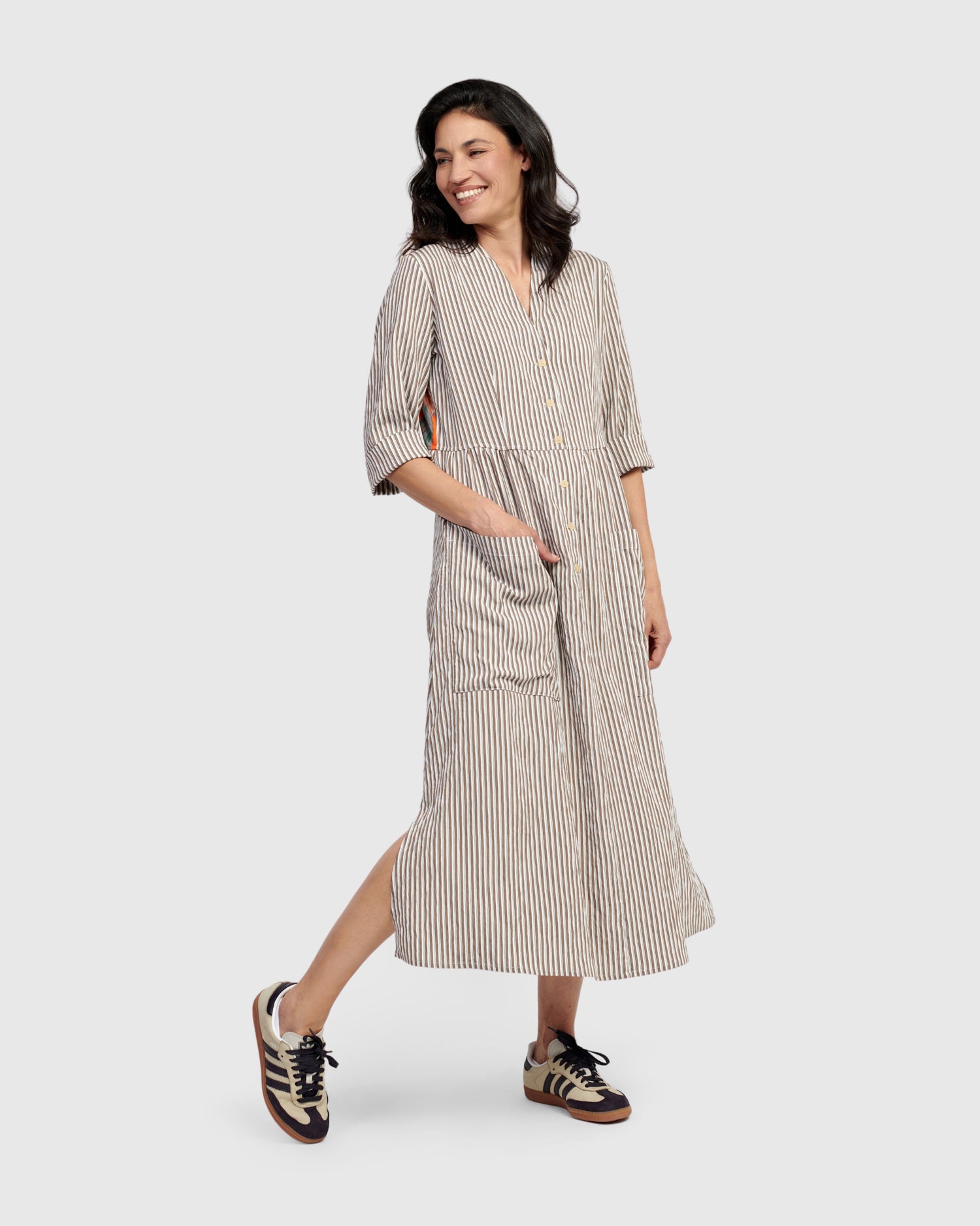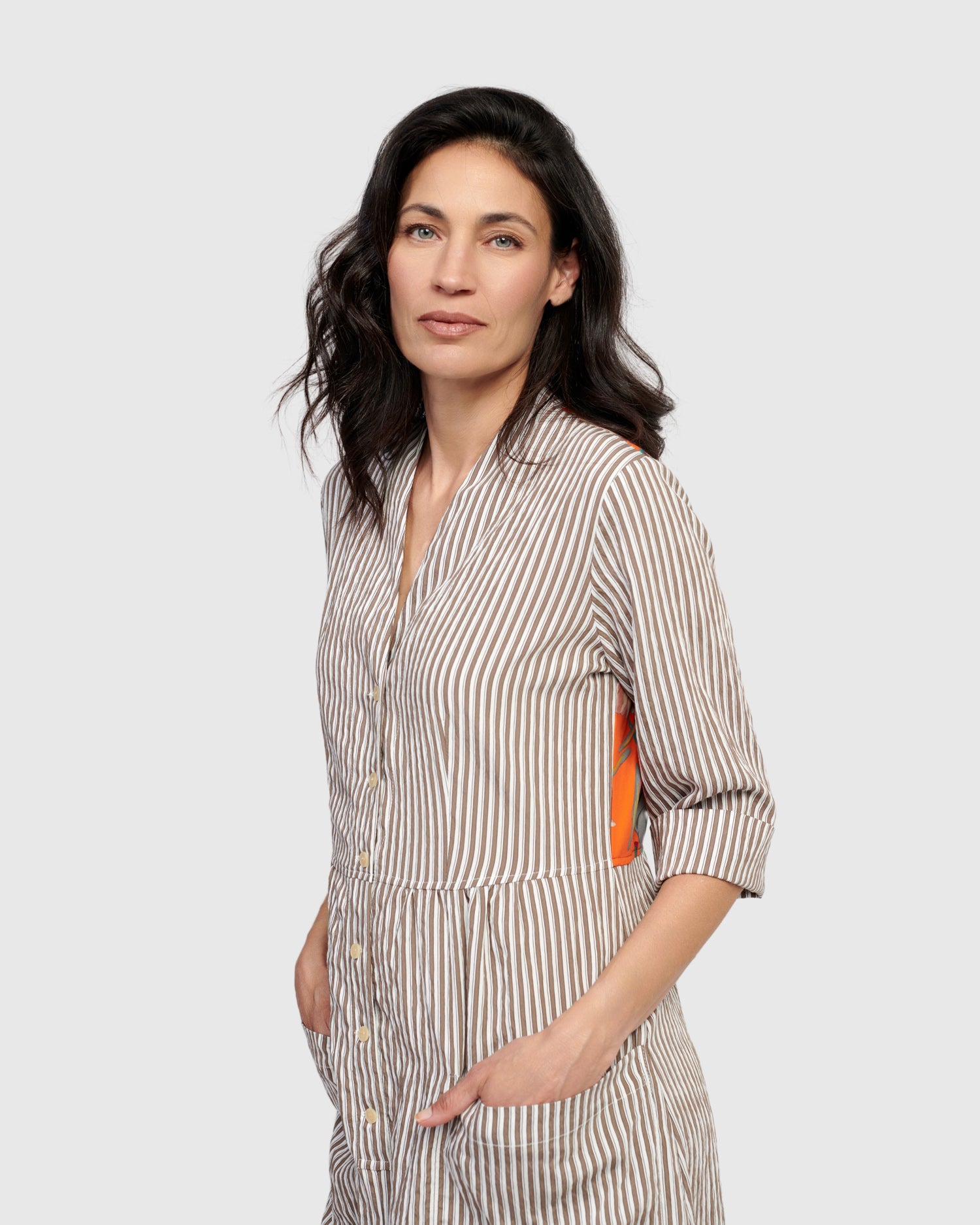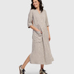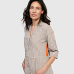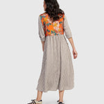 Alembika’s statement dress fuses classic stripes with a garden-inspired floral panel at rear. This dress features a flattering V-neckline, half button-front closure and front pockets. Crafted from a mixed fabric blend.