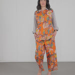 Fun straight-cut, ankle-length pants in a gorgeous cotton fabric with a floral print in shades of orange, turquoise and pink. They have pair of flap pockets, as well as a pair of side cargo pockets at knee height with elastic at the waist