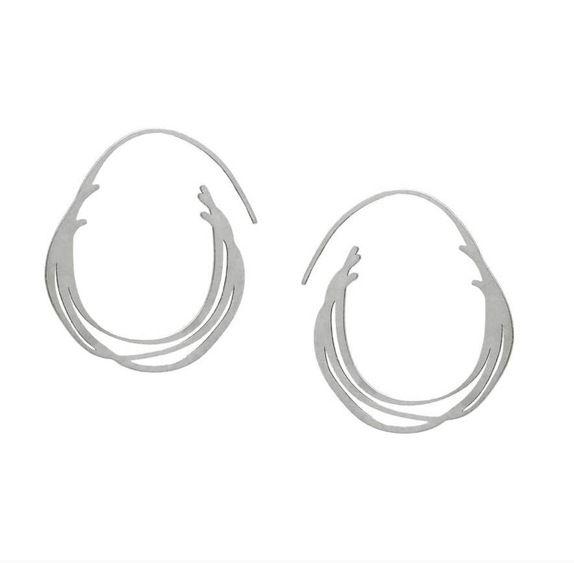 The Creel Earrings are an organic hoop structure crafted from lightweight and hypoallergenic stainless steel. This delicate sculptural design creates a unique silhouette against the face, slipping easily into the ear and fastened with a silicon stopper.