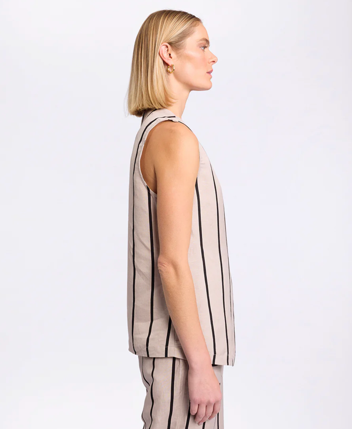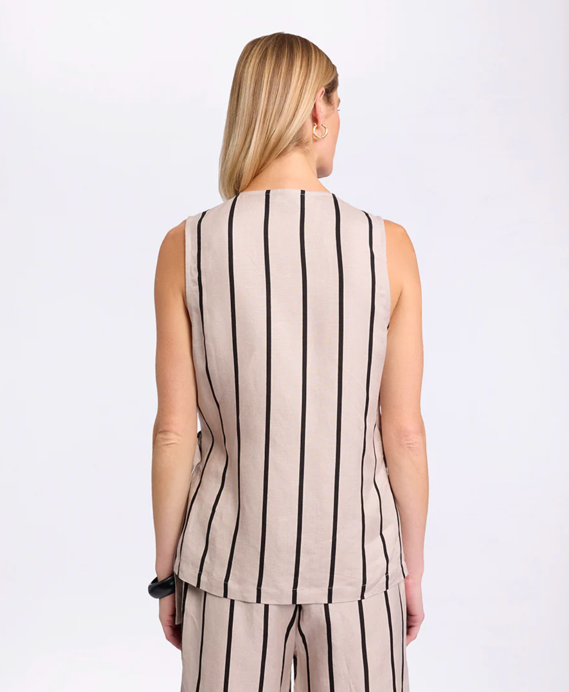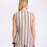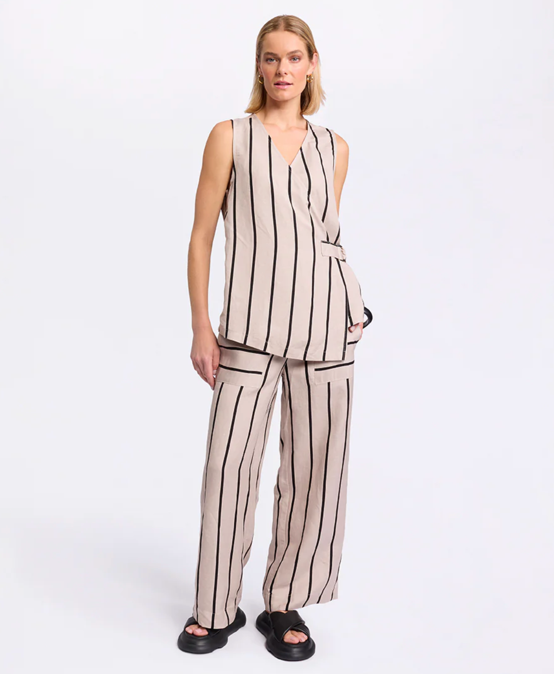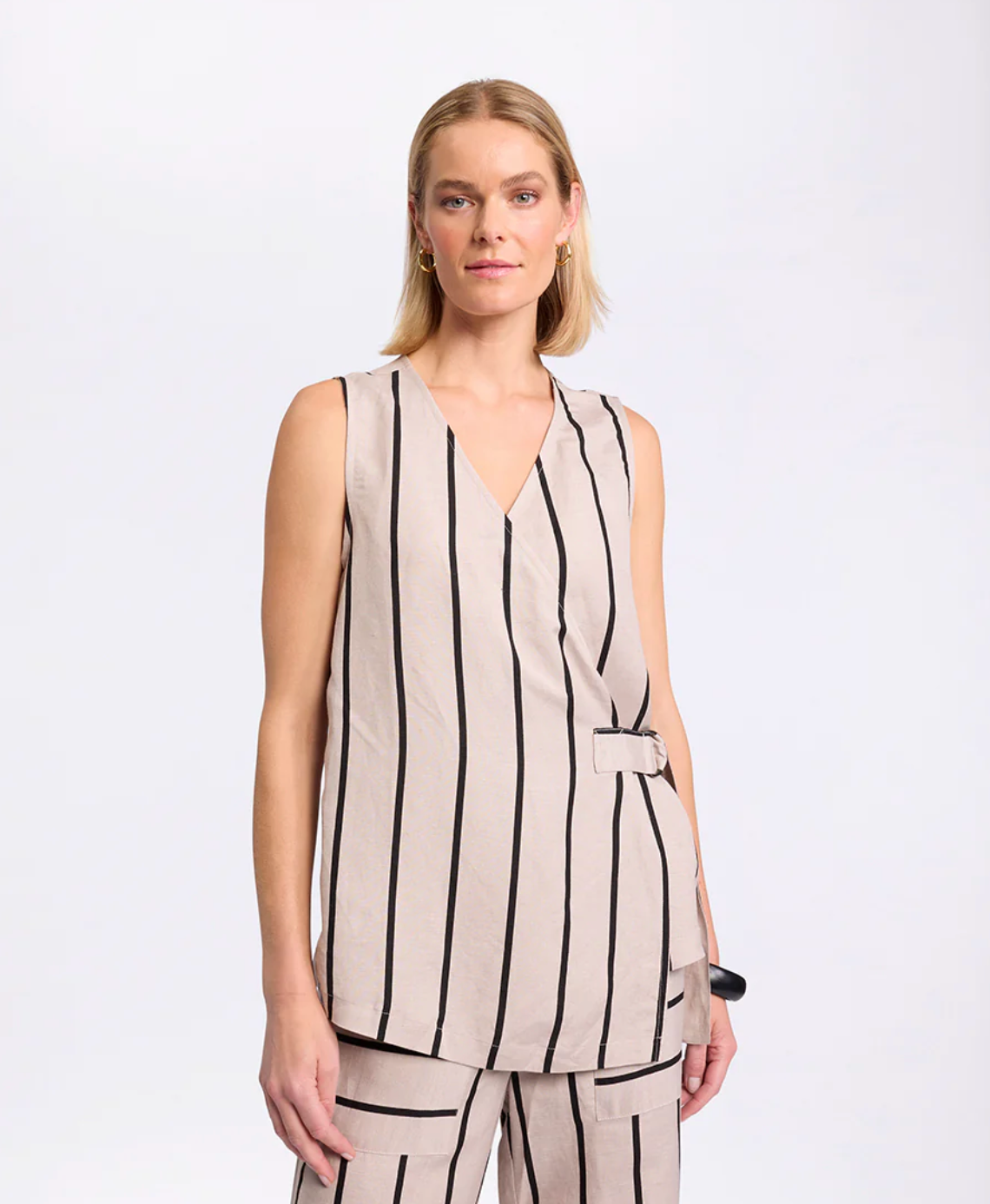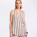 Add a touch of modern flair to your wardrobe with the sleeveless Stripe Wrap Shirt. This Top showcases our Natural Stripe print and a front wrap design with an adjustable strap and D-ring closure for a personalised fit. It's asymmetric hem and relaxed, lower-hip length elevates an understated style