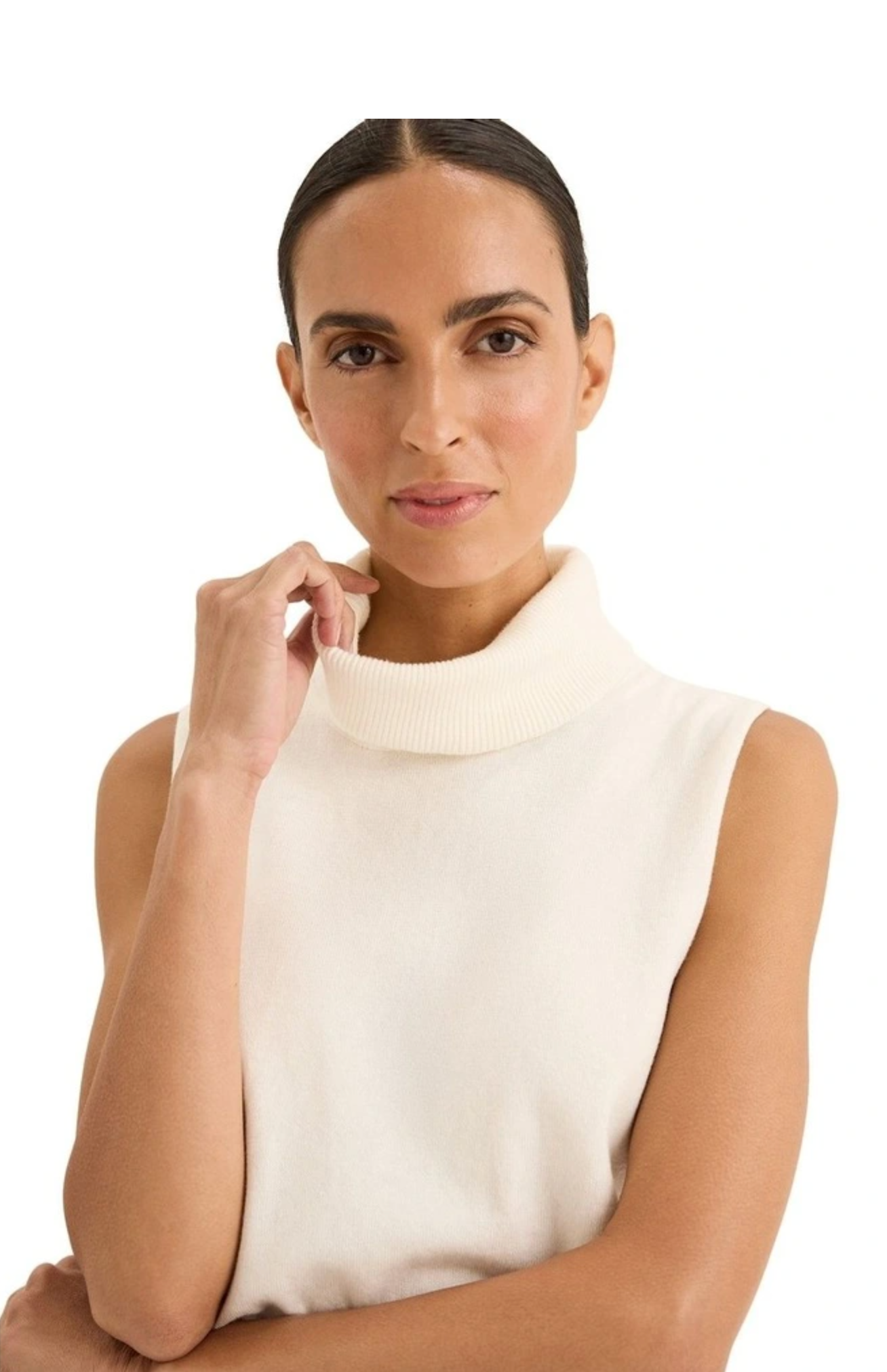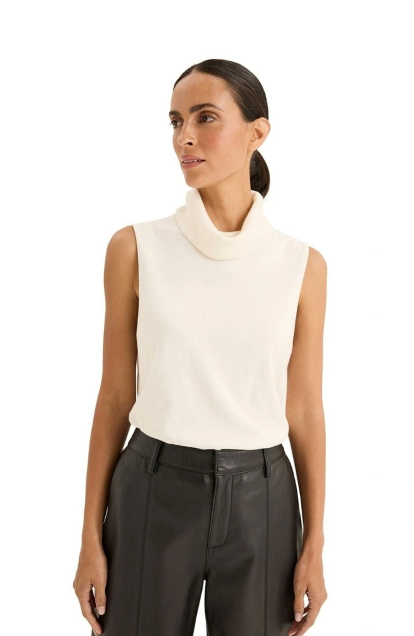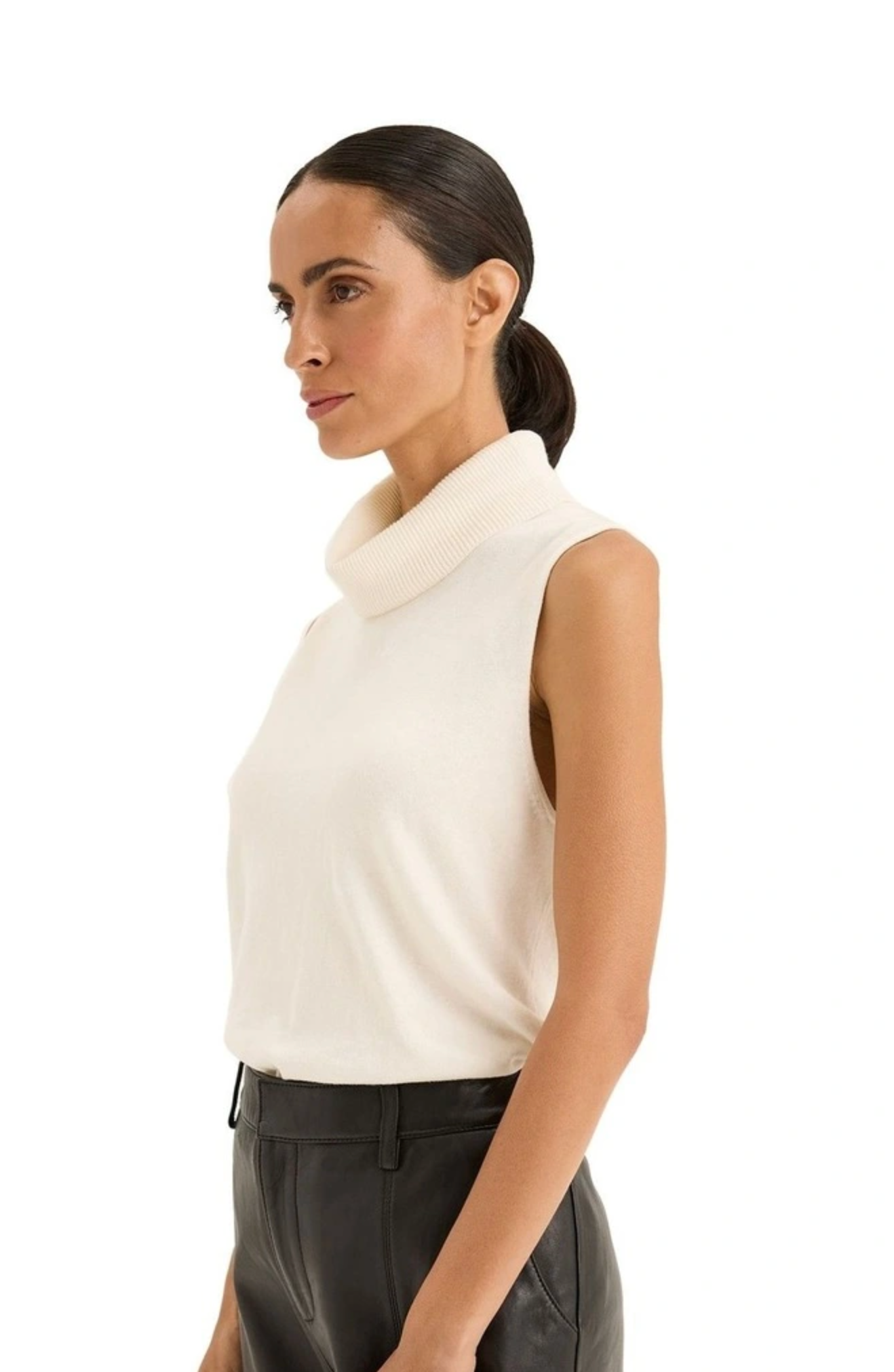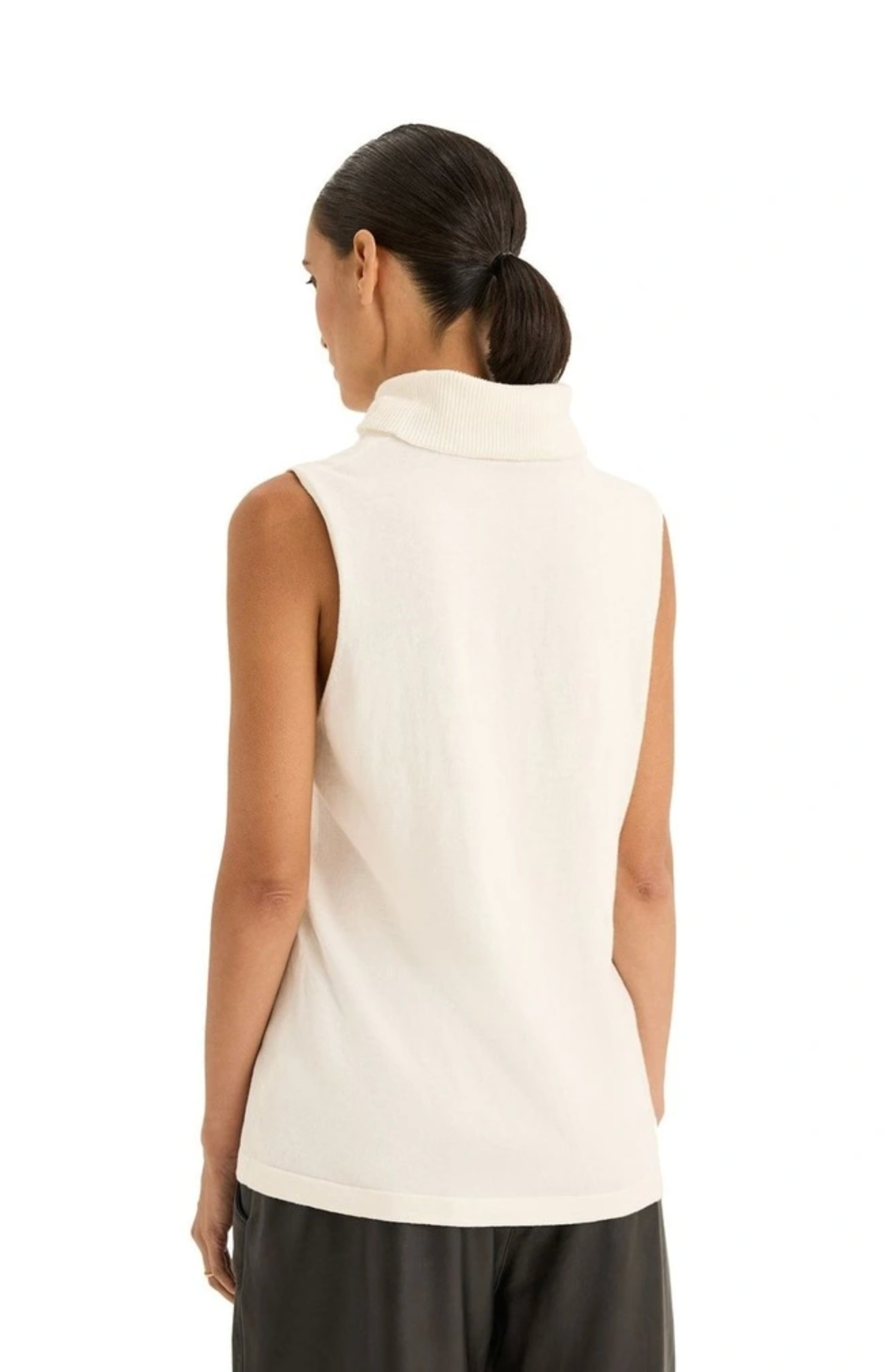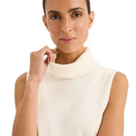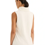 The Tranquil Knit features a high rolled neckline, sleeveless design, and a regular fit, offering a blend of comfort and style. Made from a luxurious cotton and cashmere blend, it provides a soft, refined feel. For styling, pair it with high-waisted jeans or trousers for a sleek look, or tuck it into a skirt or pants for a casual vibe. Layer with a blazer or cardigan for added warmth and accessorise with jewellery to highlight the neckline. Complete the look with sneakers for an effortlessly chic outfit.