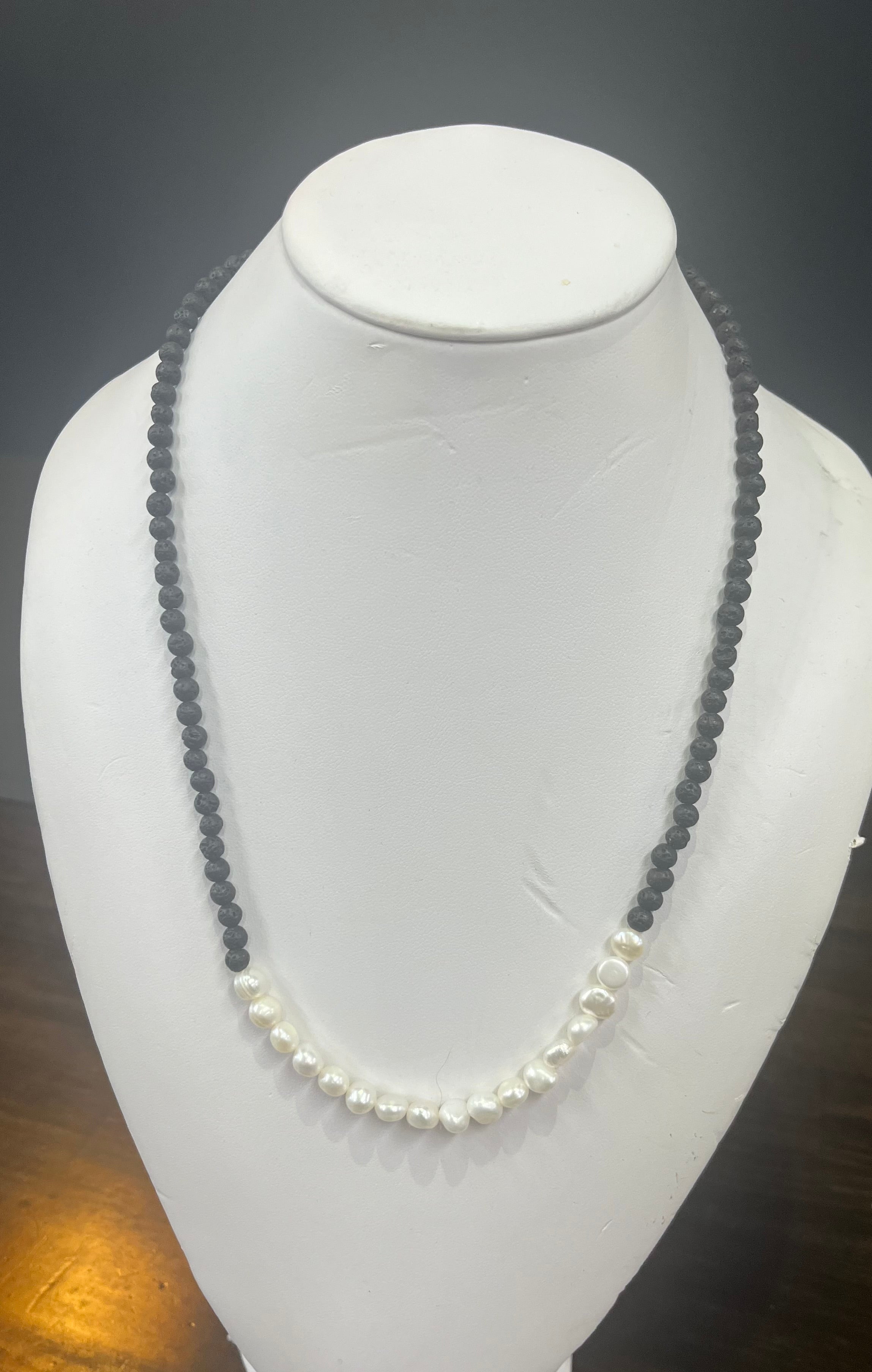 Handcrafted in Australia, this elegant necklace combines raw black lava beads with lustrous 5mm freshwater pearls for a striking contrast. The 50 cm length offers versatile styling—wear it close to the neck or layered with other pieces. A timeless piece that bridges natural texture with refined elegance.