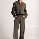 - Drawstring cord at waist that can be pulled in or left relaxed