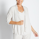 This elegant jacket features layered detailing at the front for a timeless, essential look. Crafted from the signature Lustre technical fabric, it is easy to care for—simply machine wash and hang to dry, no ironing needed. Designed for versatility, it pairs seamlessly with Lustre coordinating pieces, printed pants, perfect from work to weekend. With extended shoulders for added sleeve coverage and a fluttery layered hemline. Ethically made in Sydney, and generously cut for curves—no fabric stretch; sizing up is recommended for a broader bust or shoulders.