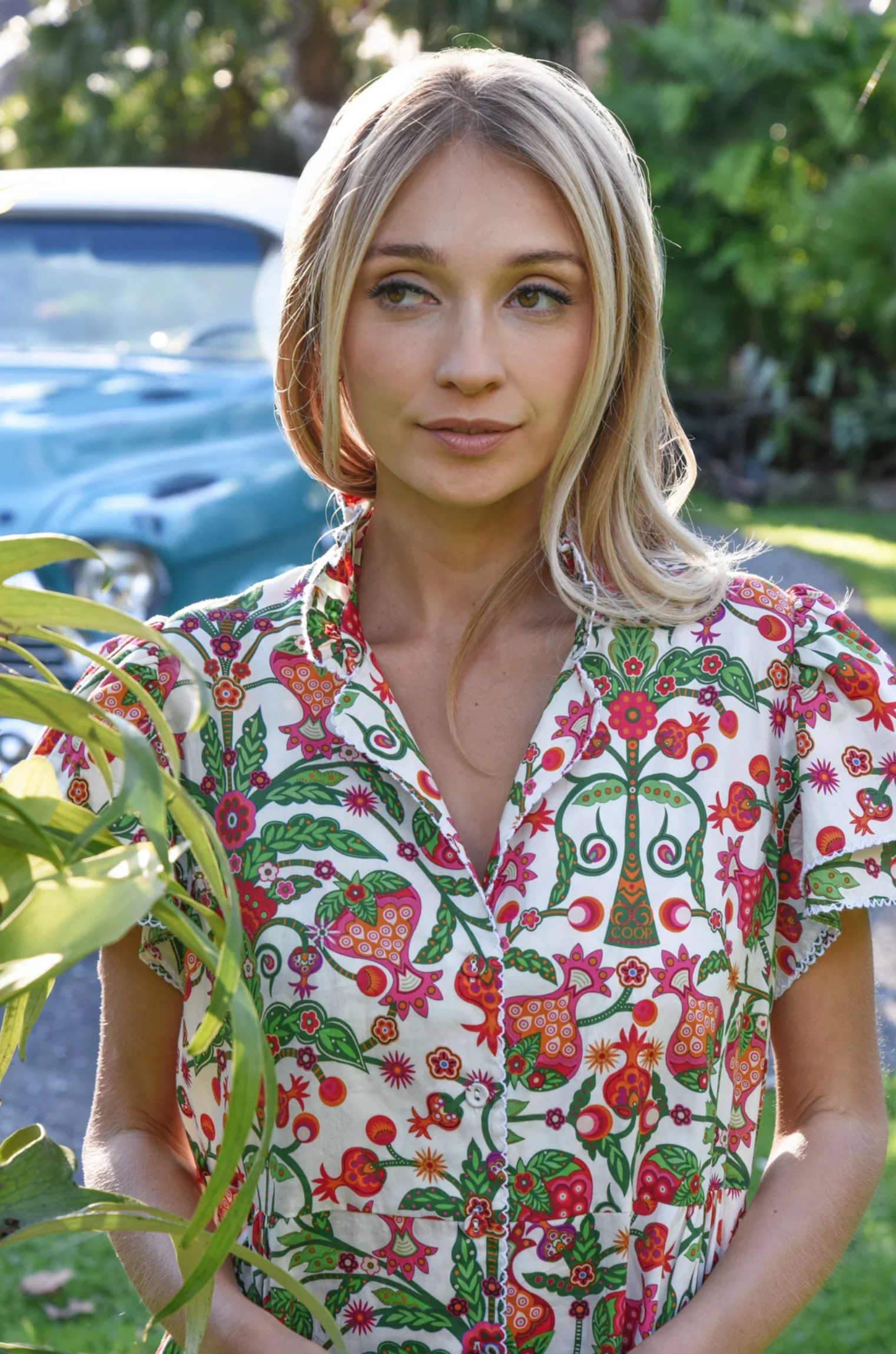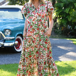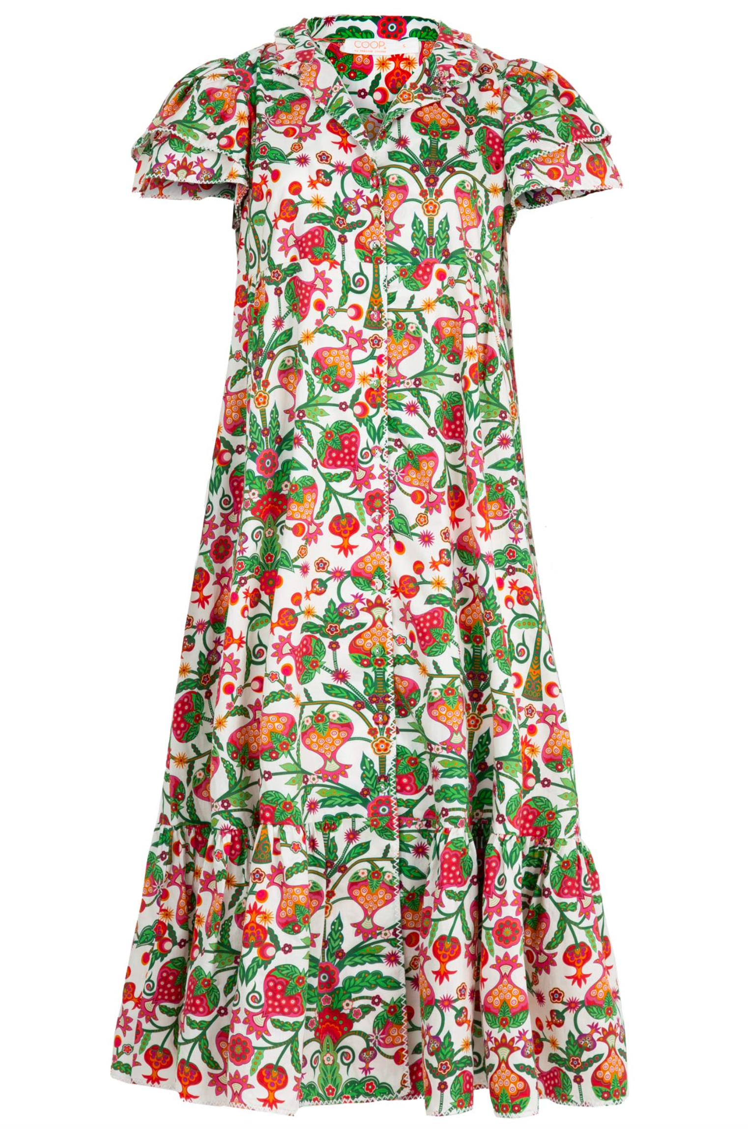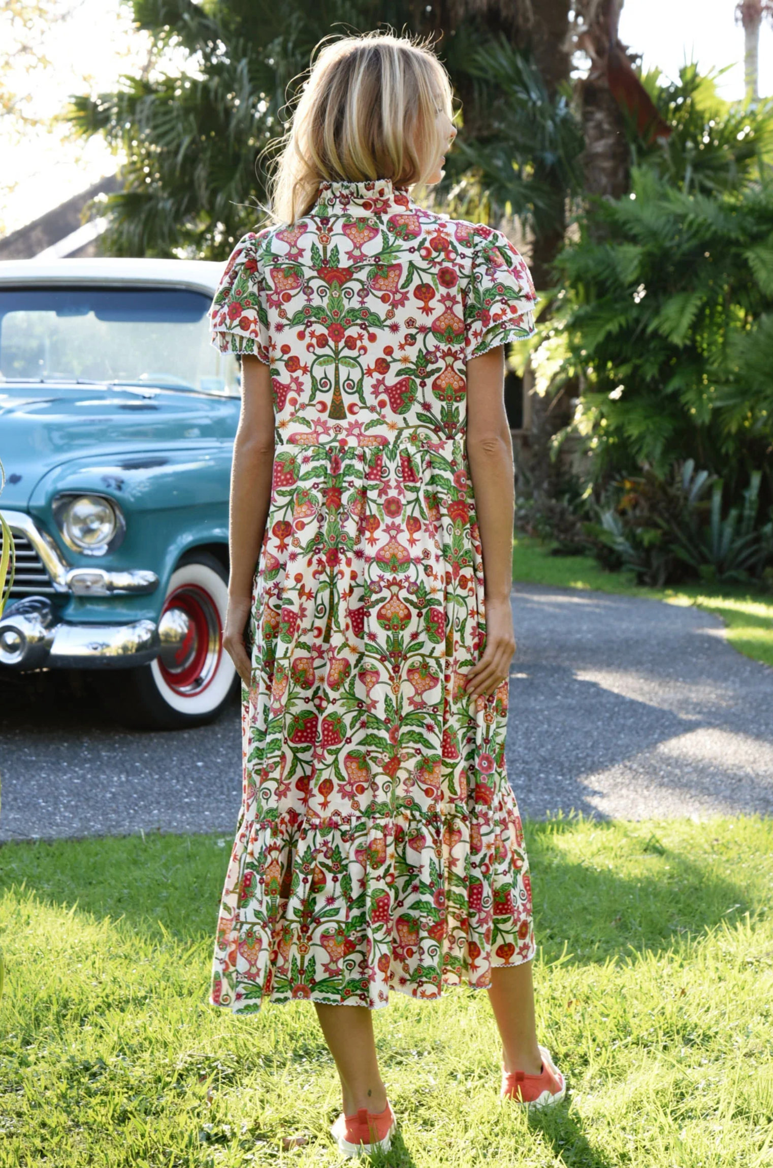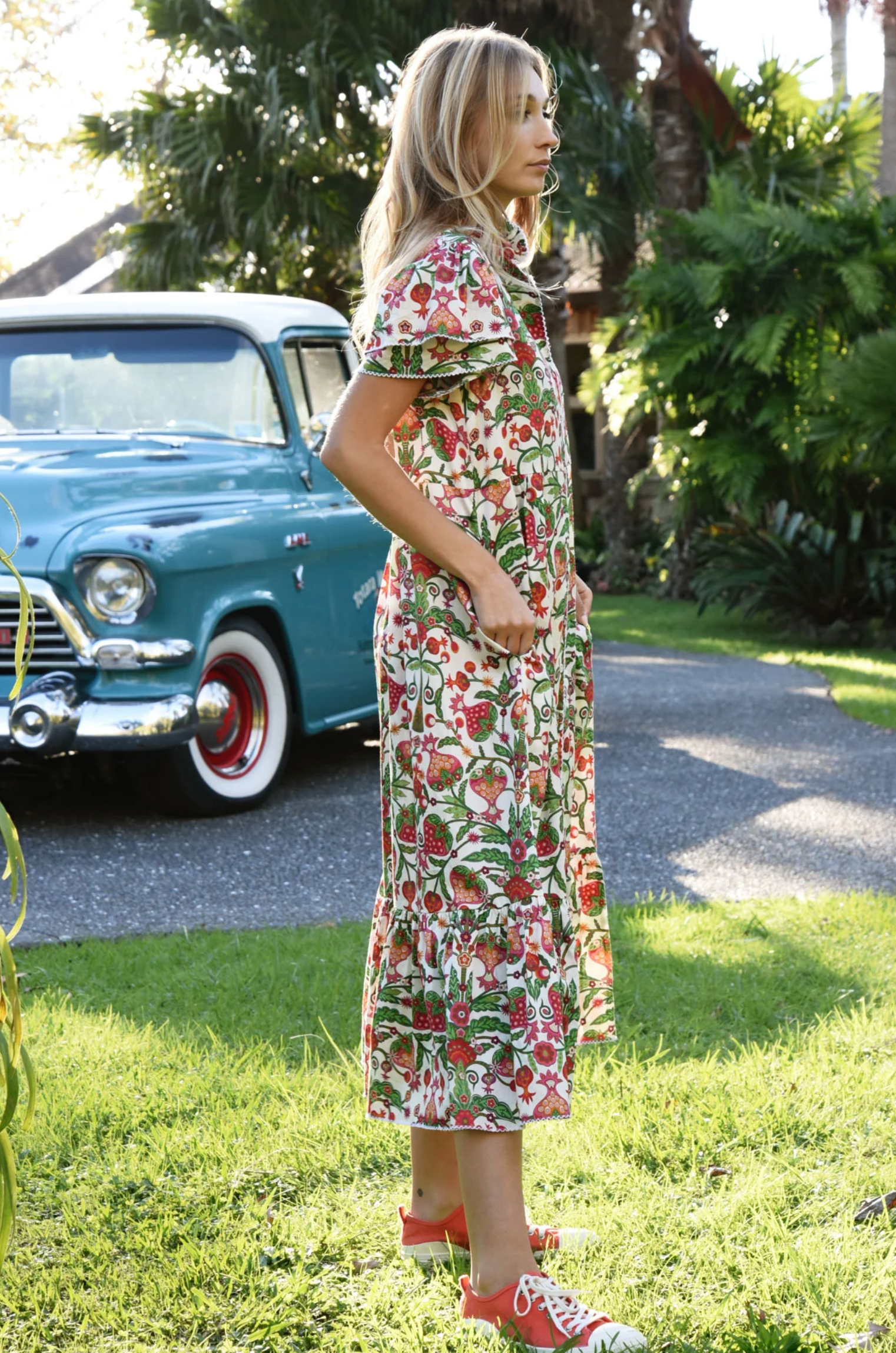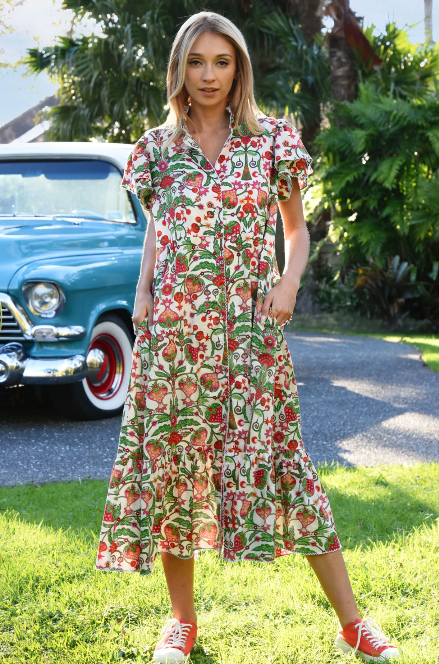 Luxe cotton sateen and a whimsical print come together to present the ‘A Little Flair’ dress. Crafted in the ‘Berry Good’ cotton sateen, this dress sports a button through front, complete with covered buttons, layered flutter sleeves and a gathered hem tier. A delicate embroidered trim polishes this charming dress to perfection.