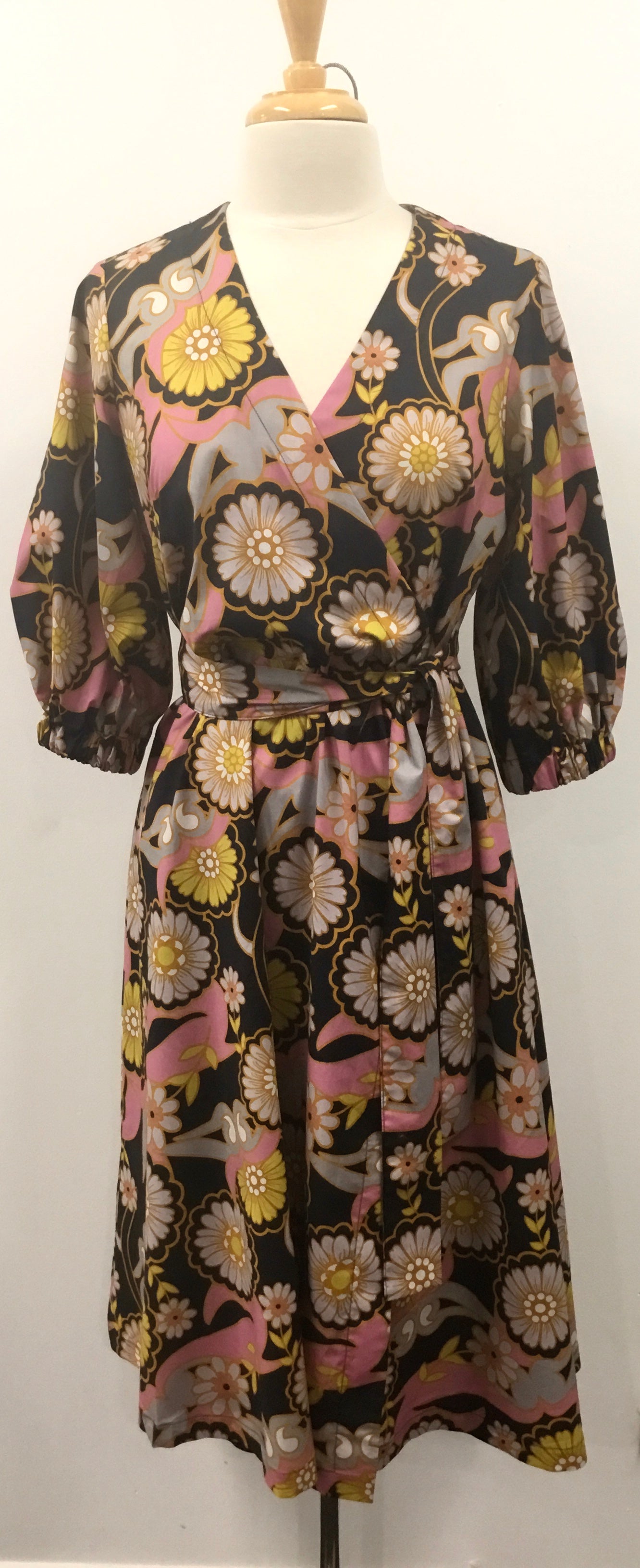 A gorgeous wrap dress in 100% cotton. It has a tie and button fastening at the waist with a separate sash to tie. Finished with puff sleeves with an elasticated cuff.
