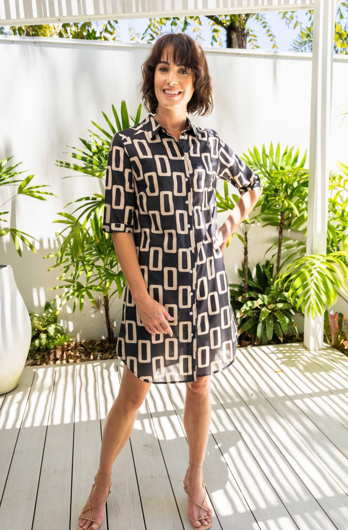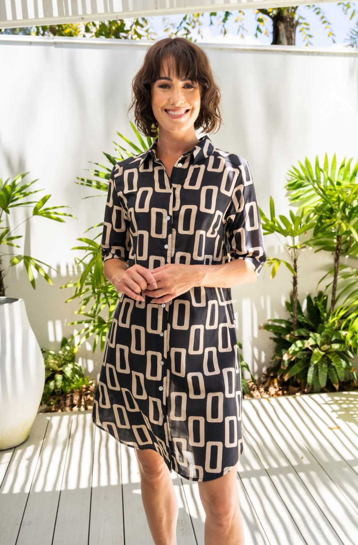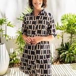 This Cotton Shirtmaker Dress in Geo print features a soft collared neck and a button-front design for classic tailoring with ease. Its curved hemline adds a subtle, modern silhouette, while side pockets provide practical storage without compromising style. Crafted for comfort and versatility, this dress is an expert choice for effortless, polished wear.
