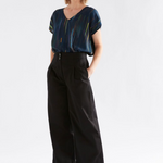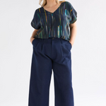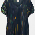 The Kayra V Neck Top showcases the striking and sophisticated Alinea Print of abstracted light streaks on a classic navy background. With a timeless, flattering V-neck and scooped high sleeve opening that creates an elongating effect while ensuring coverage on the arm. This silky soft, lightweight top is finished with thoughtful French seams that elevate the piece.