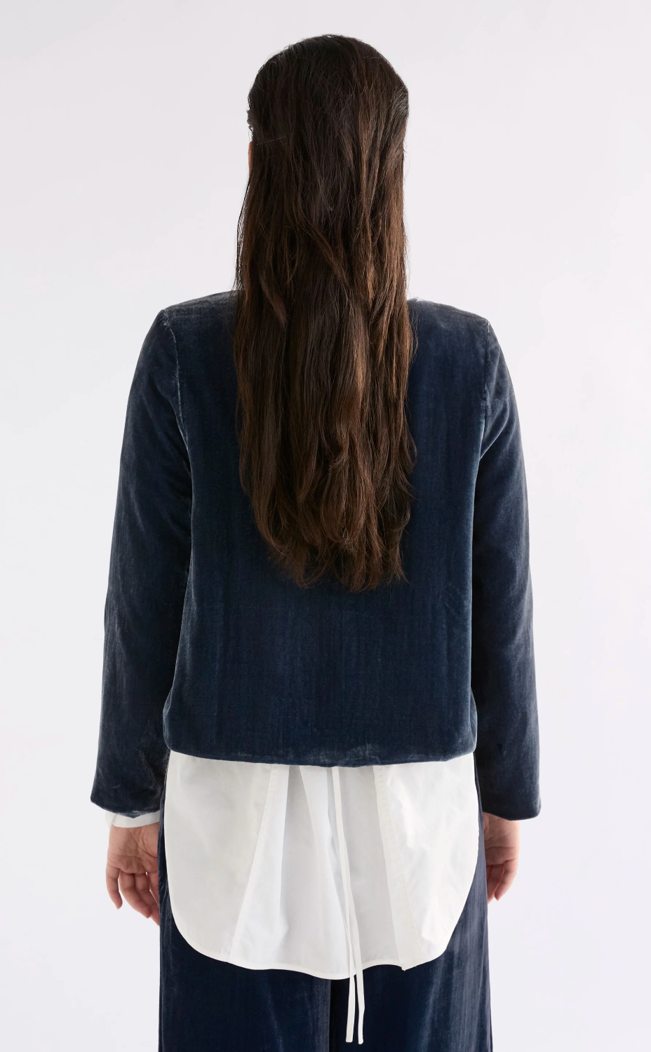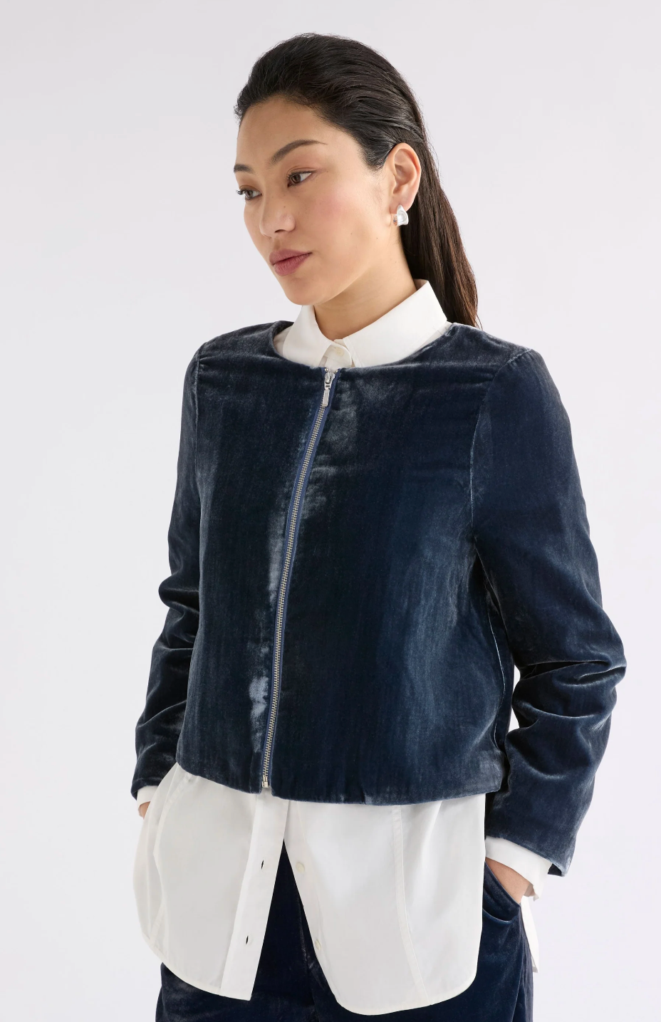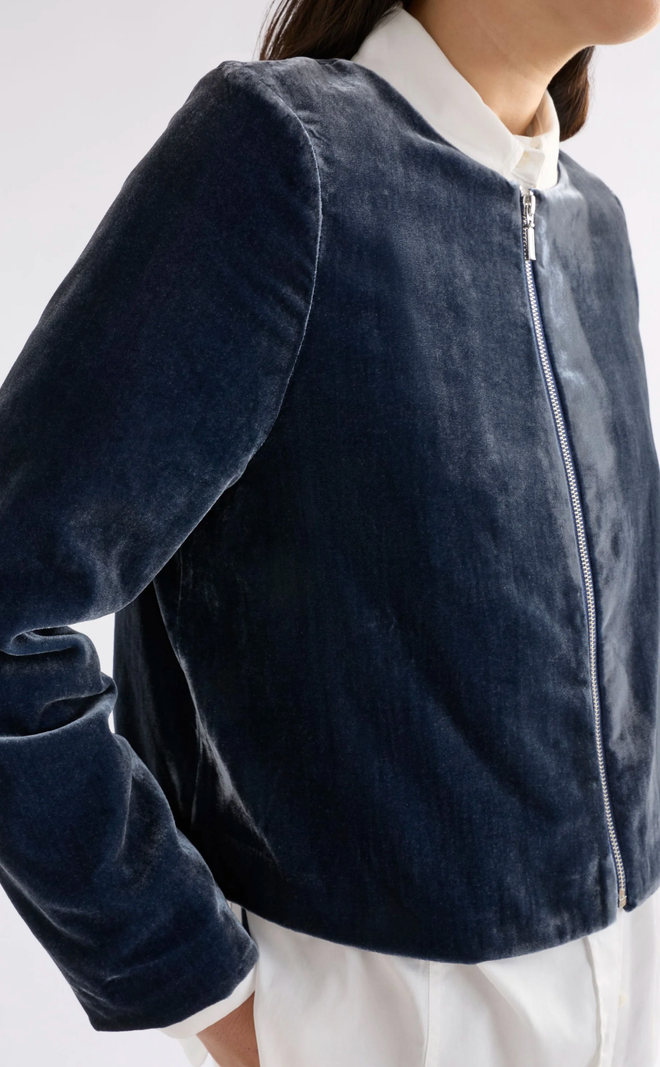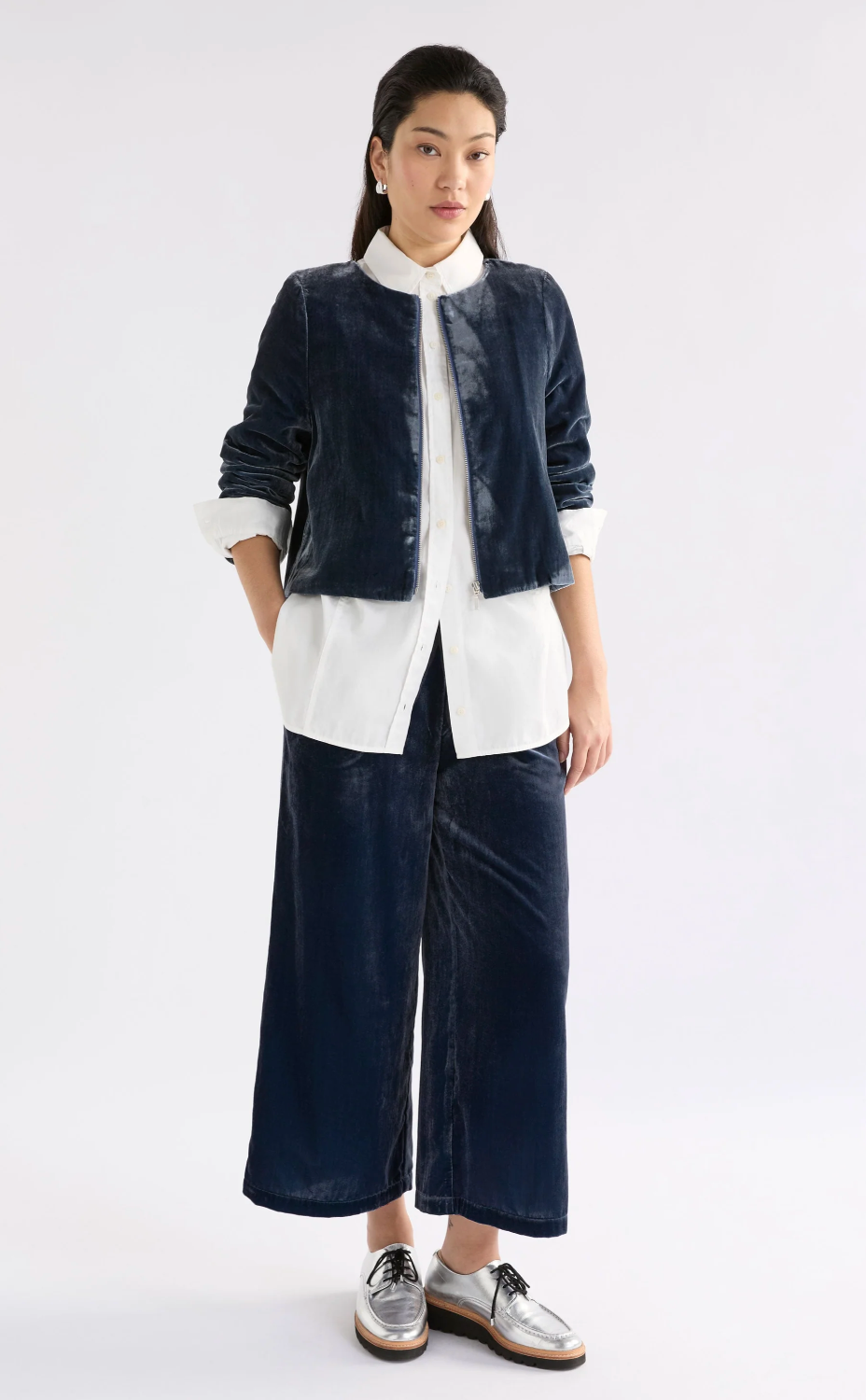 Cut from plush velvet, this jacket adds a rich, tactile feel to your layering line-up. Fully lined for a smooth fit, it features a round neck, set-in long sleeves, and a sleek front zip for a streamlined finish. Lightweight and versatile, it’s perfect for layering as the seasons shift. Pair with the matching Suuri Velvet Pants for an elevated set, or throw it over denim for a more relaxed outfit.