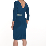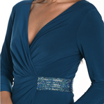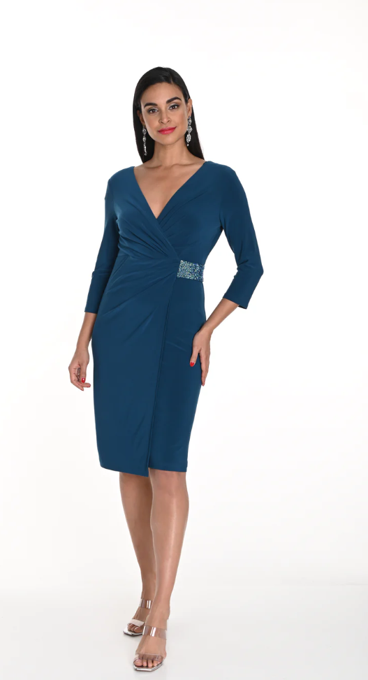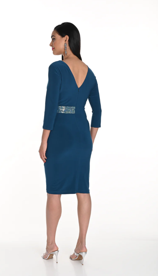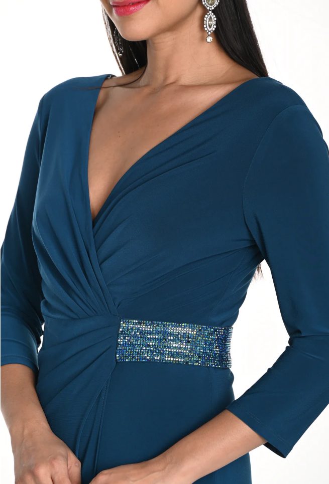 The dress features a chic V-neckline and three-quarter sleeves, offering a timeless look that transitions effortlessly from day to night. Its wrap design at the waist creates a beautiful shape, while the embellished detail adds a touch of glamour.