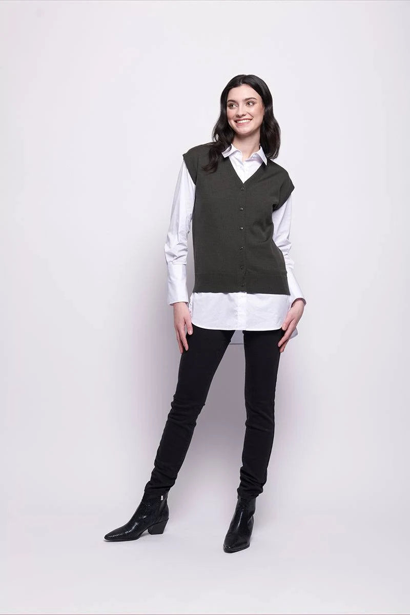 Expertly designed with a v neckline and relaxed fit, our Foil Double Agent Vest/Cardigan is the perfect addition to your wardrobe. Made with 100% fine merino knit, this button up vest offers both style and comfort. Elevate your look with this versatile and high-quality piece.