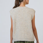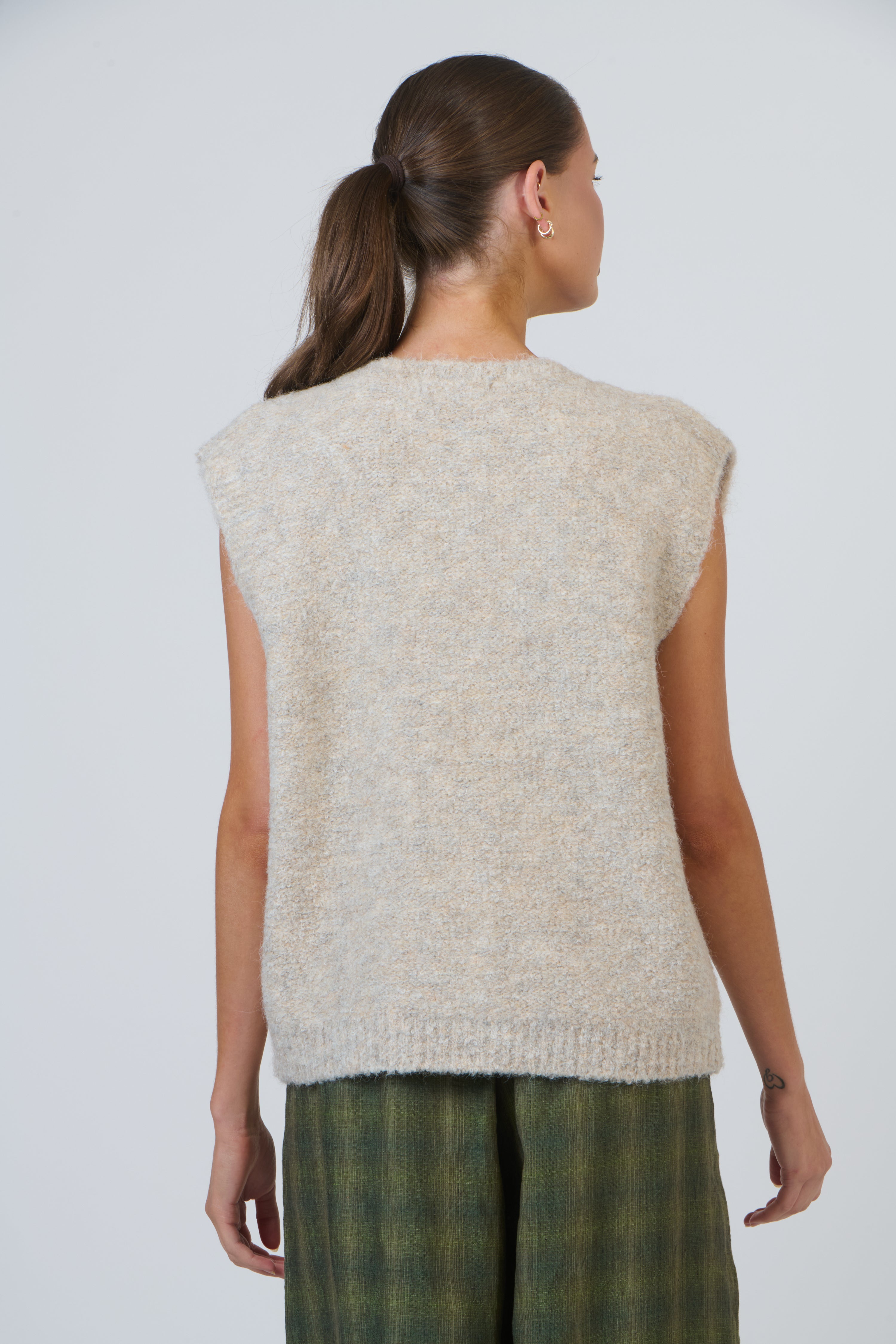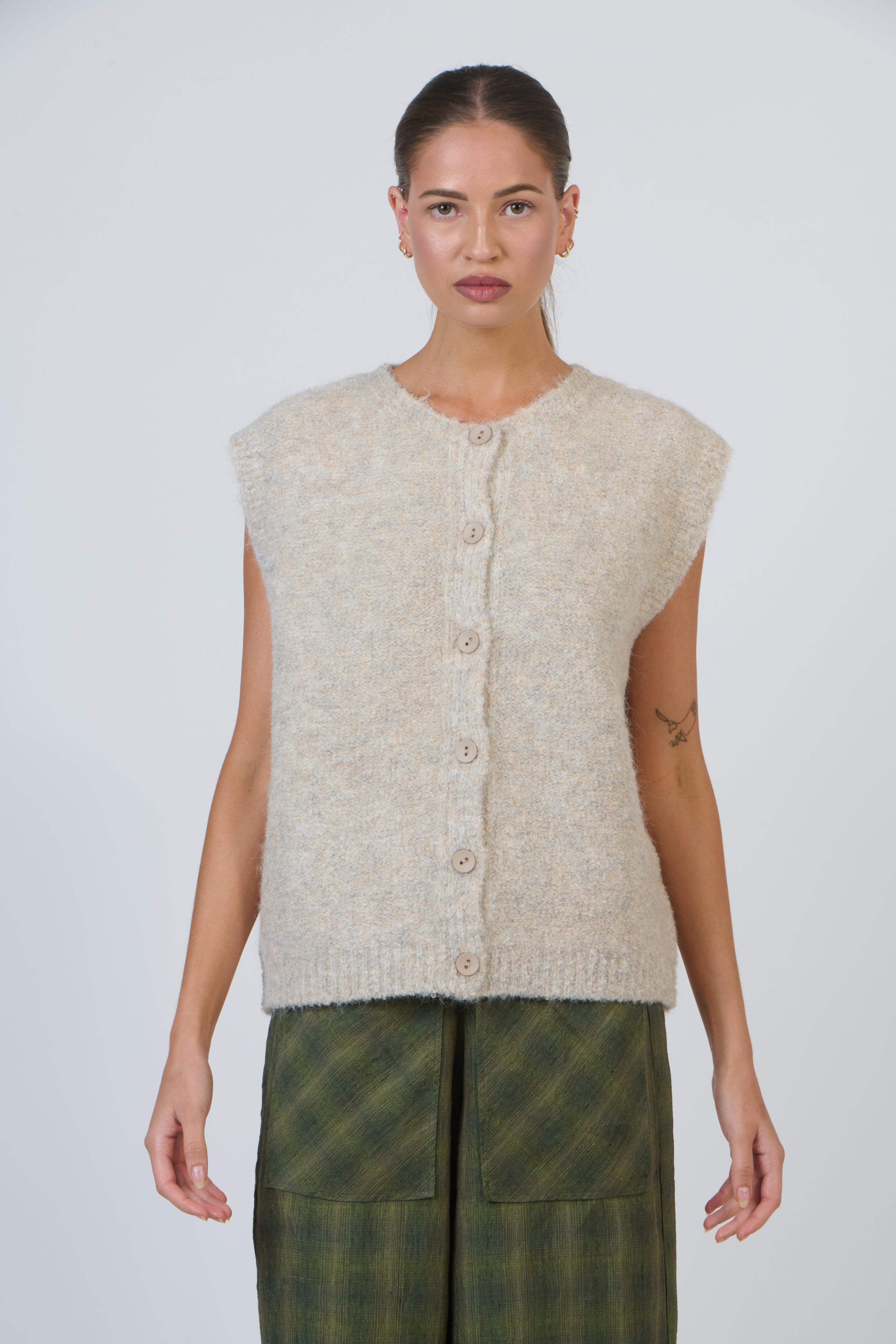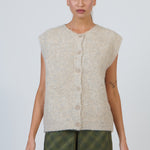 Add a touch of calm comfort to your outfit with this knit vest. Its soft, brushed finish and smooth, rib-free neckline keep the look minimalist. The extended shoulder line offers more coverage than a classic vest while staying lightweight. A subtle centre seam and tonal buttons refine the silhouette. Ideal for layering through changing seasons or building textural, modern outfits.