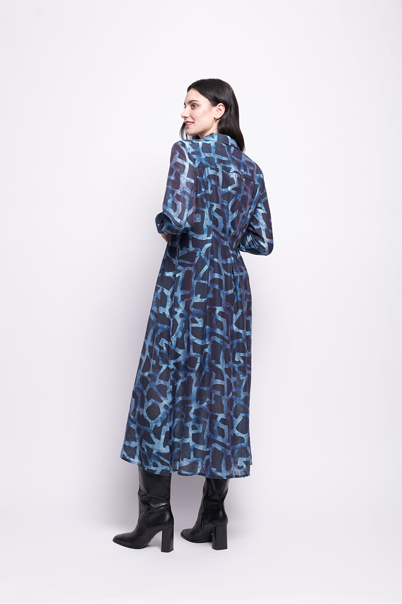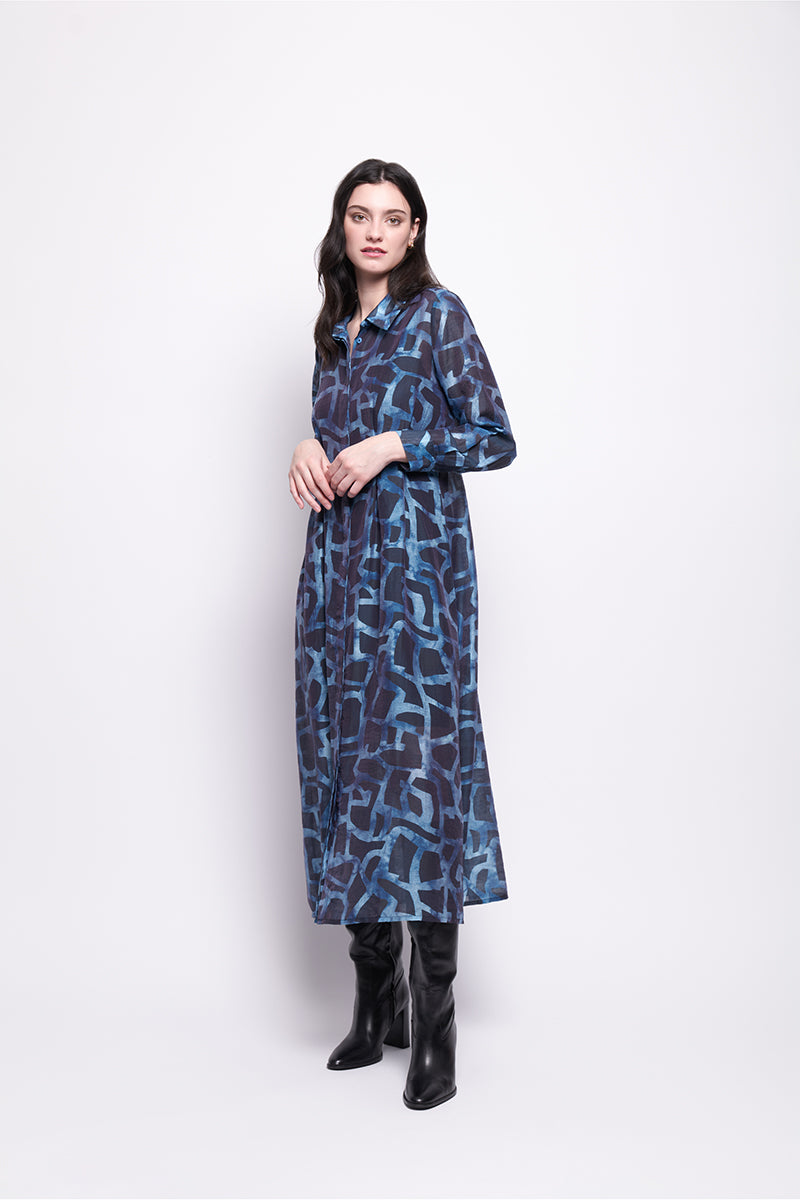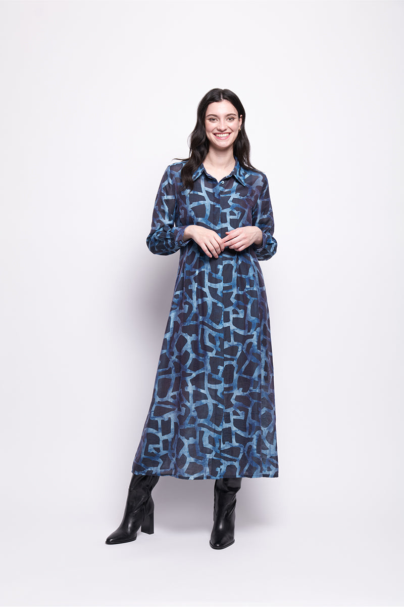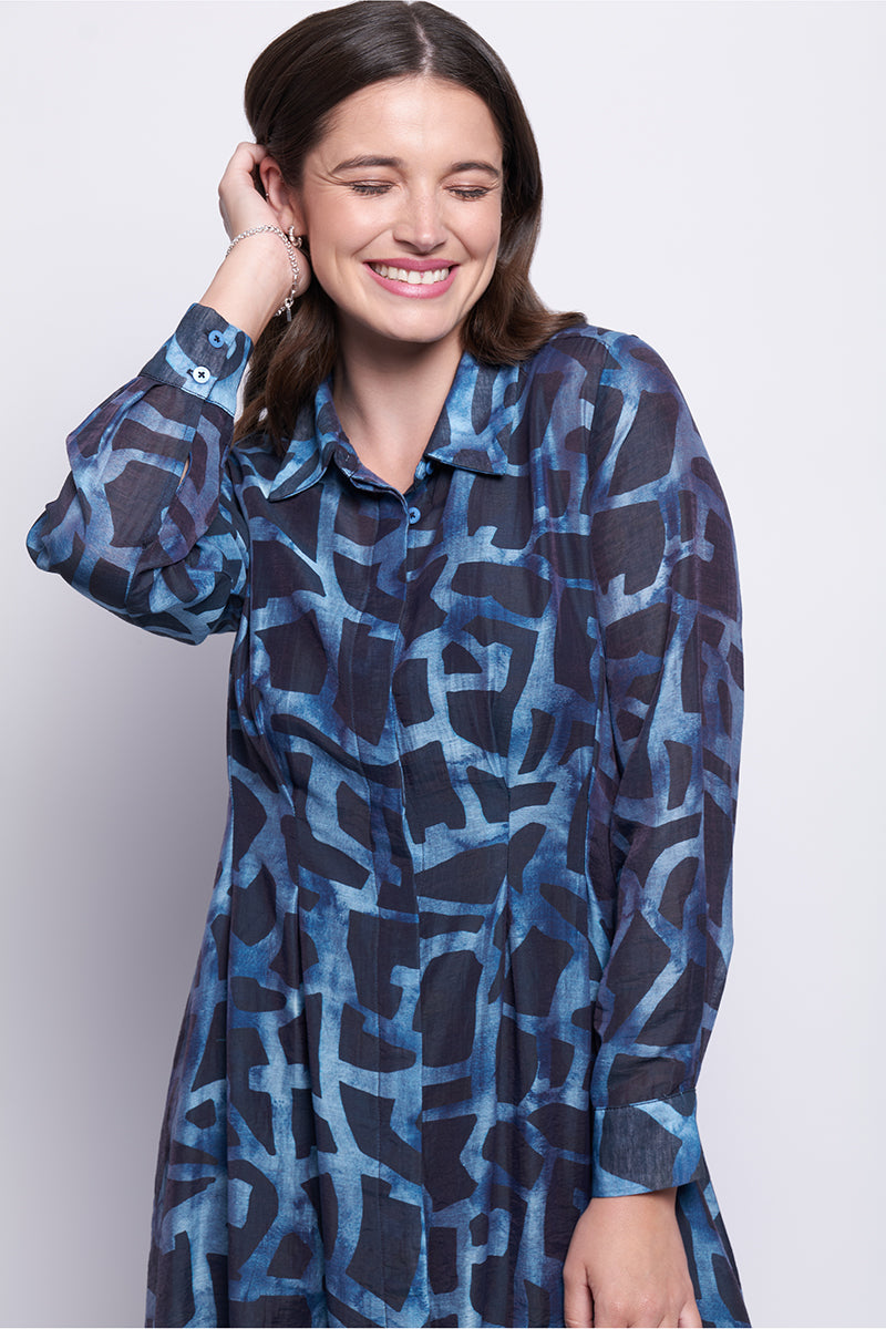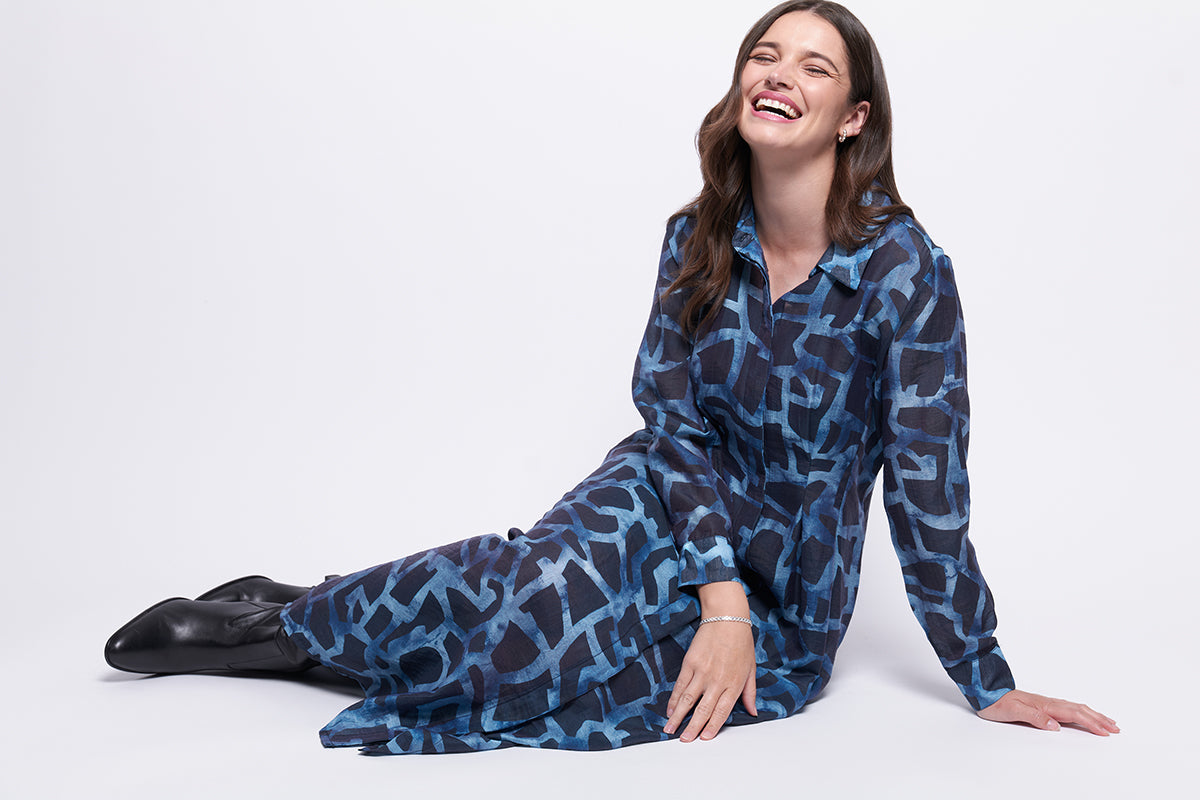 This stunning, midi-length shirt dress from NZ label, Foil is a showstopper dress that combines elegance with comfort. Featuring a fold-over collar and with an A-line, breezy skirt, along with full length sleeves, this dress is perfect for any occasion. A full length placket hides the buttons creating a streamlined look.. Get ready to turn heads in this playful and stylish dress.