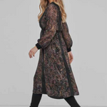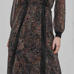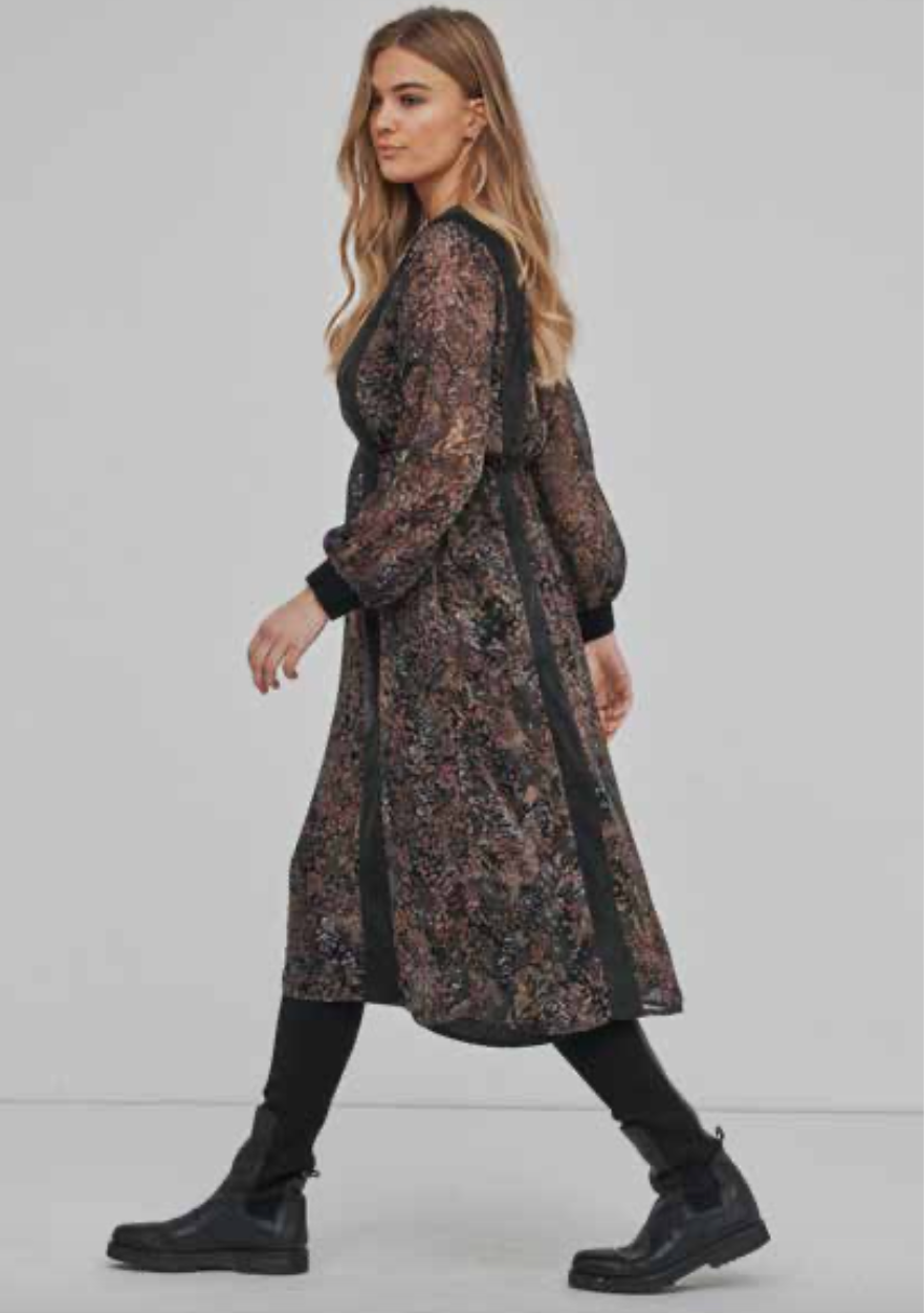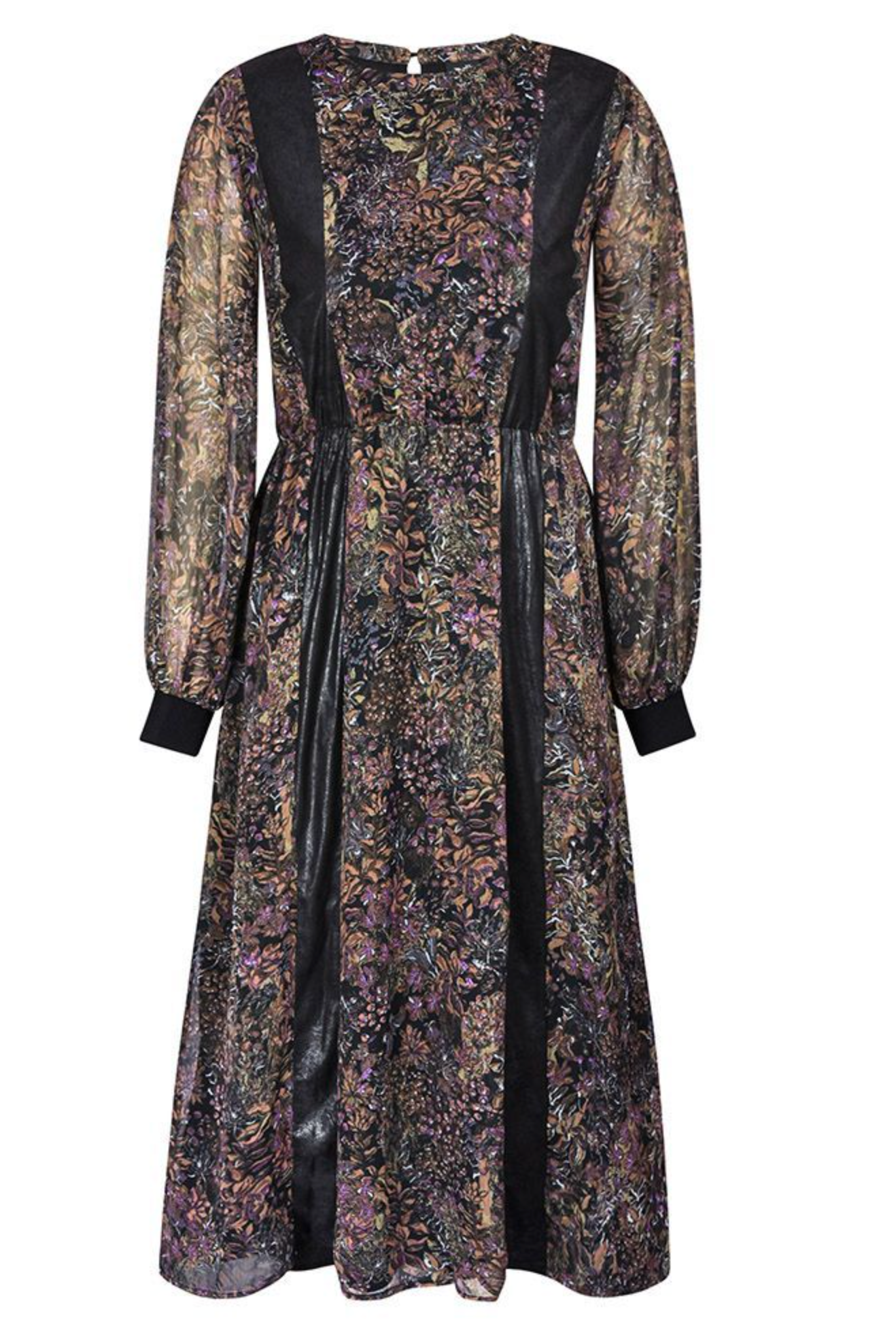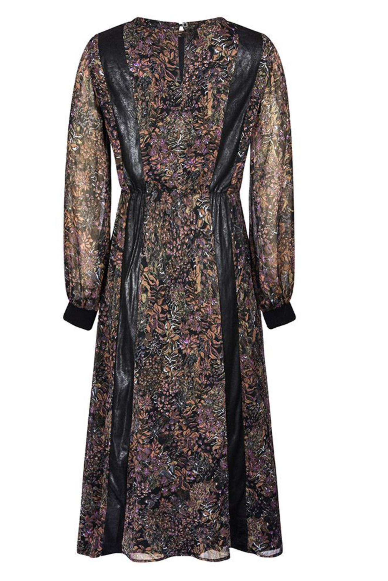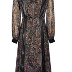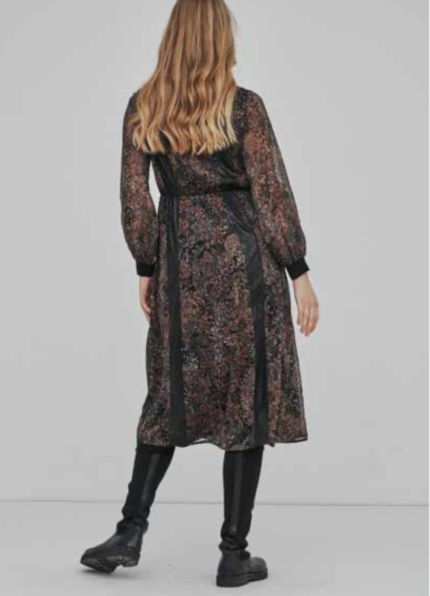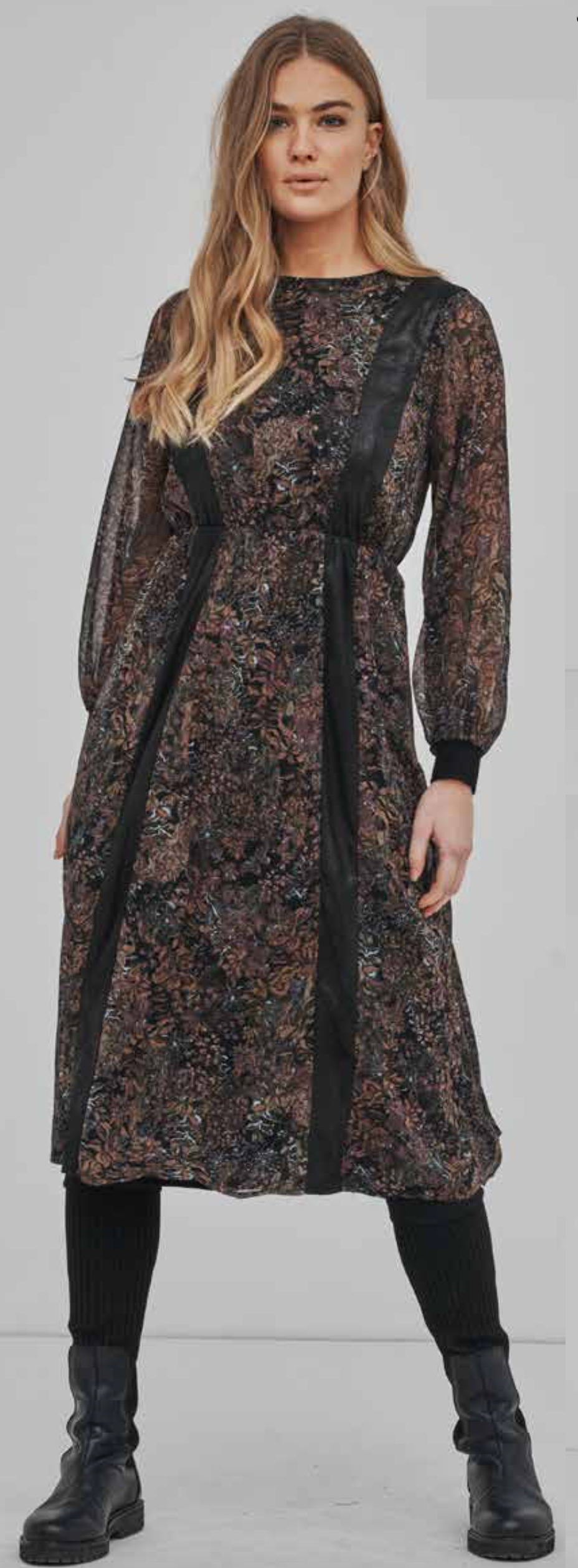 RECYCLED* Designed in the most beautiful pattern with a coated suede trim panels  also featured on the back, and light, sheer sleeves with a elastic wide band. The soft flowing fabric creates movement in this patterned dress. Style your dress with a denim jacket and boots for daytime or a pair of heels for nighttime and you have  two feminine but edgy looks.