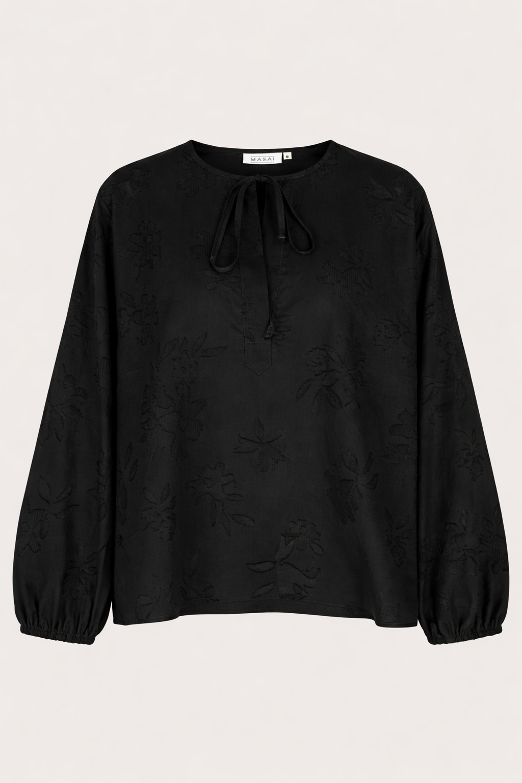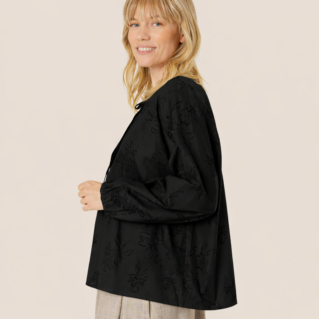 Sometimes a floral design just hits the spot - like the subtle burnout floral design on this black top. The top features several feminine and luxurious details: It is designed with a slit at the neck with a tie, long sleeves with puff effect and a satin ribbon binding. A delicate and feminine top that goes with everything you choose to style it with.