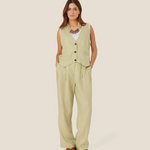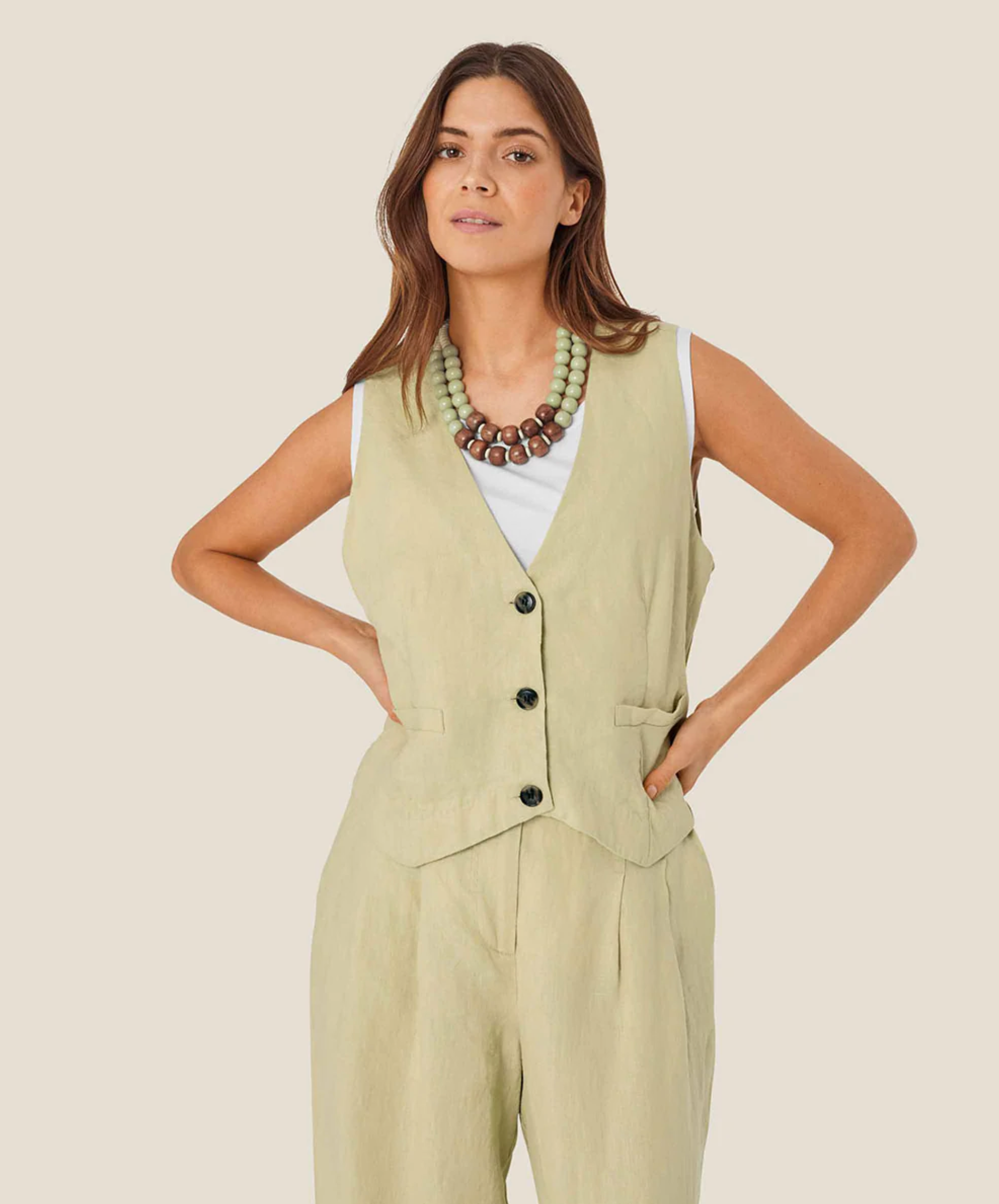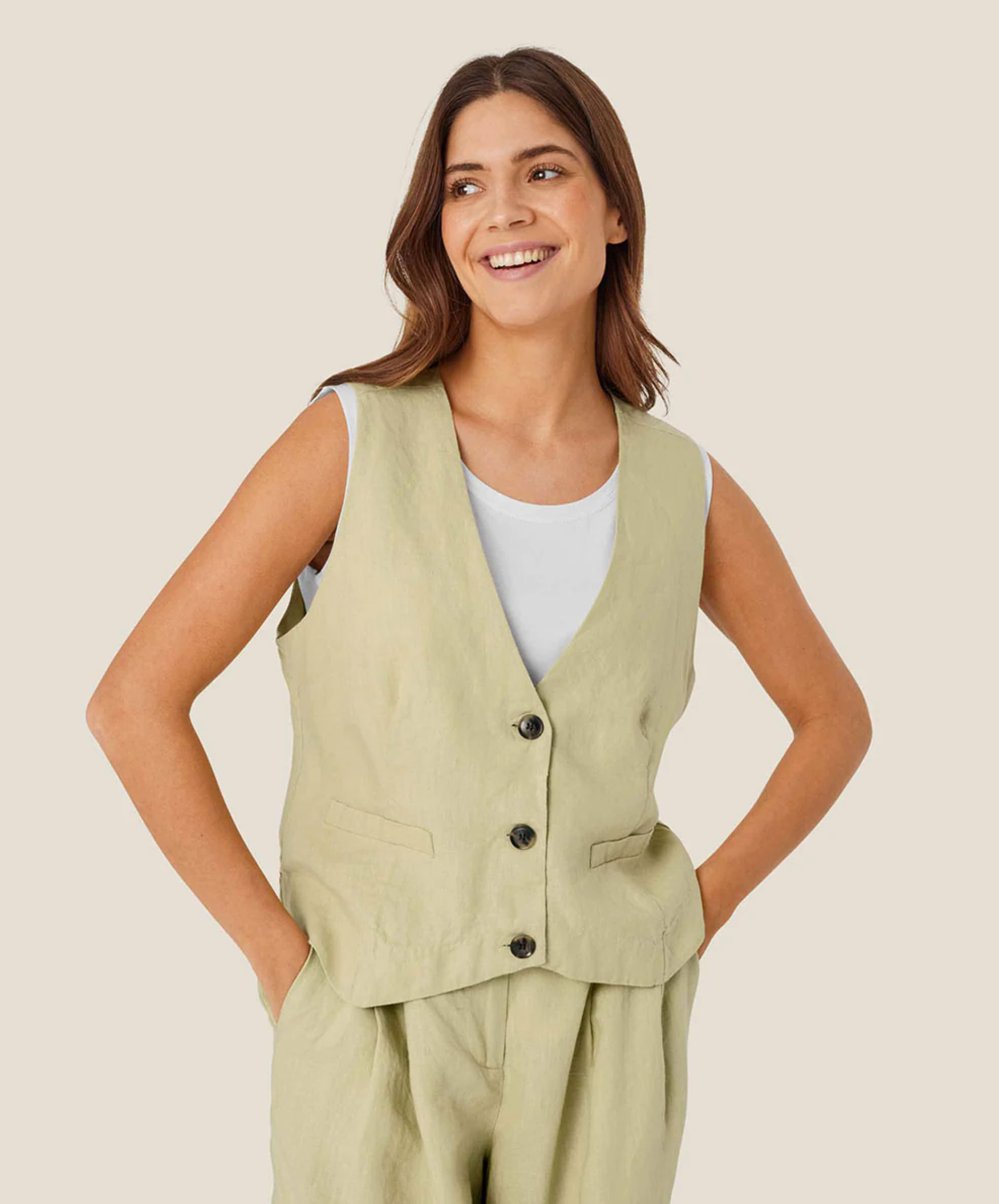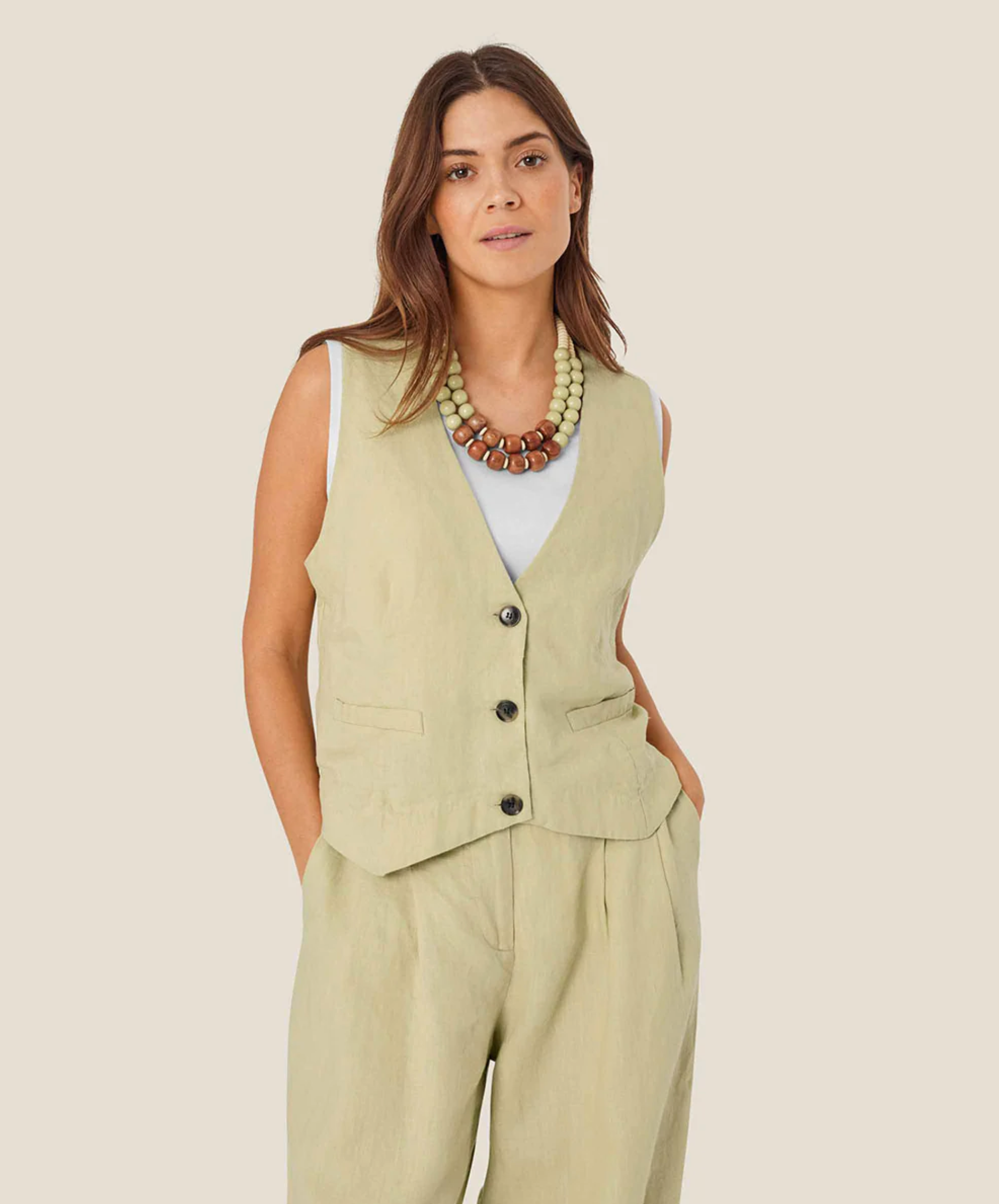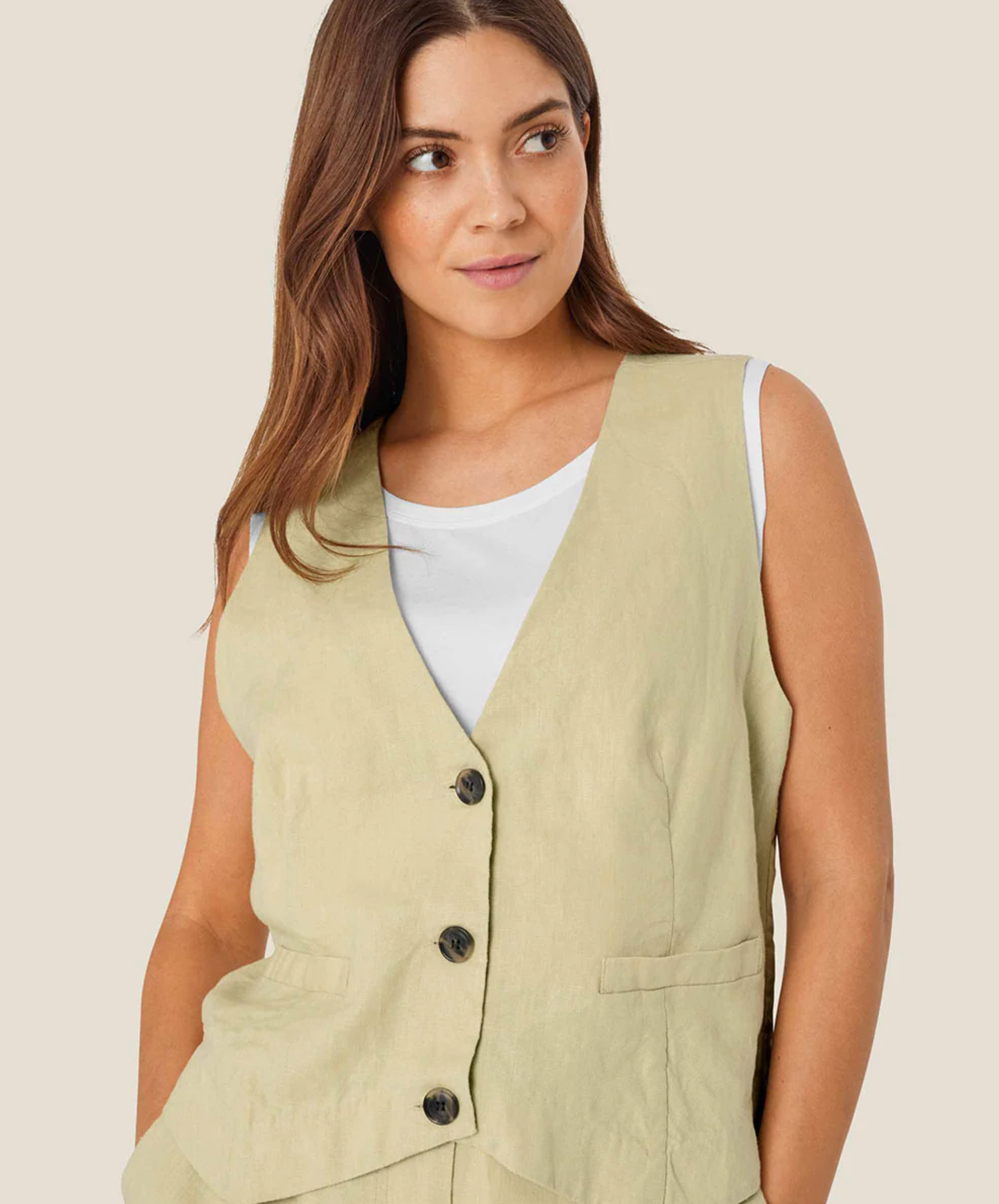 Add some flair to your outfit with the Jordyn Linen Vest. This waistcoat features a classic V-neck and three-button closure, perfect for layering over your favourite tops. Whether you're heading to an event or simply want to elevate your everyday look, the Jordyn Linen Vest is a stylish and versatile choice.