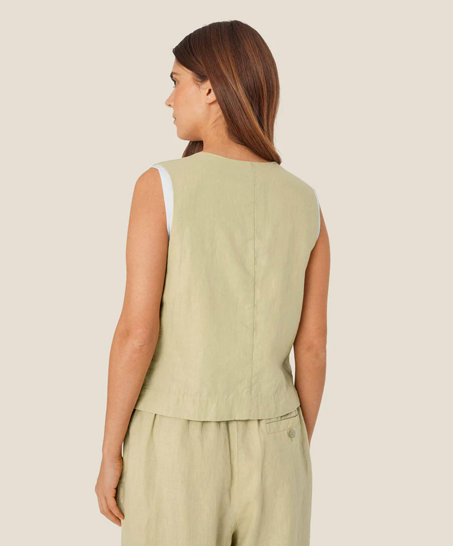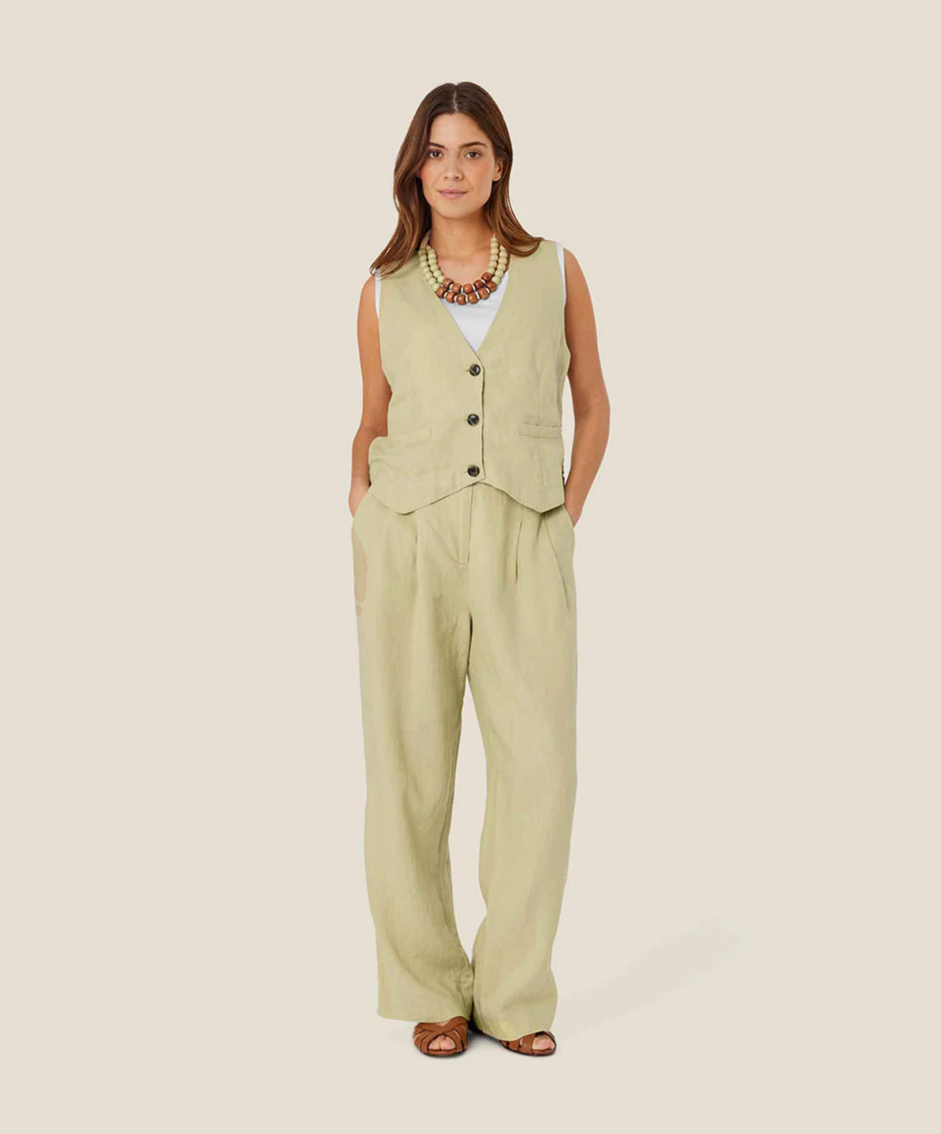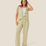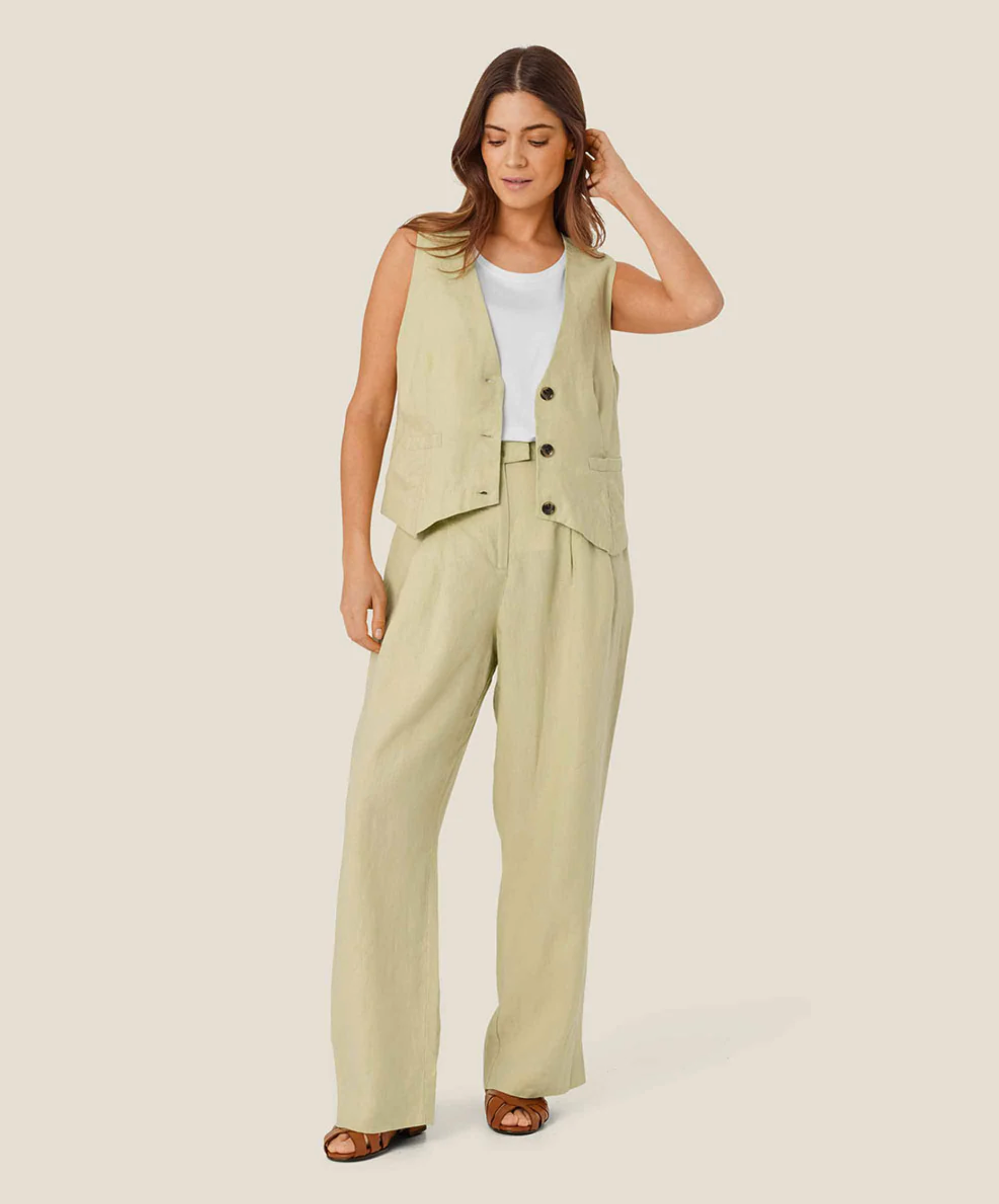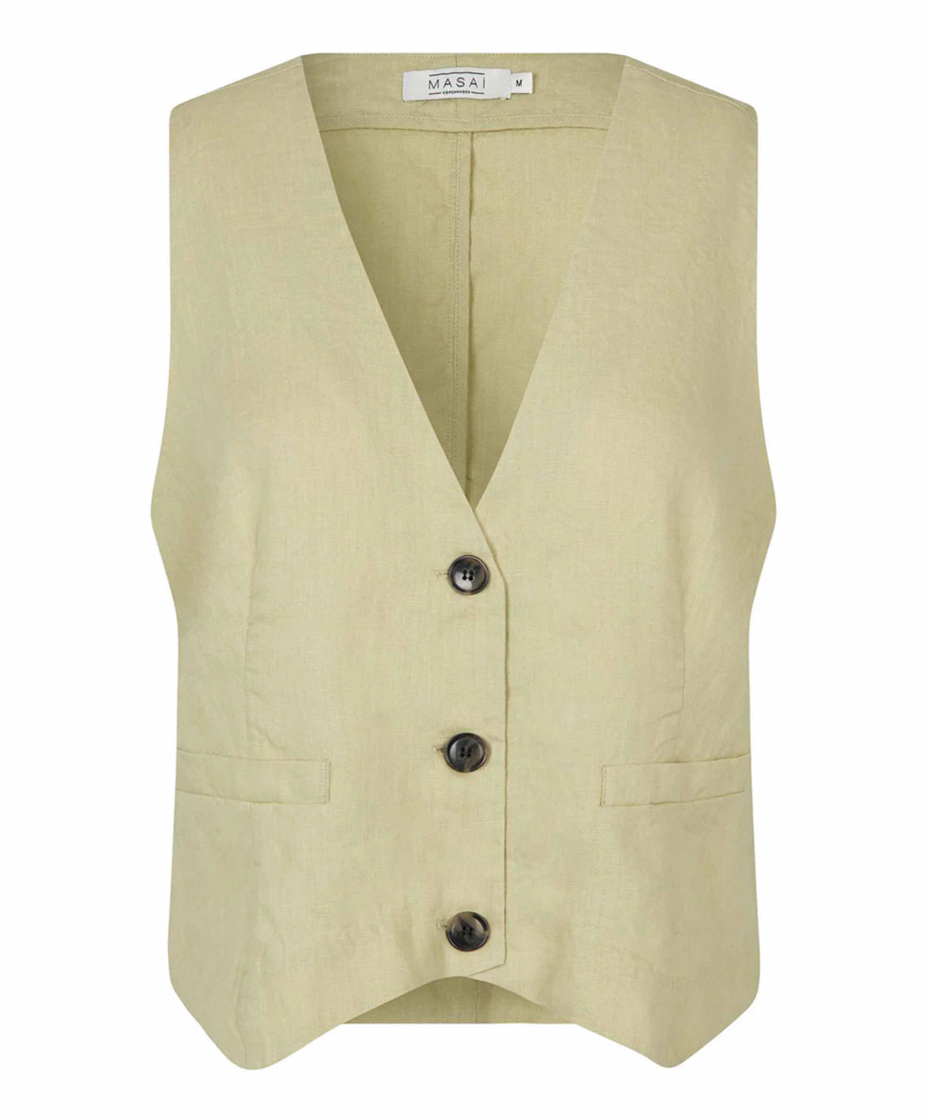 Add some flair to your outfit with the Jordyn Linen Vest. This waistcoat features a classic V-neck and three-button closure, perfect for layering over your favourite tops. Whether you're heading to an event or simply want to elevate your everyday look, the Jordyn Linen Vest is a stylish and versatile choice.