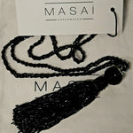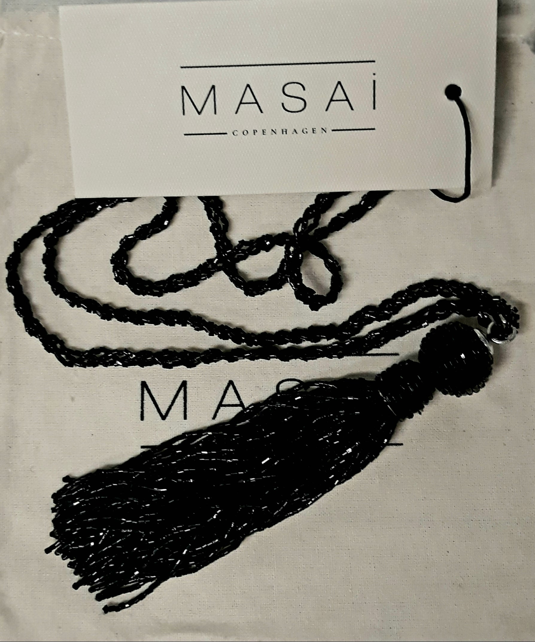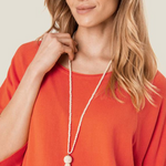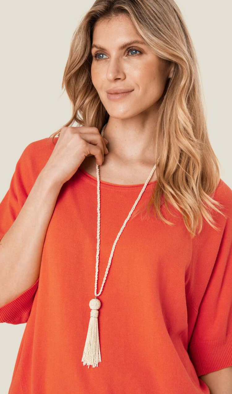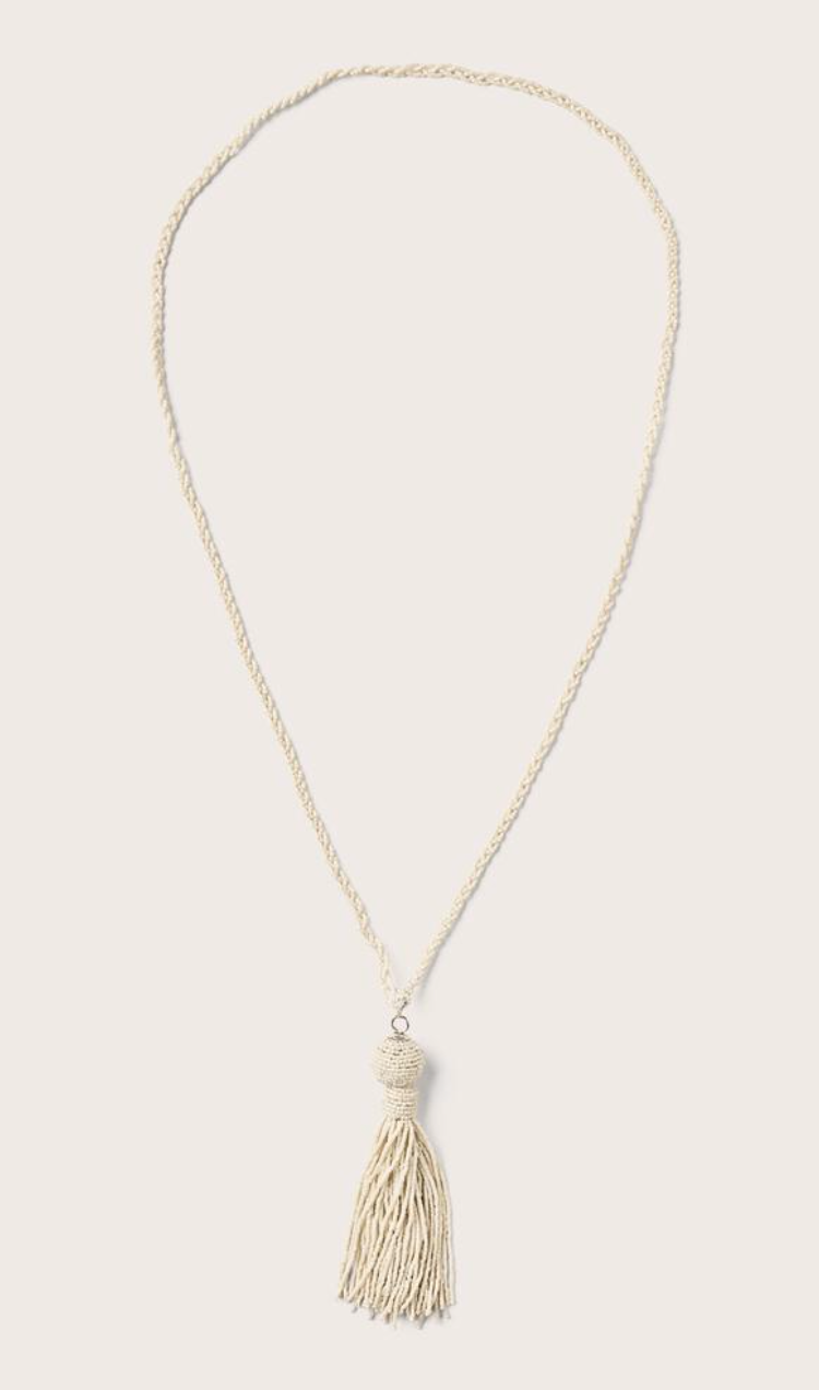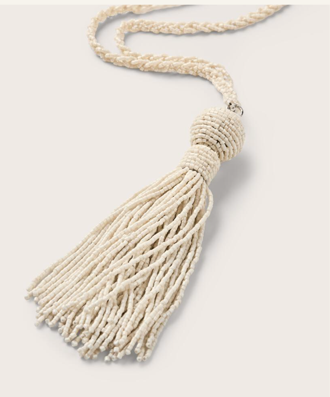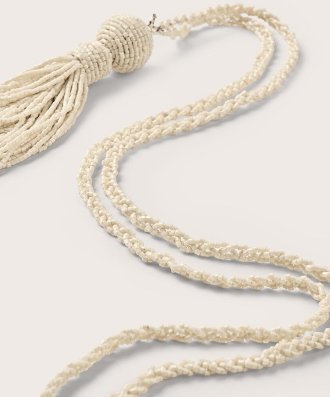 Add a little bohemian detail to your look with this long necklace. It consists of a braided chain of small cream coloured glass beads with a delicate tassel at the bottom. Wear the necklace with everything from a simple plain top to a vibrant patterned dress.