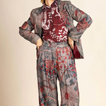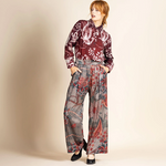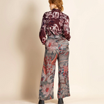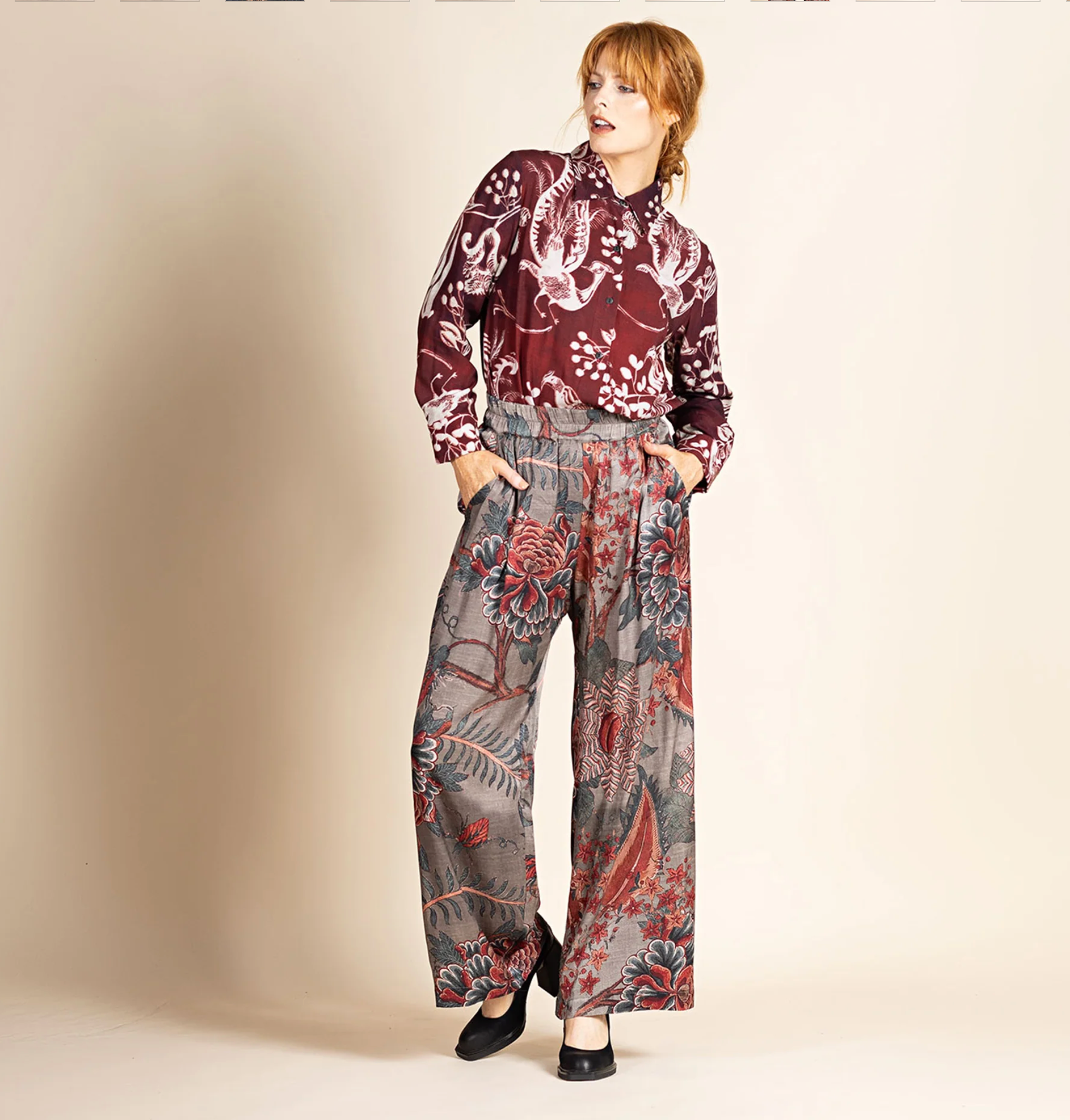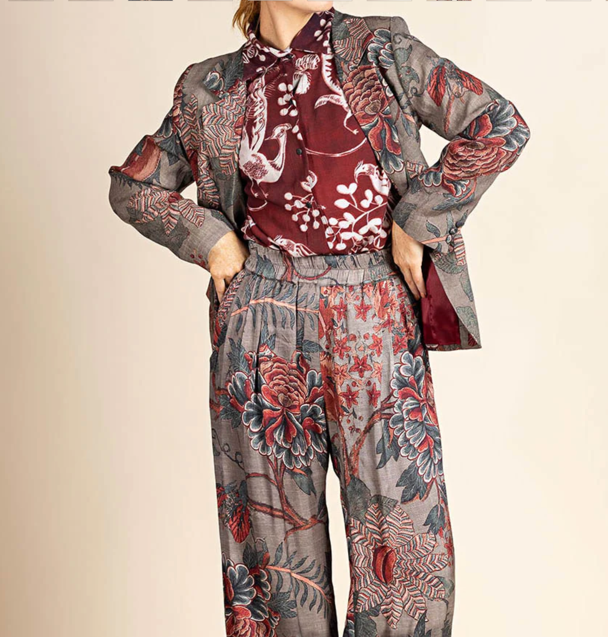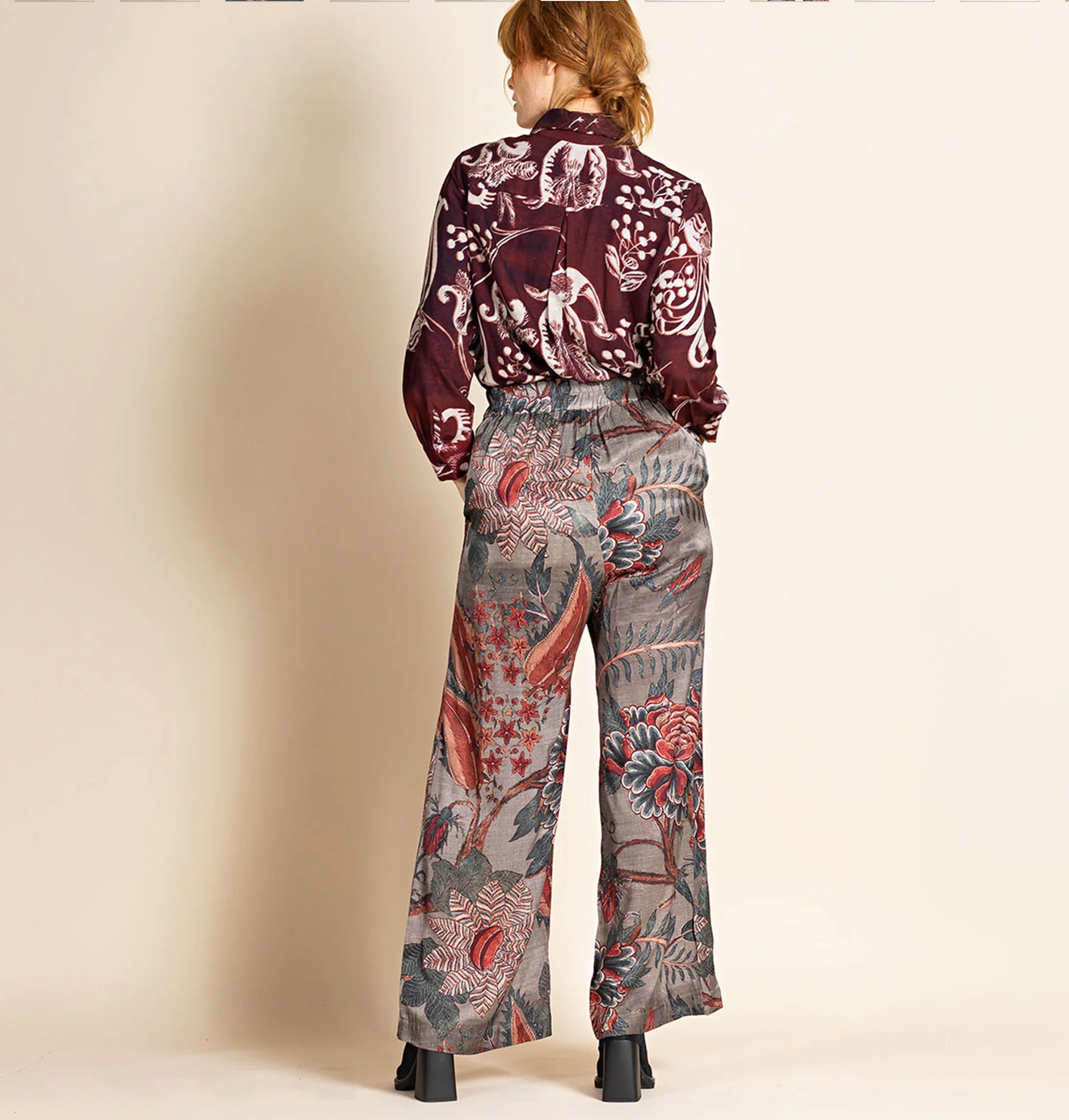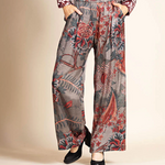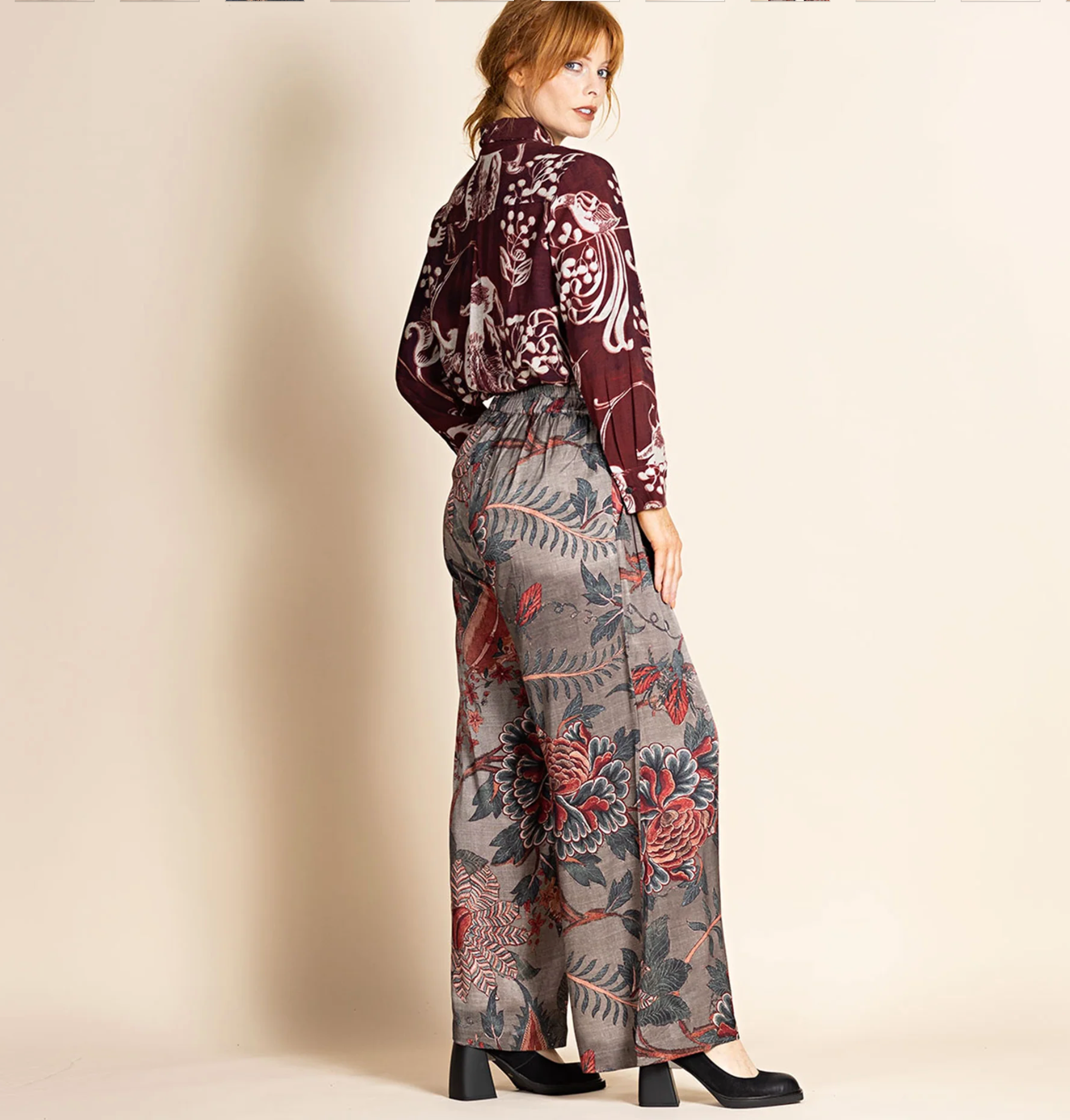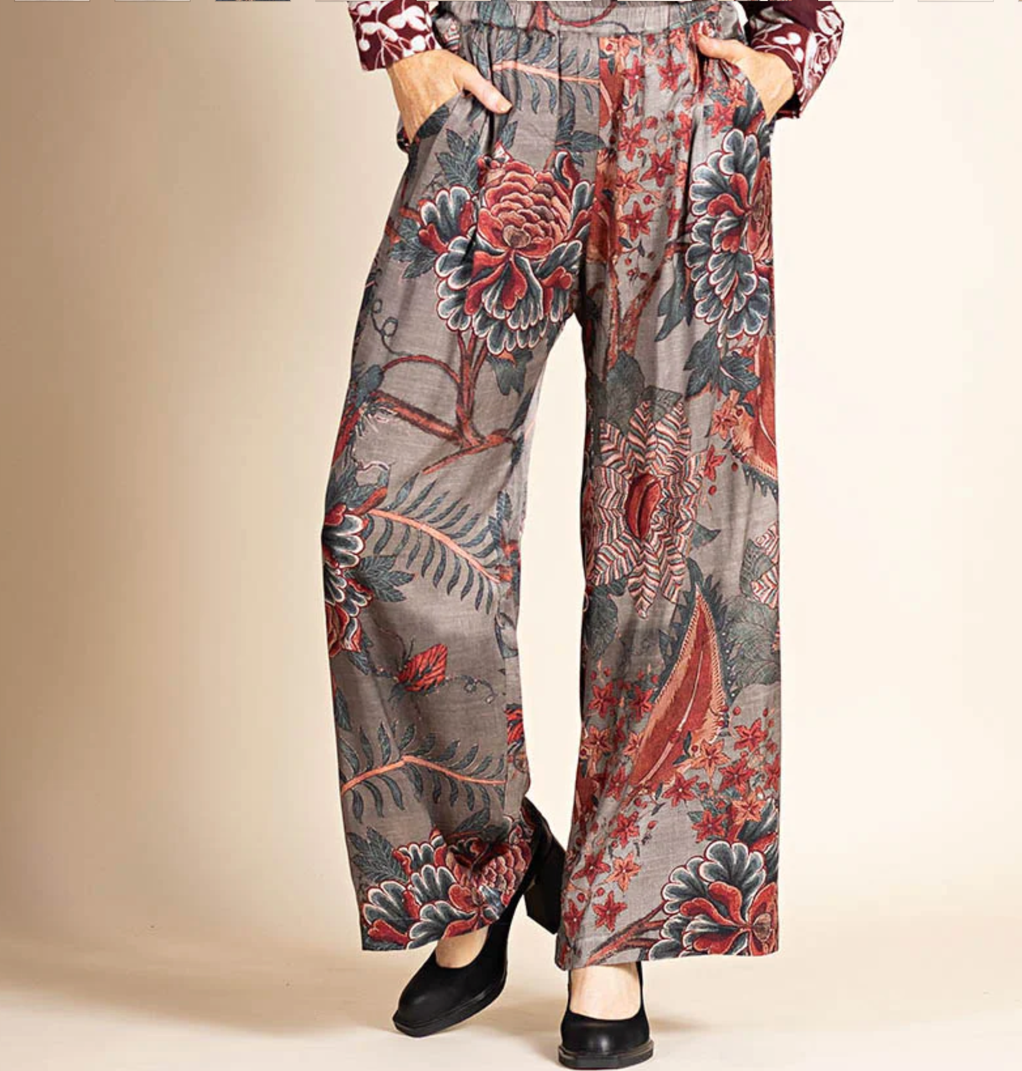 The eden loose wide leg pant is made from twill rayon that provides the perfect drape. The pant cascades from pleats at the elastic gathered waist in a very feminine way giving you a long wide leg. The fabric has been printed with Megan's original print, Eden. It has a beautiful satin-like luster and everyone who tries these pants on say how amazingly comfortable the fit is.