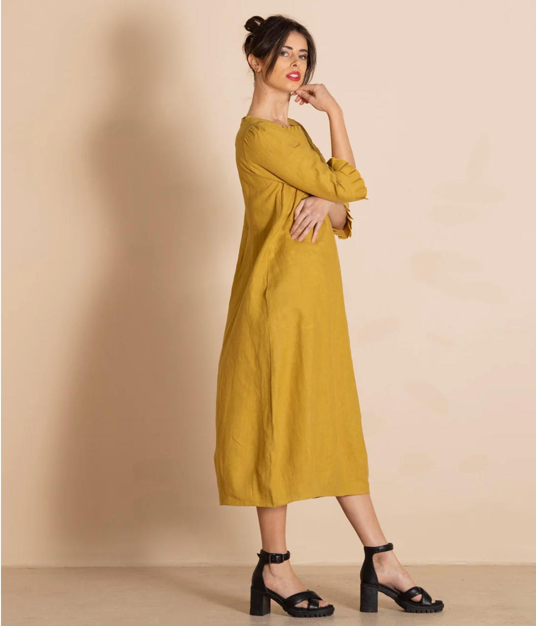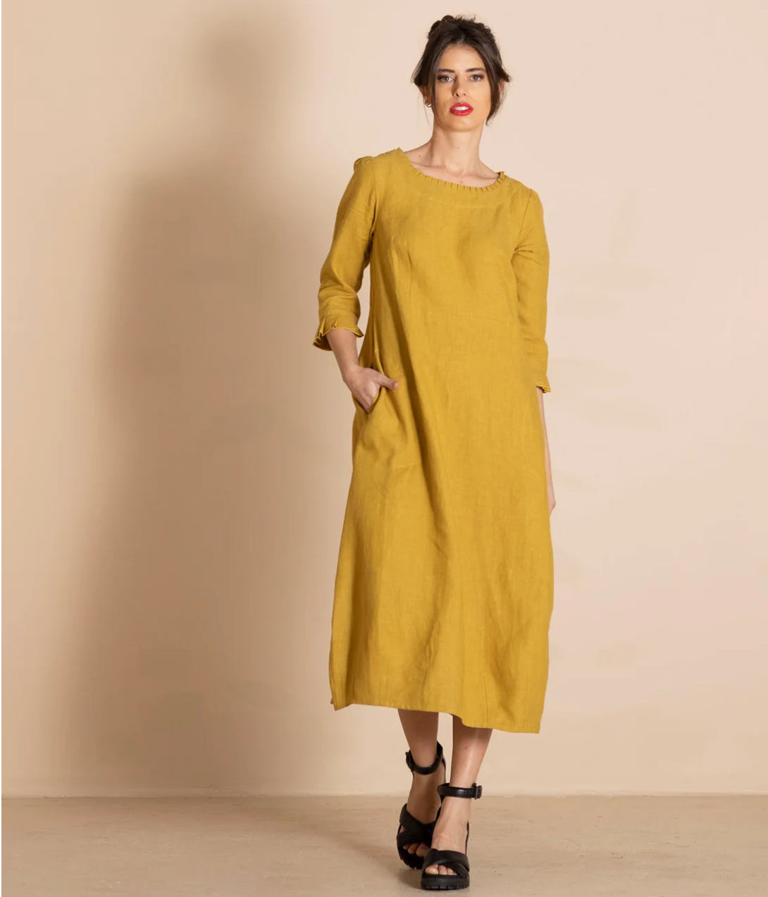 Crafted from 100% linen, the Megan Salmon Lulu Pleat Romance Dress offers timeless elegance with functional design. Featuring classic pockets, delicate pleat trim, and a flattering round neckline, it combines style with comfort. The 3/4 sleeves also with the pleat trim provide versatile coverage, while the centre back zip ensures a tailored fit. Perfect for those seeking an effortlessly sophisticated addition to their wardrobe.