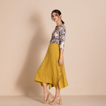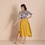 The twill hanky skirt is a low-waisted skirt with an A-line shape and handkerchief hemline that has a 25cm split on each side.