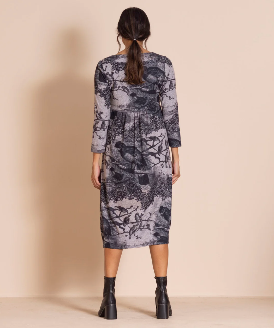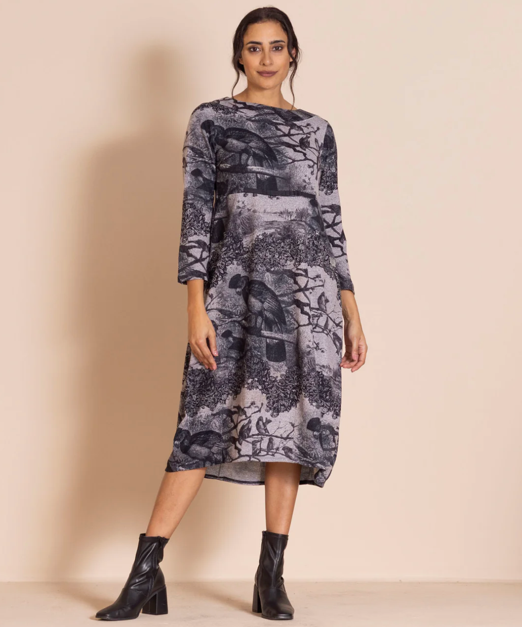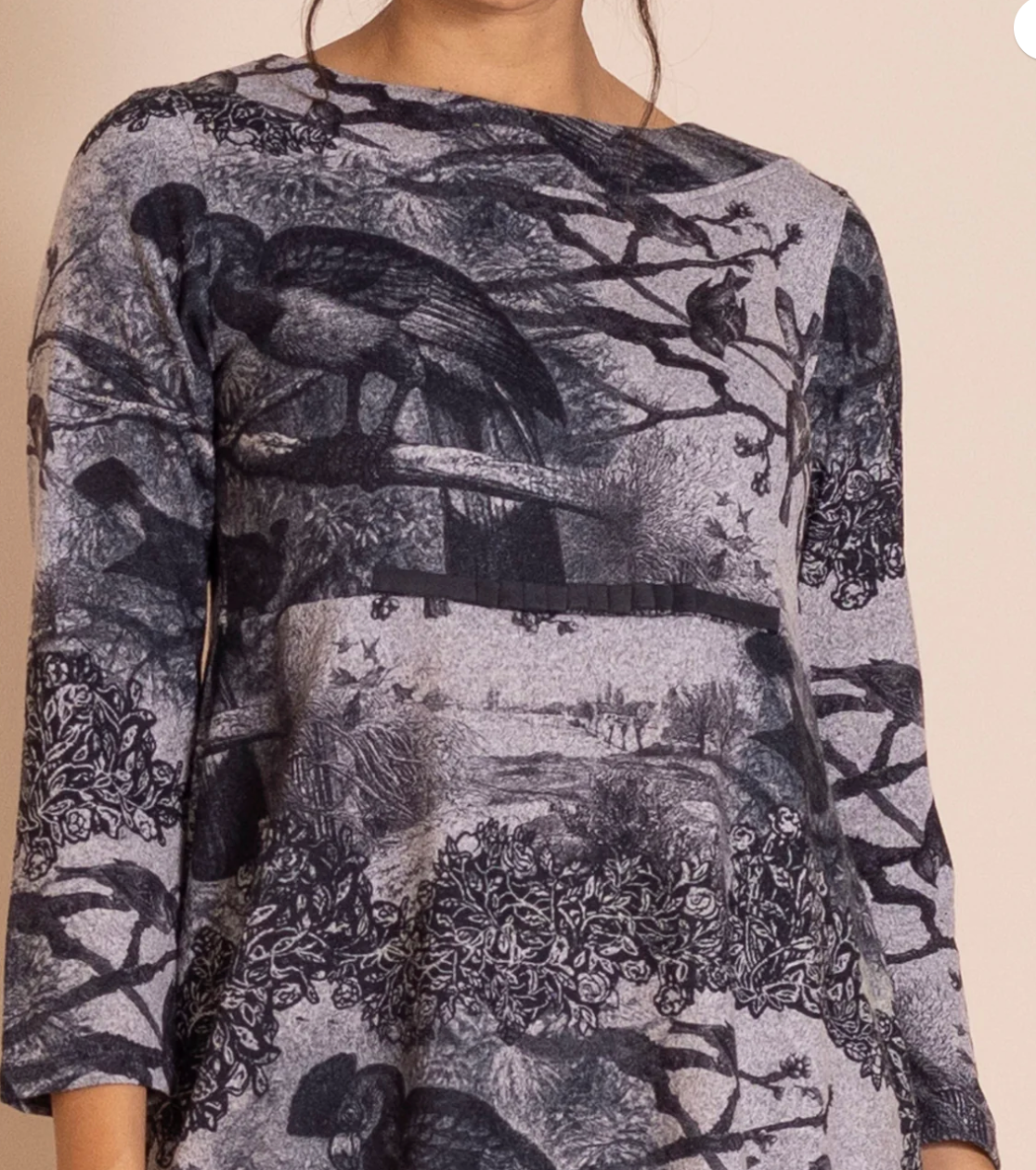 A perennial favorite, Romance Dress is crafted for winter in soft, warm trans-seasonal jersey, showcasing an intriguing original layered print. With a flattering empire-line silhouette, signature pleated ribbon detail, and bell-shaped hem, it offers effortless elegance for any occasion.