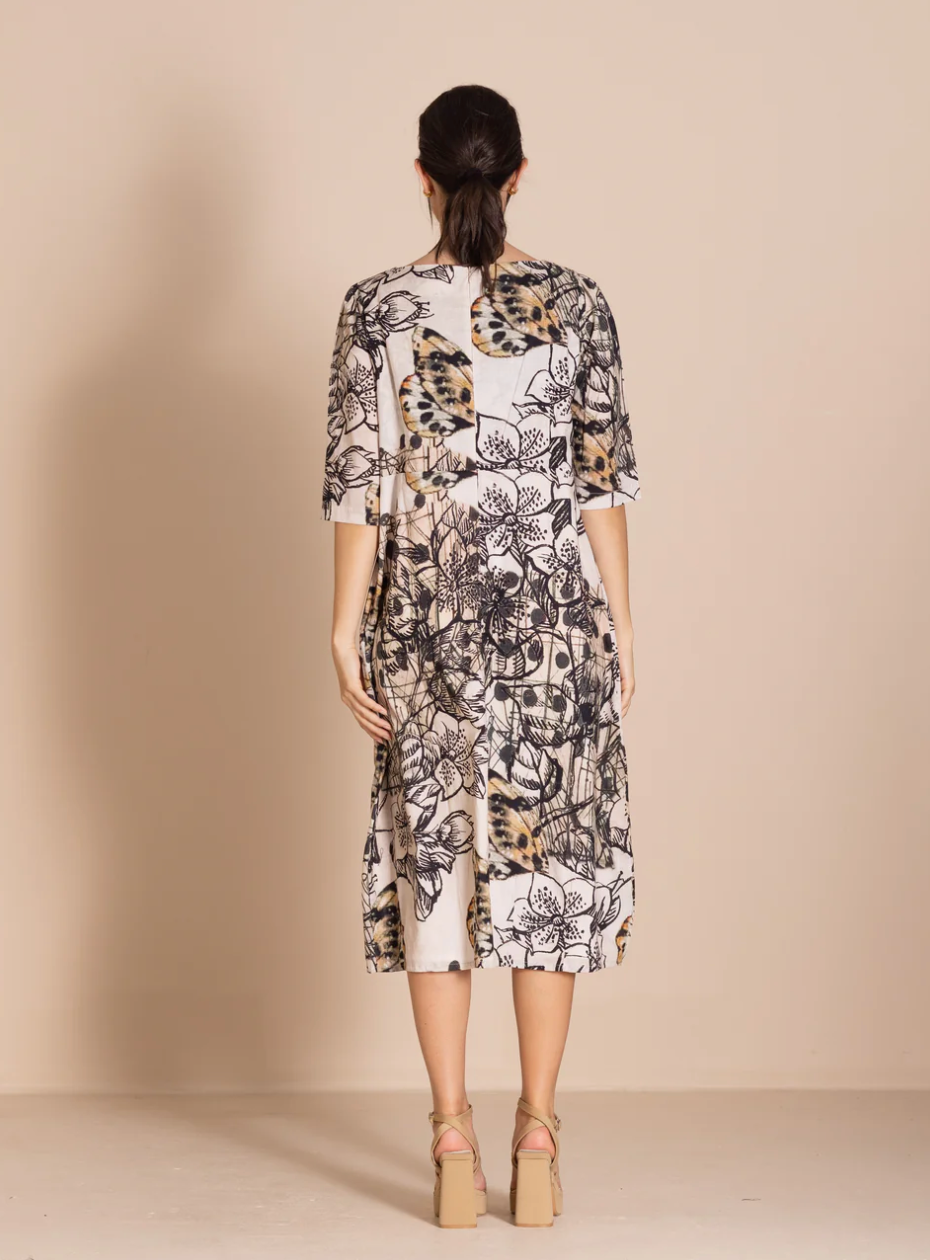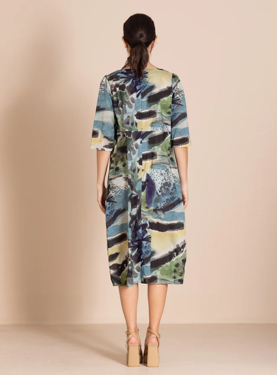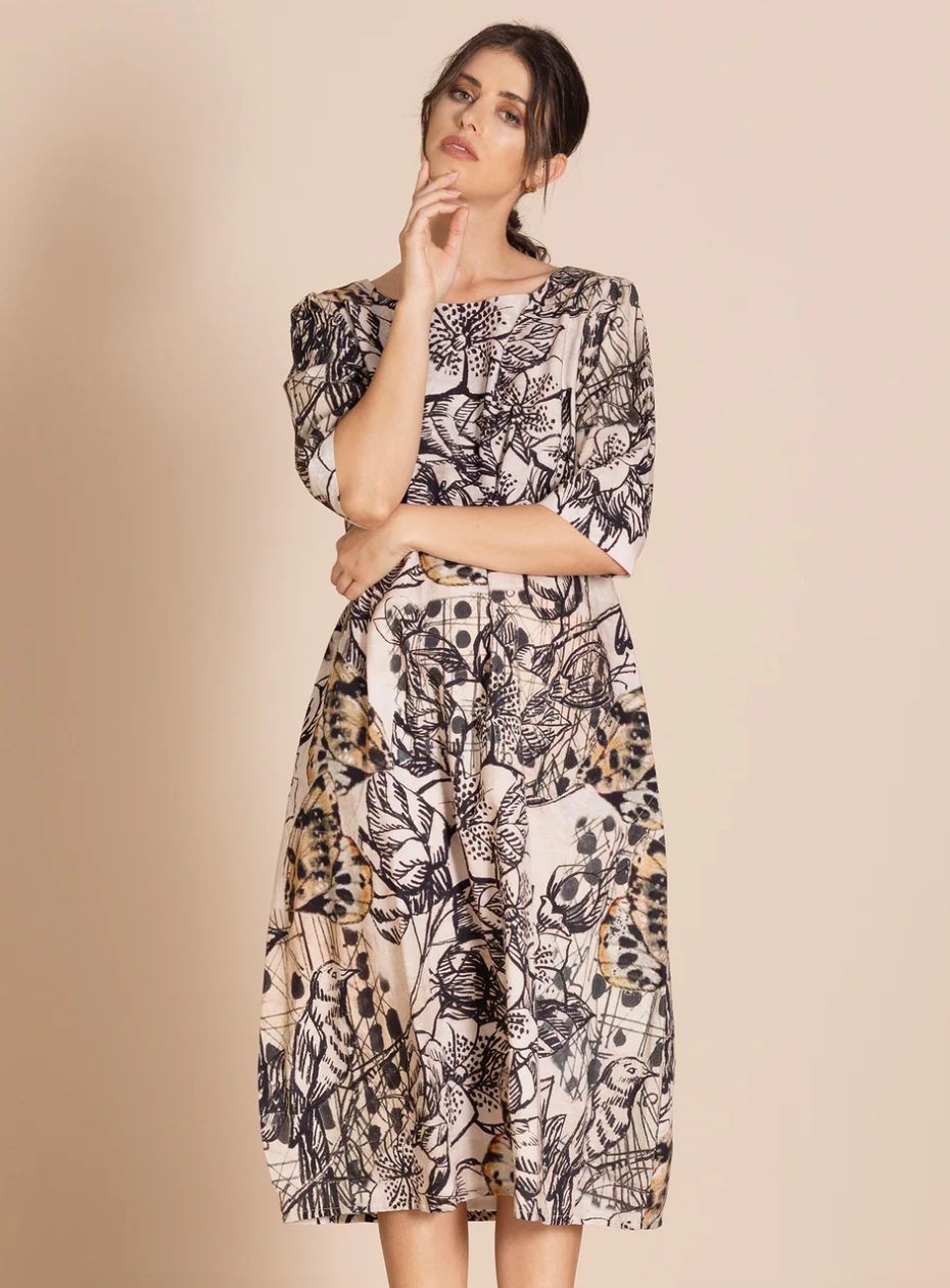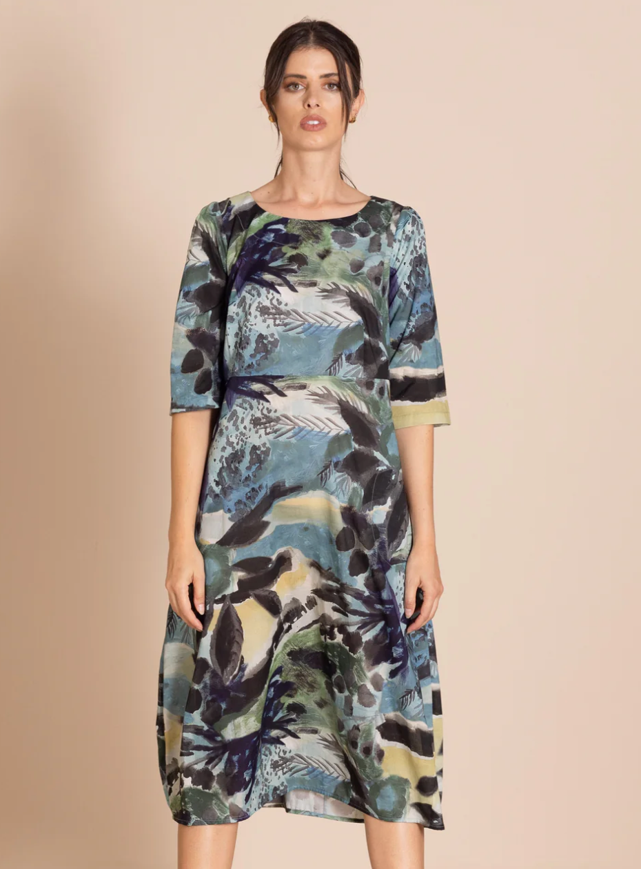 The bestselling romance style is beautifully re-imagined in these striking original Megan Salmon prints. Crafted from cotton with elegant three-quarter sleeves, this dress is both flattering and versatile. It features a high waist and our signature bell hem, expertly shaped by cleverly placed darts.