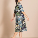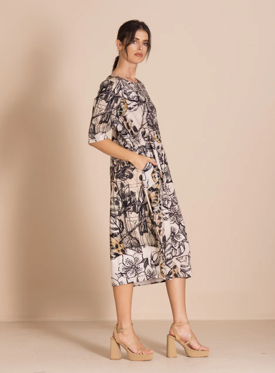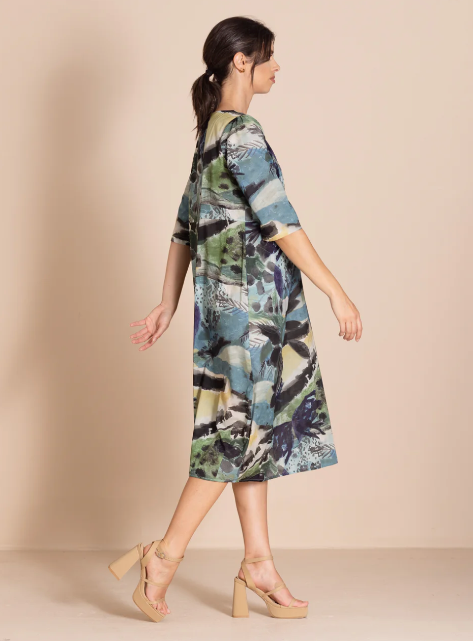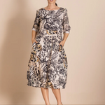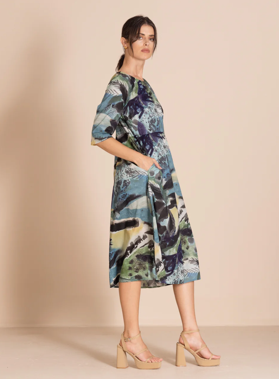 The bestselling romance style is beautifully re-imagined in these striking original Megan Salmon prints. Crafted from cotton with elegant three-quarter sleeves, this dress is both flattering and versatile. It features a high waist and our signature bell hem, expertly shaped by cleverly placed darts.