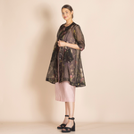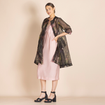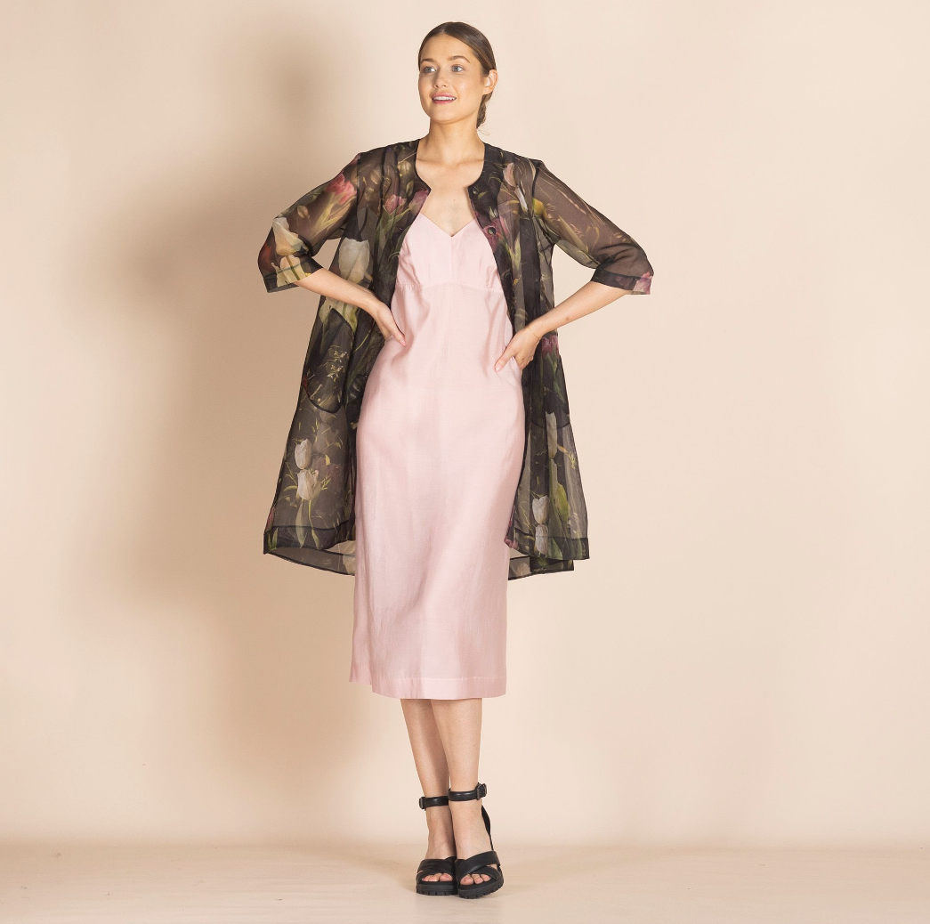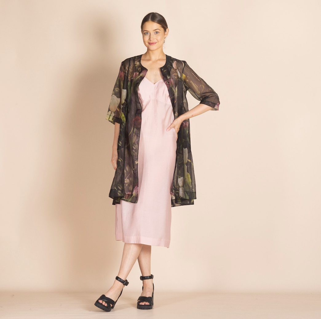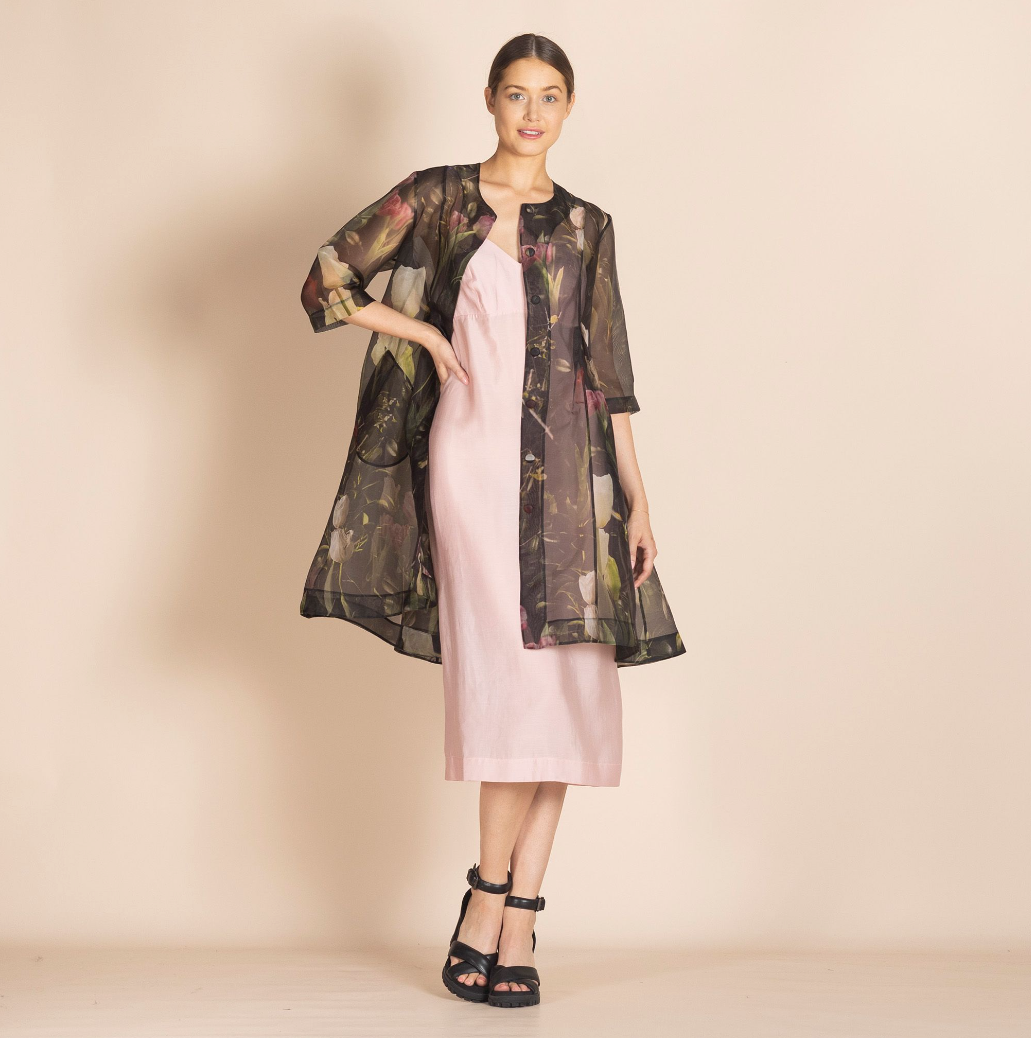 The ultimate feminine layer, the organza Tulip Giselle coat is dress coat in length, with front inverted pleats under the bust for shape, self covered buttons up the front for flexibility and ¾ sleeves for cover which makes this a flattering piece on every form. A beautiful occasion suit aired with the Tulips Shift Dress.