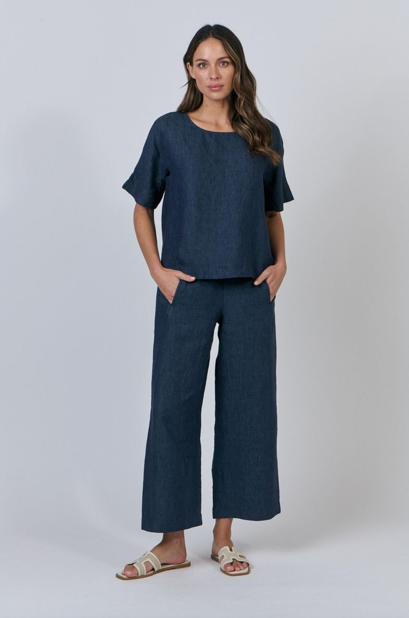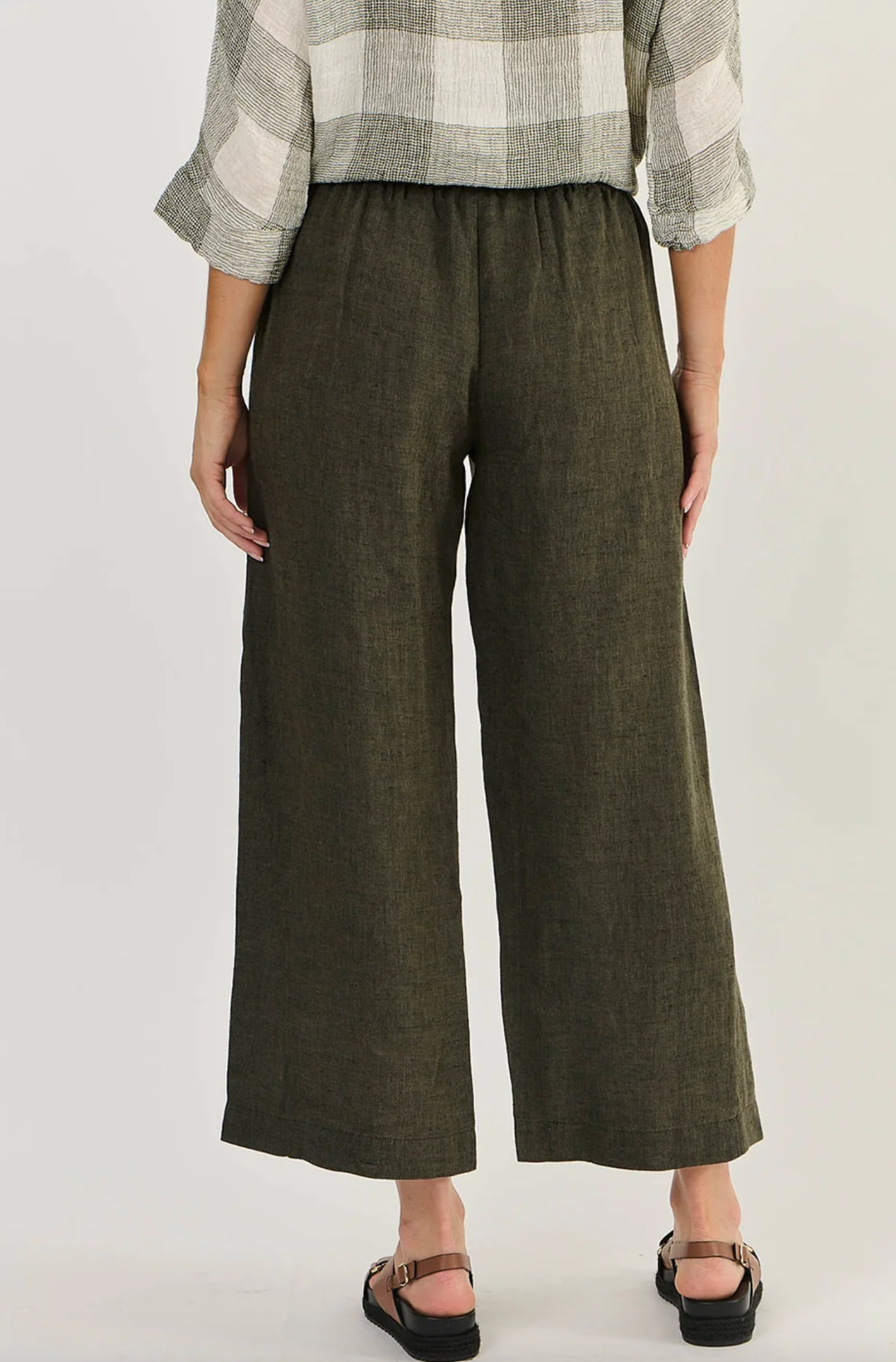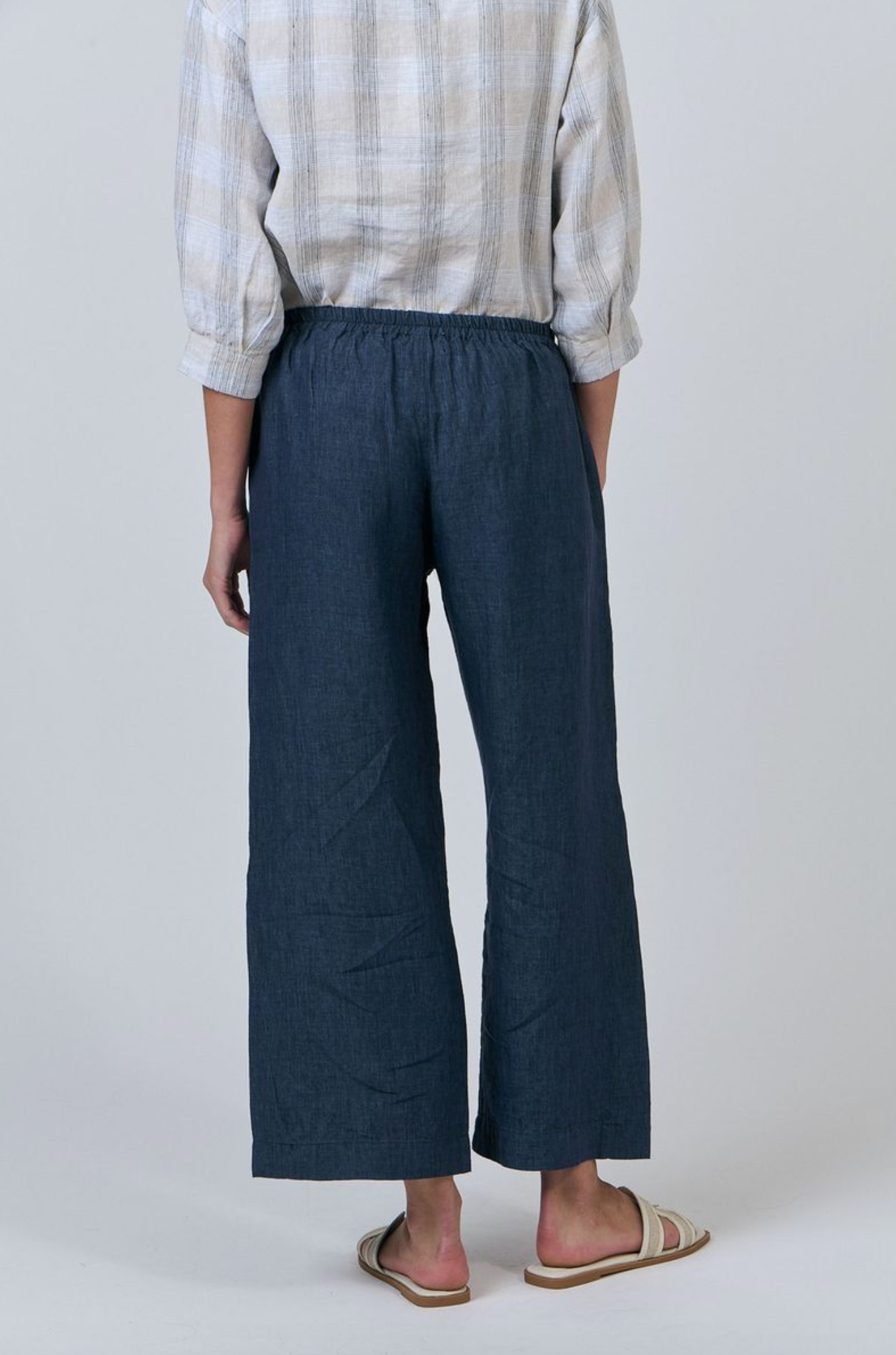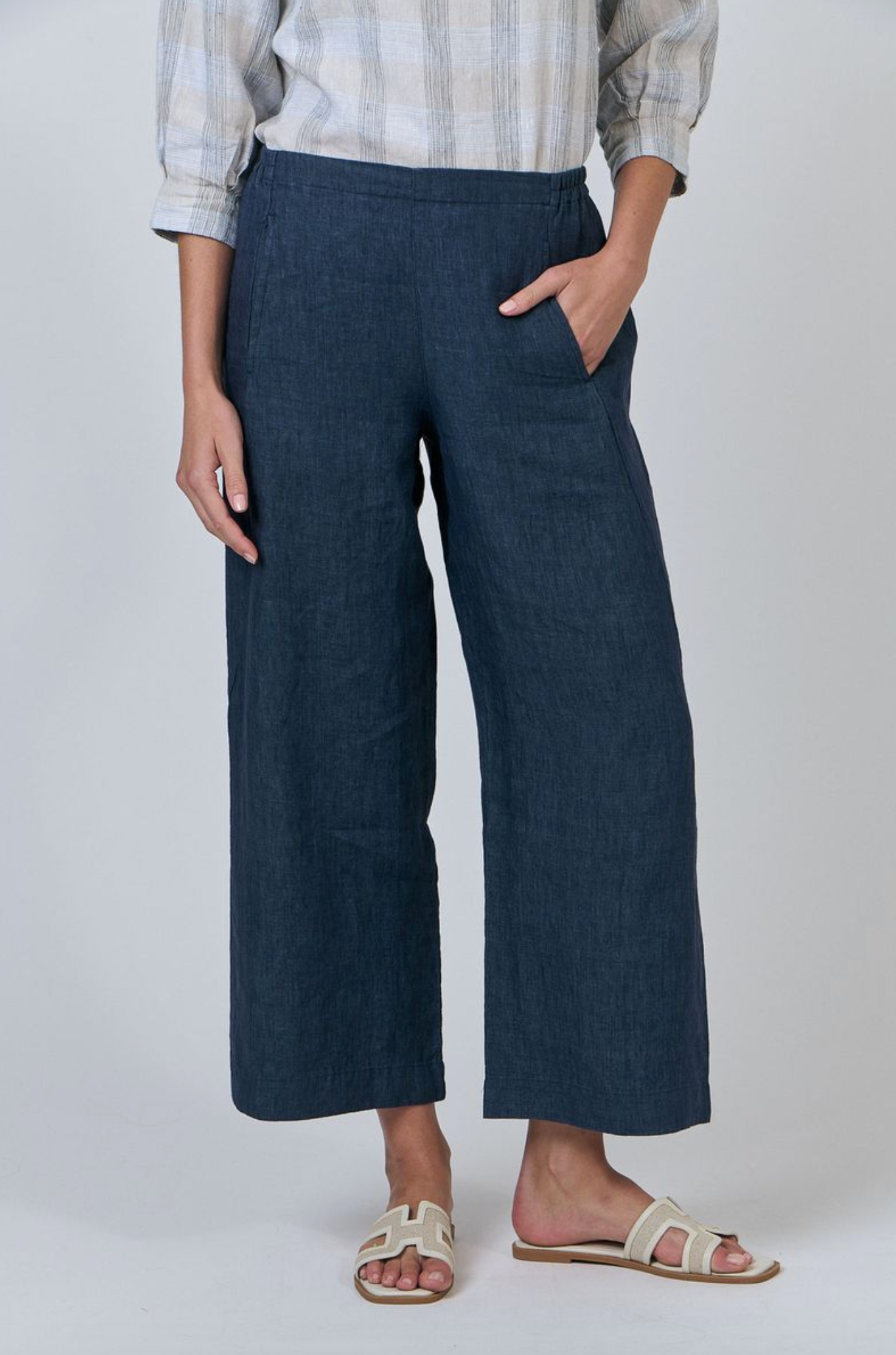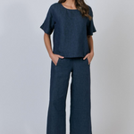 GA398 is a full-length, wide-leg pant featuring two front pockets. Made from 100% breathable linen, this is a tailored look that pairs with just about anything, from a cosy sweater to a loose-fitting shirt. Gathered detailing at the back waistband offers an ultra-flattering design.