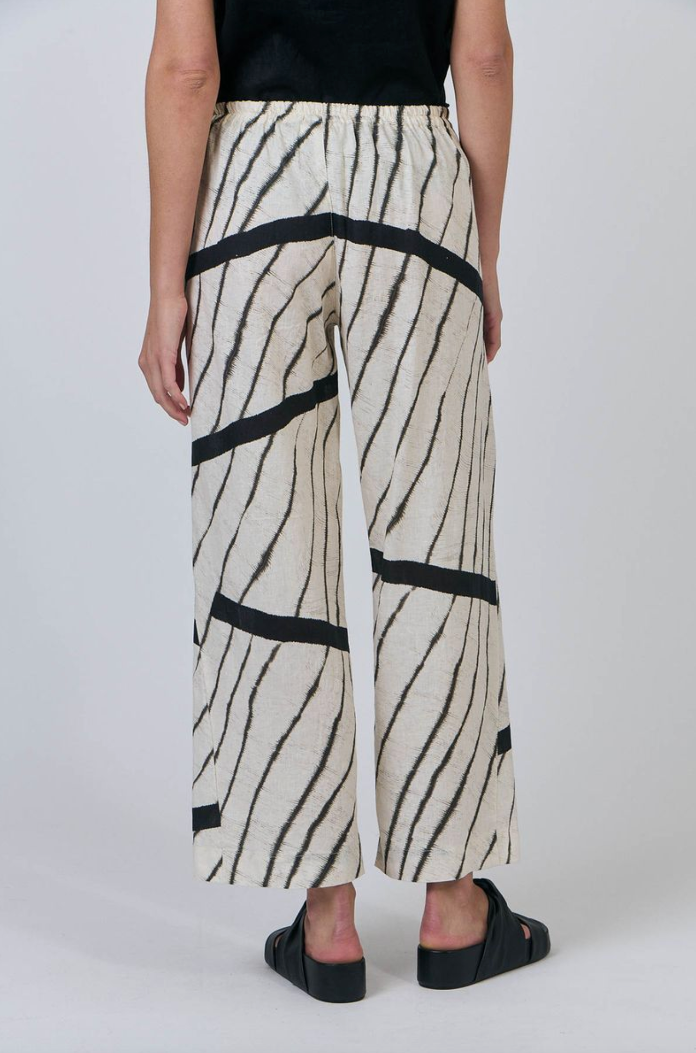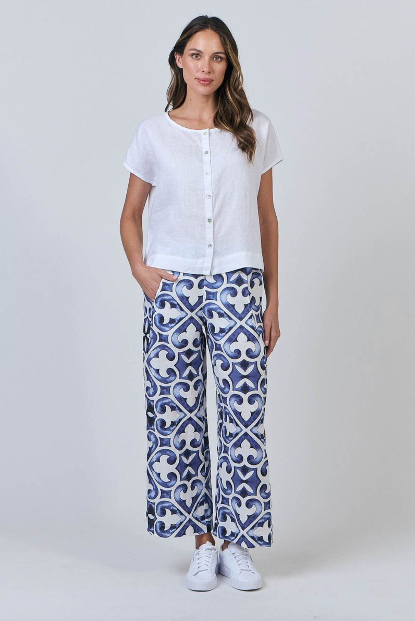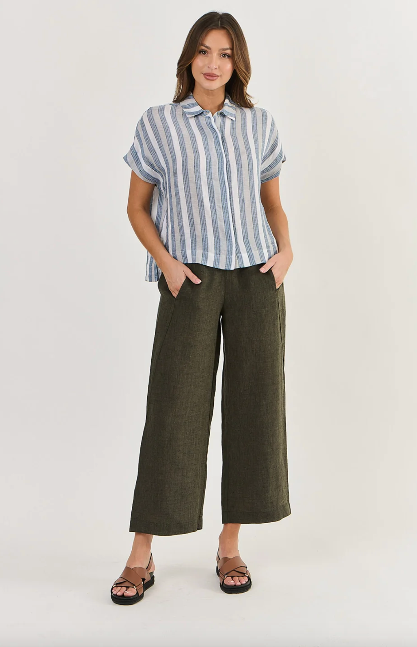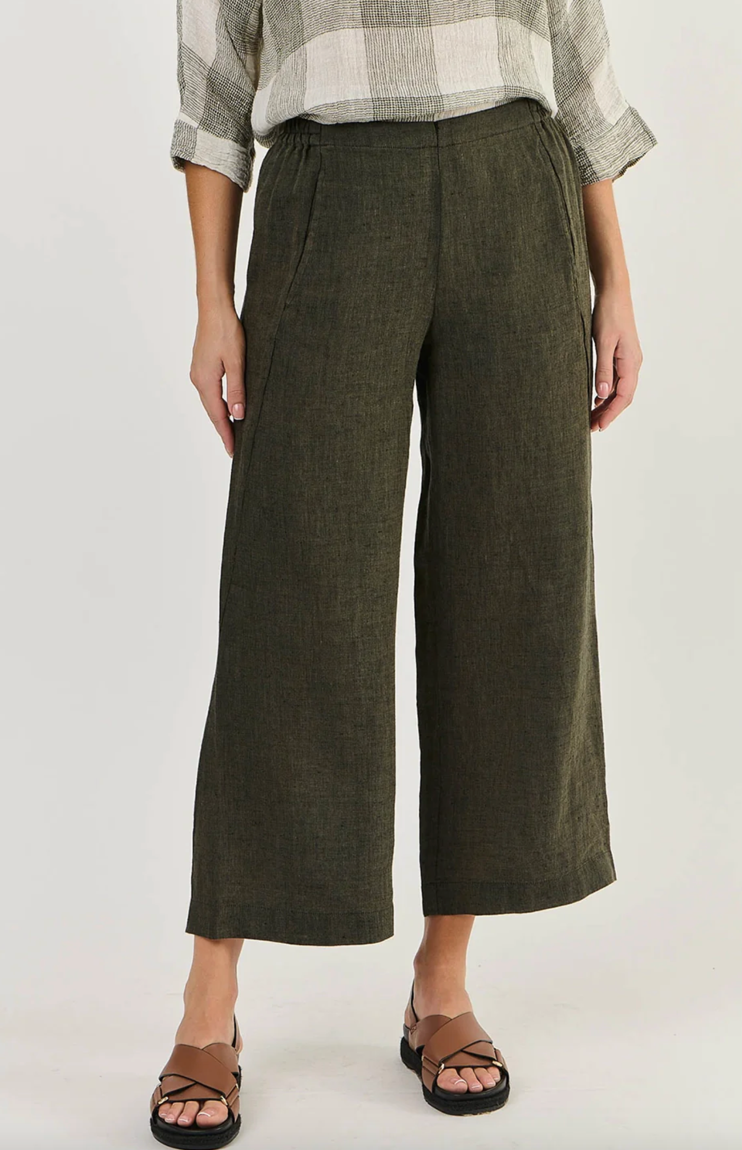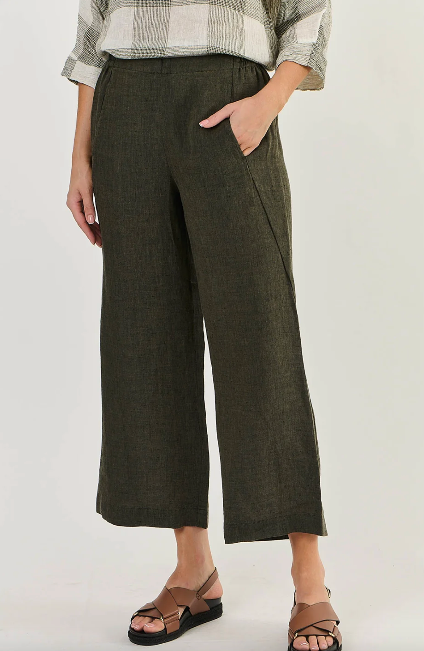 GA398 is a full-length, wide-leg pant featuring two front pockets. Made from 100% breathable linen, this is a tailored look that pairs with just about anything, from a cosy sweater to a loose-fitting shirt. Gathered detailing at the back waistband offers an ultra-flattering design.
