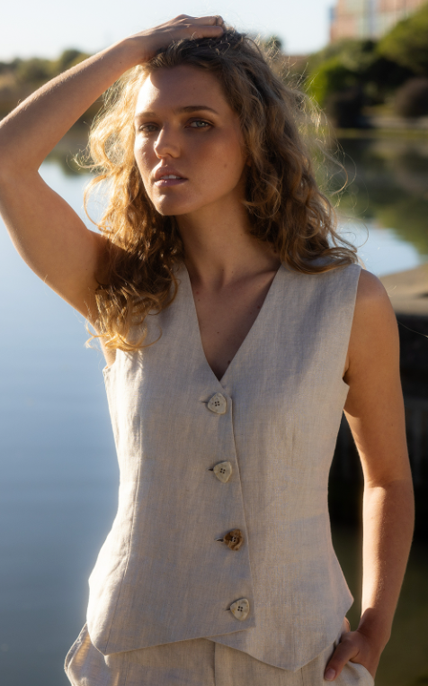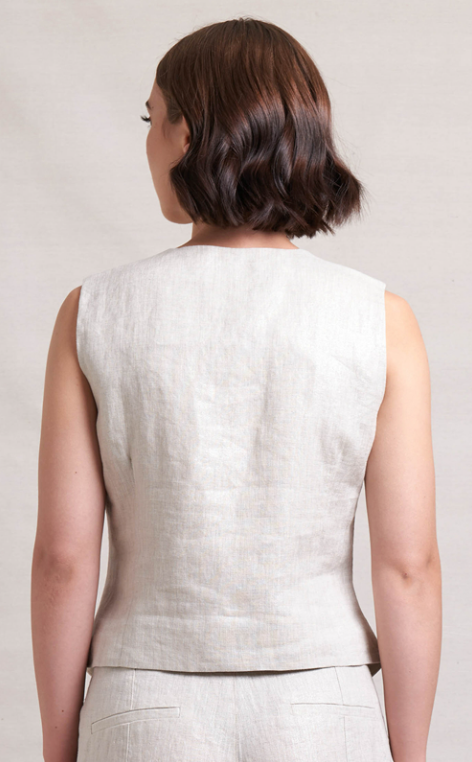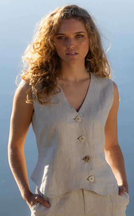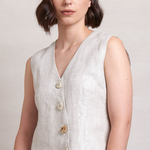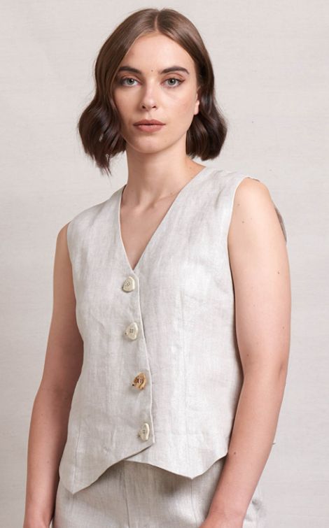 The In Ore Vest by Neris is made from 100% linen and has a subtle shimmer through the fabric. It has a v-neckline and does up with mottled mismatched buttons.