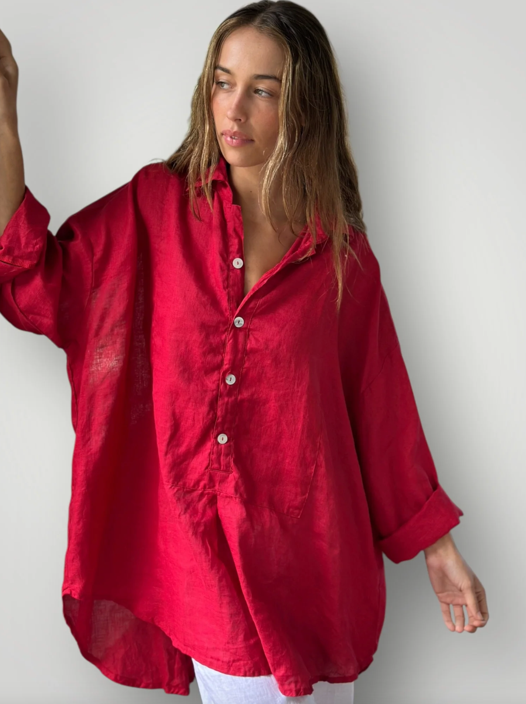 shirt with button down and front panel, falling lower at the back with a feature pleat at the back hem