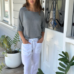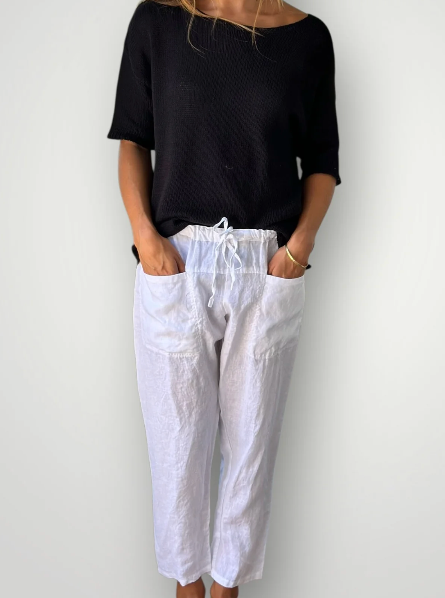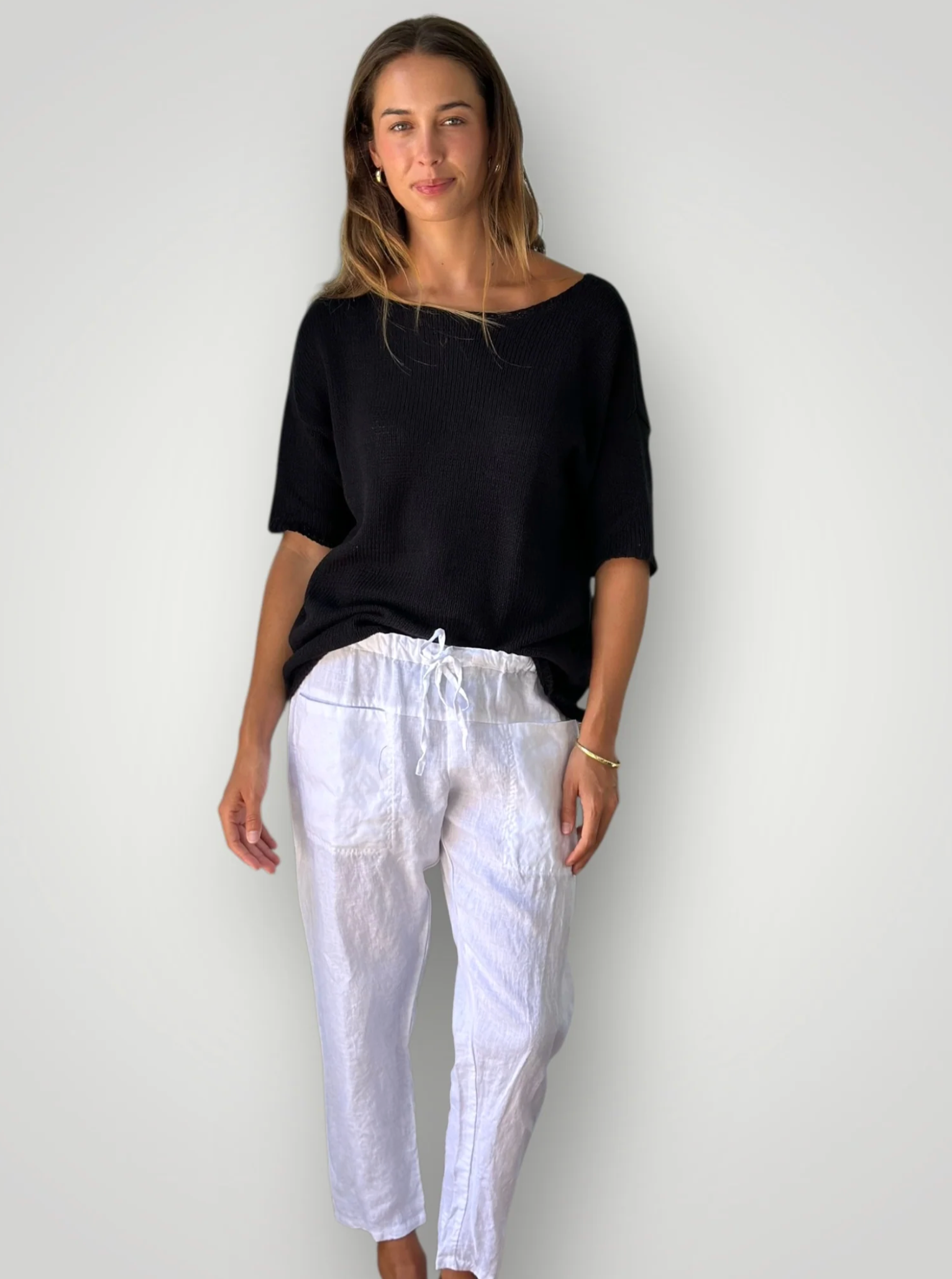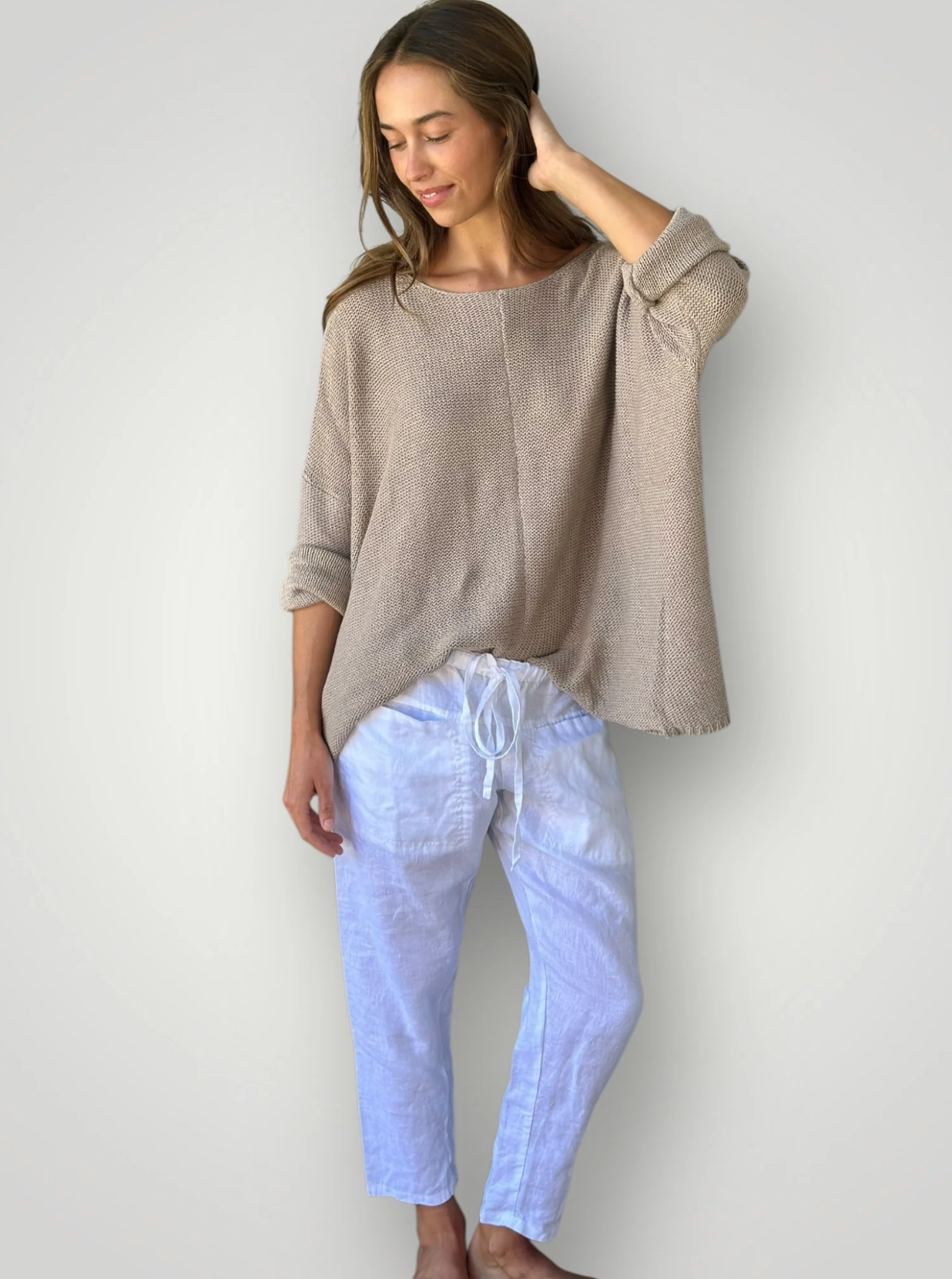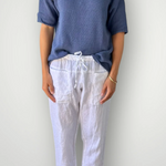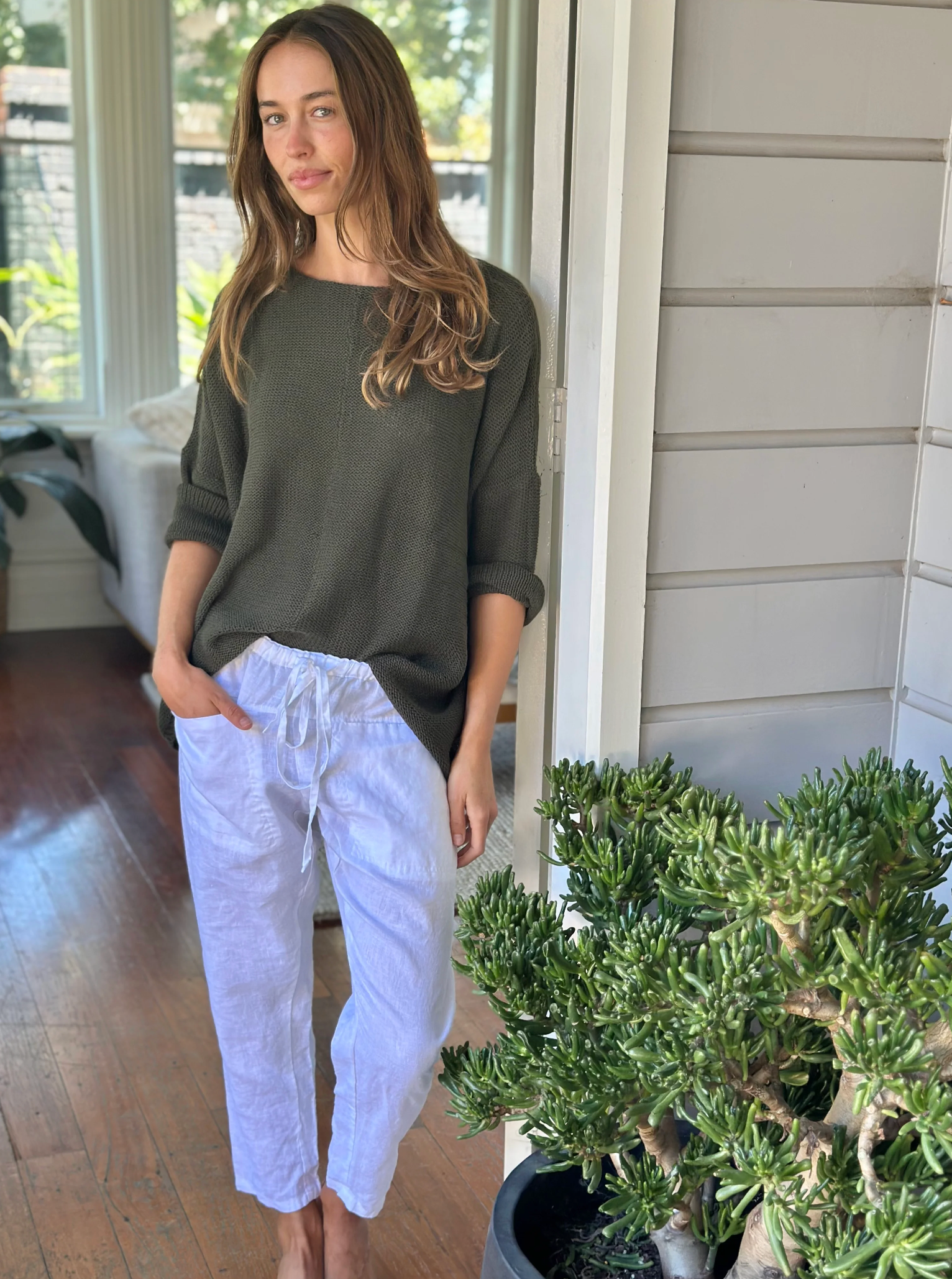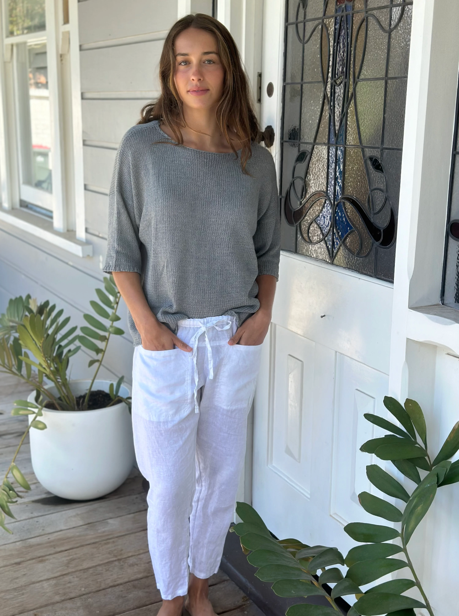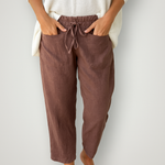 Jessie pant is one of frockks best selling pants. 4/5 length with an elasticised drawstring waist and 2 front pockets. Relaxed wearing with tapered leg. Also features a seam up the back legs, in 100% washed European flax linen -medium weight ( not sheer )