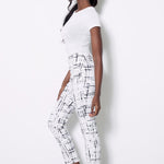 This ankle-length slim-fit pant features a high-rise pull-on waistband with built-in tummy control, designed to smooth and flatter the waistline. Styled in a bold black and white abstract paint stroke print, the sleek silhouette enhances the leg line while subtle petal slits at the hem add a touch of elegance. *SIZES ARE IN AU FOR ORDERING*