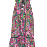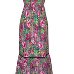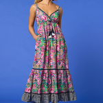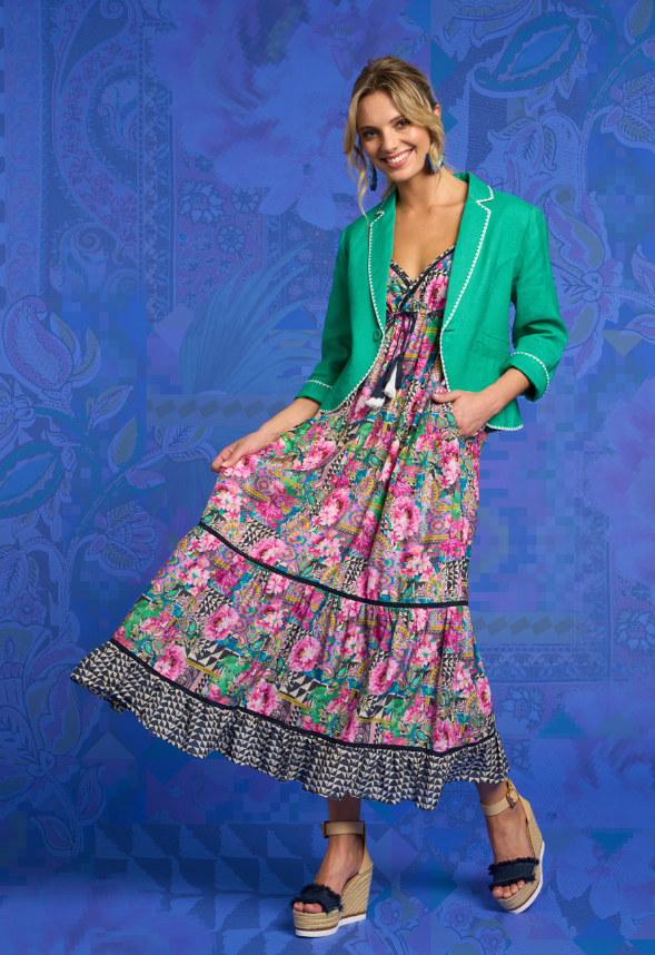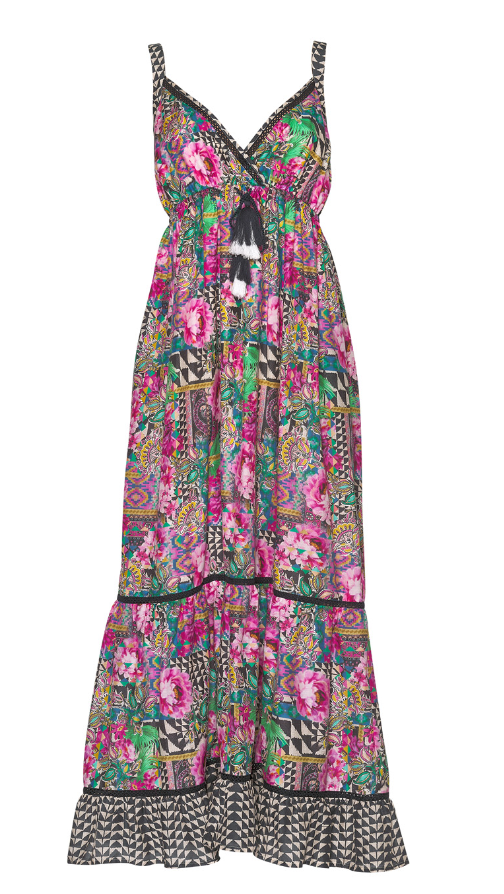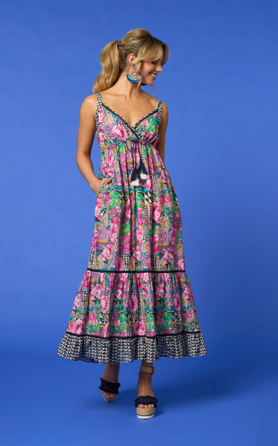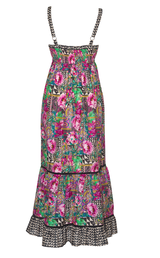 A gorgeous sundress with adjustable straps and a cross over bust, with an elasticated waist, and a shirred back. Featuring two contrast prints, with cotton lace trim design lines, and a tassel draw cord. In a Silk and Cotton blend, fully lined.
