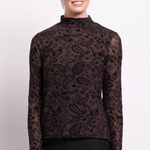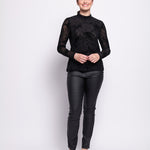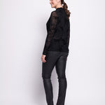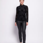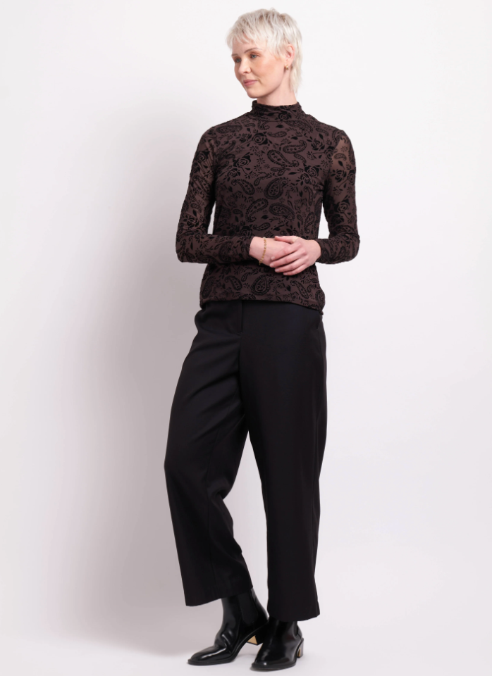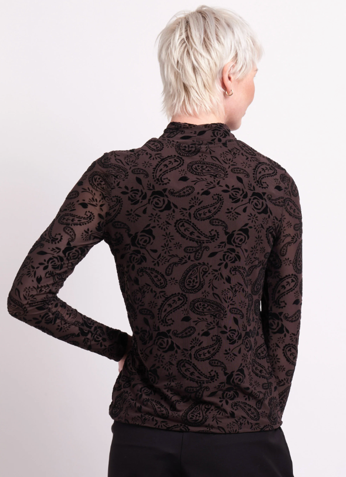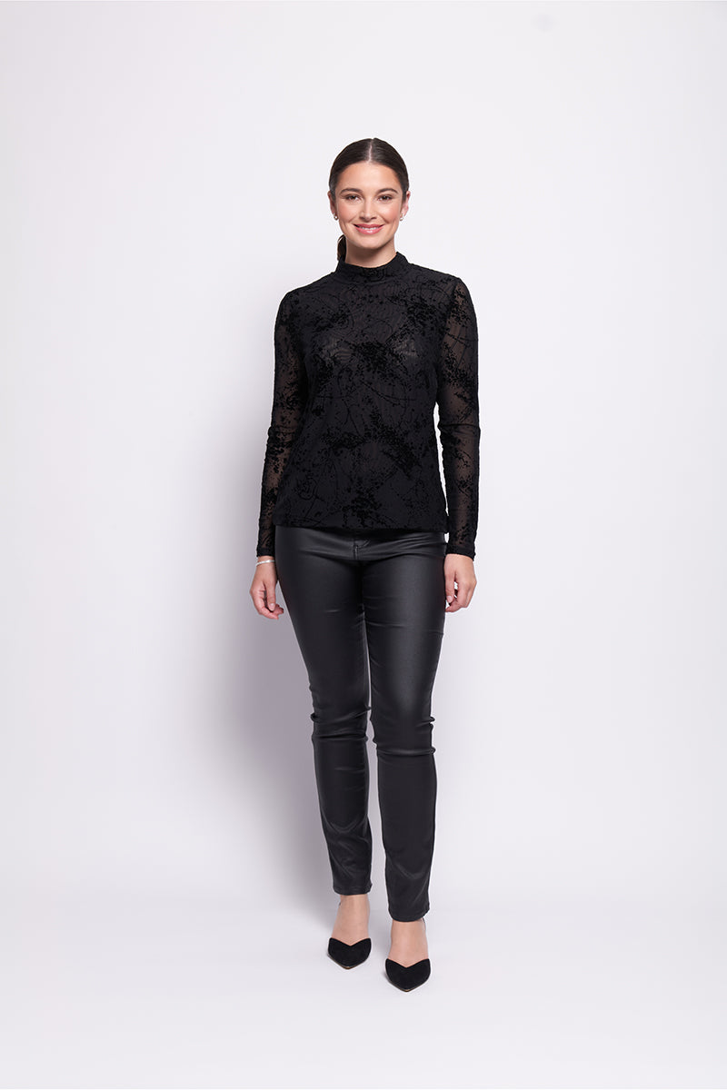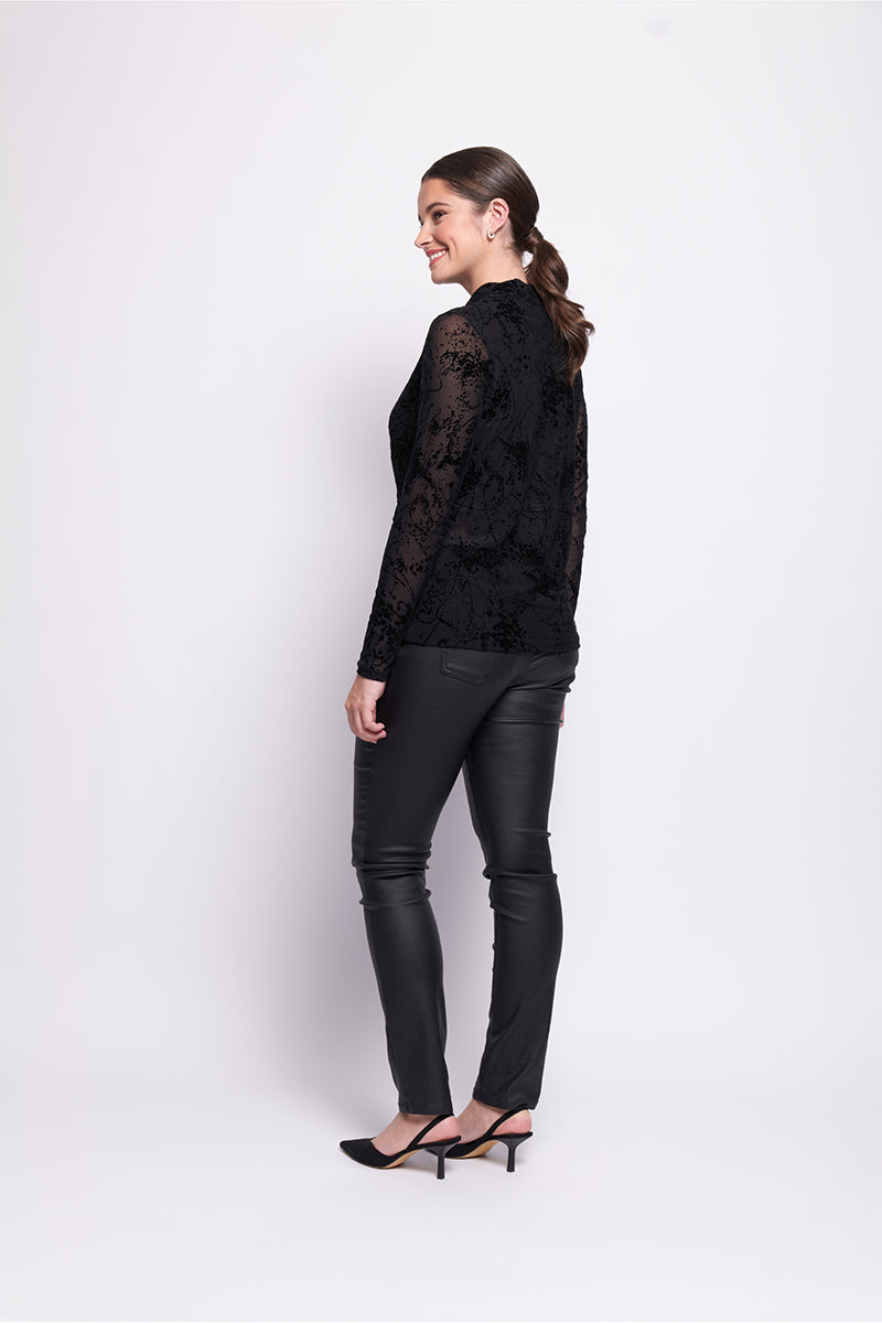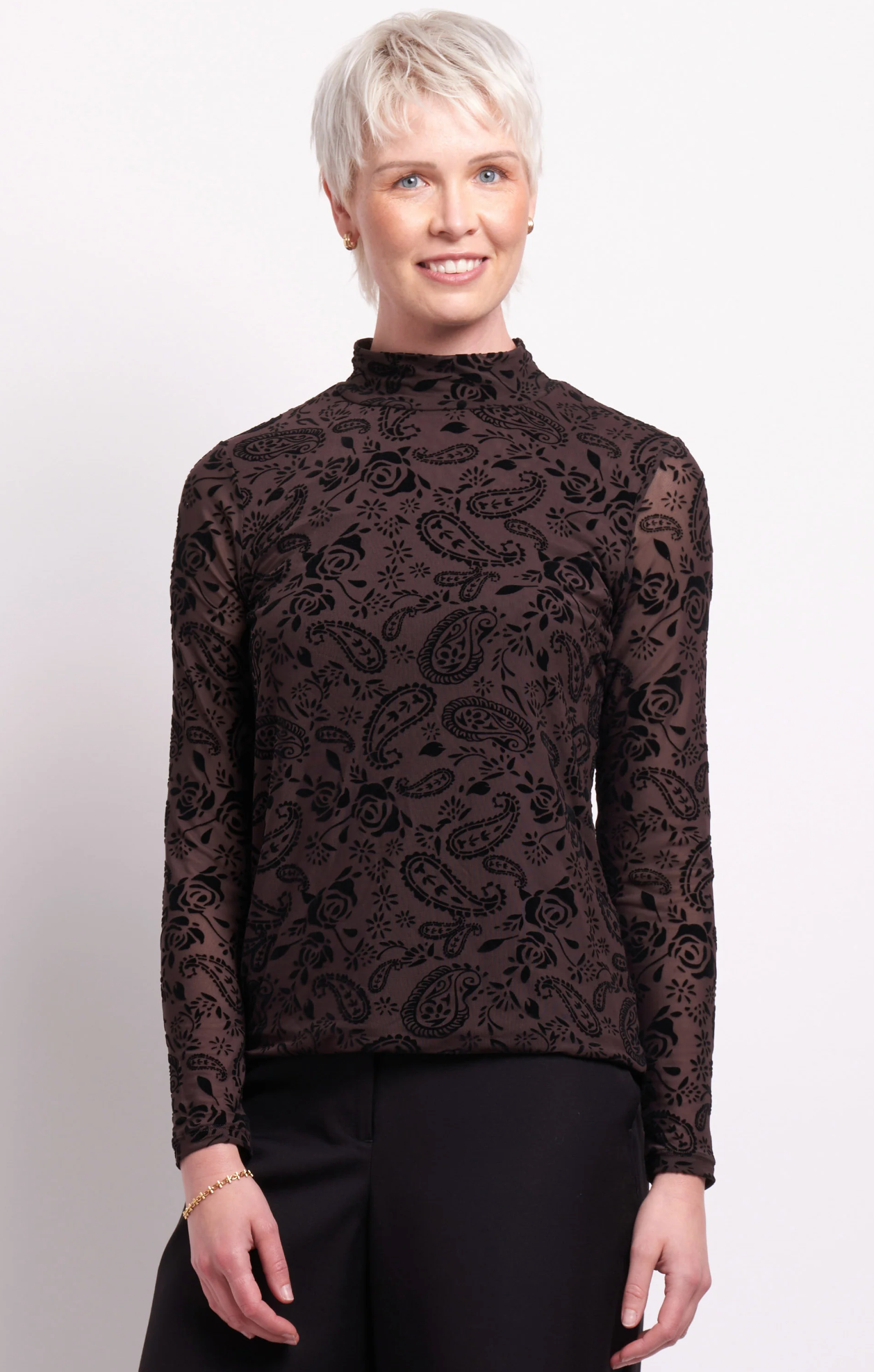 Velvet burnout mesh top with a high polo neck. Add texture and interest to your outfit. The body is lined for extra coverage while the sleeves are unlined. Body length from the shoulder to the front hem is approx. 65cm (size Medium).