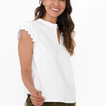 Curved neckline framed by elegant ruffles with a keyhole opening and button closure