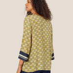 Brighten up your wardrobe with this vibrant top. The light and airy viscose is adorned with an artistic print, with the rich yellow and blue hues creating a serene, effortless look. The top has a flattering A-shape cut, featuring three-quarter-length sleeves and a small slit at the neck. Style with jeans or dark blue trousers for a flawlessly feminine look.