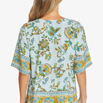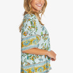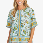Light, breezy, and full of charm, the Colette Top features a summery boho-inspired border print on soft, drapey 100% viscose. With a relaxed silhouette, it’s designed with a round neckline and sleeves that sit just on the elbow, offering easy elegance for warm days. Effortlessly pair it with denim, linen pants, or a floaty skirt for a laid-back look with a touch of bohemian flair.