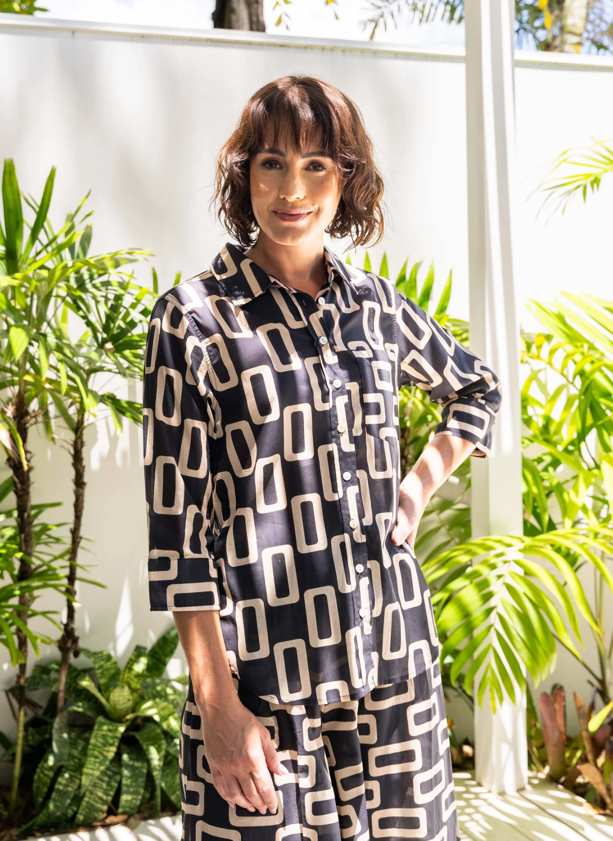 Make a bold statement in the See Saw 3/4 Sleeve Shirt featuring a playful abstract geometric print in black and natural tones. Lightweight and breathable, this relaxed button-up brings effortless charm to everyday wear, whether styled with the matching pants or dressed down with crisp linen.