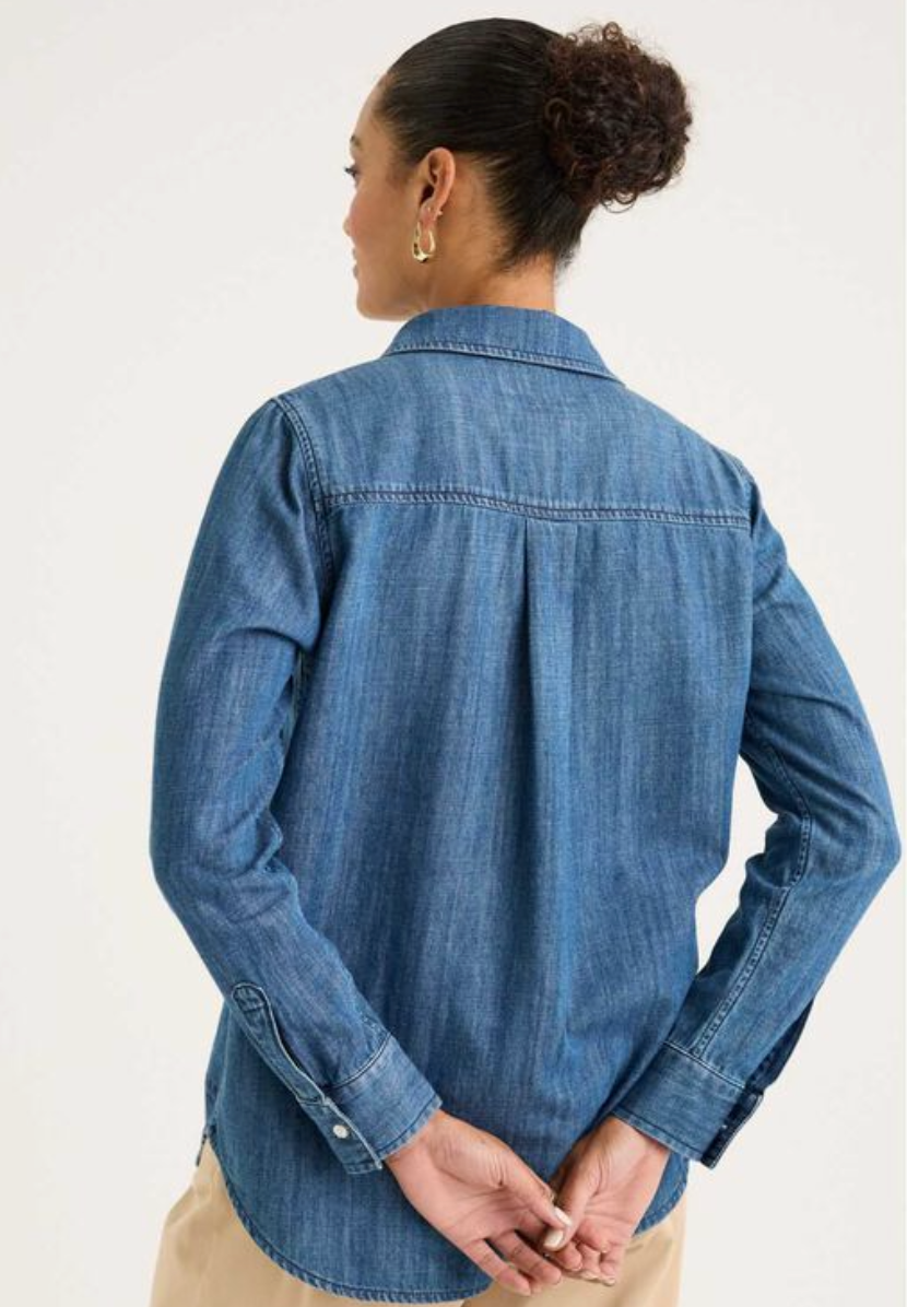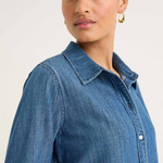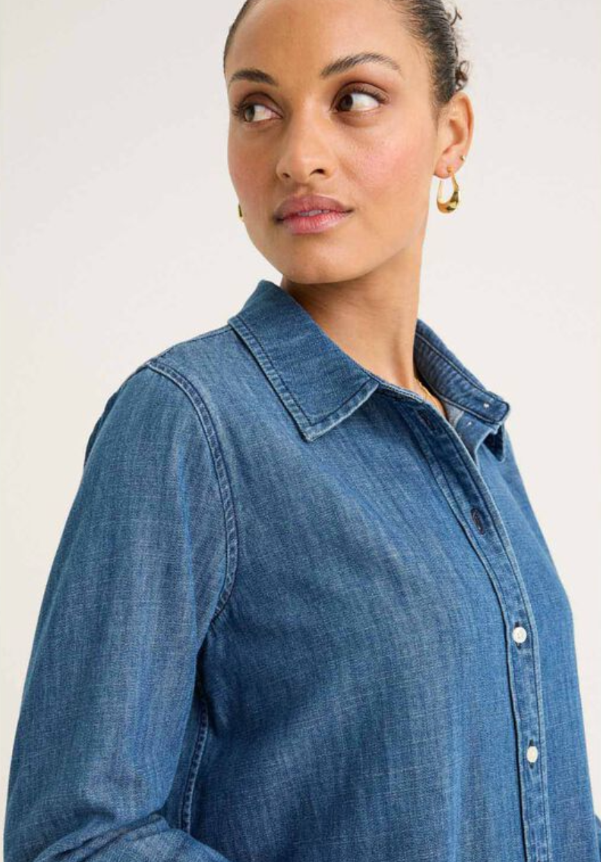 The Citrine Shirt in chambray is a modern take on a classic. With a crisp shirt collar, button-through front placket, and long sleeves with cuffs , it offers a timeless, polished look. The dual curved hem adds a flattering finish, while the regular fit ensures comfort and ease. Perfect for pairing with jeans for a relaxed style or dressing up with tailored trousers for a more refined look, the Citrine Shirt is a versatile addition to any wardrobe.