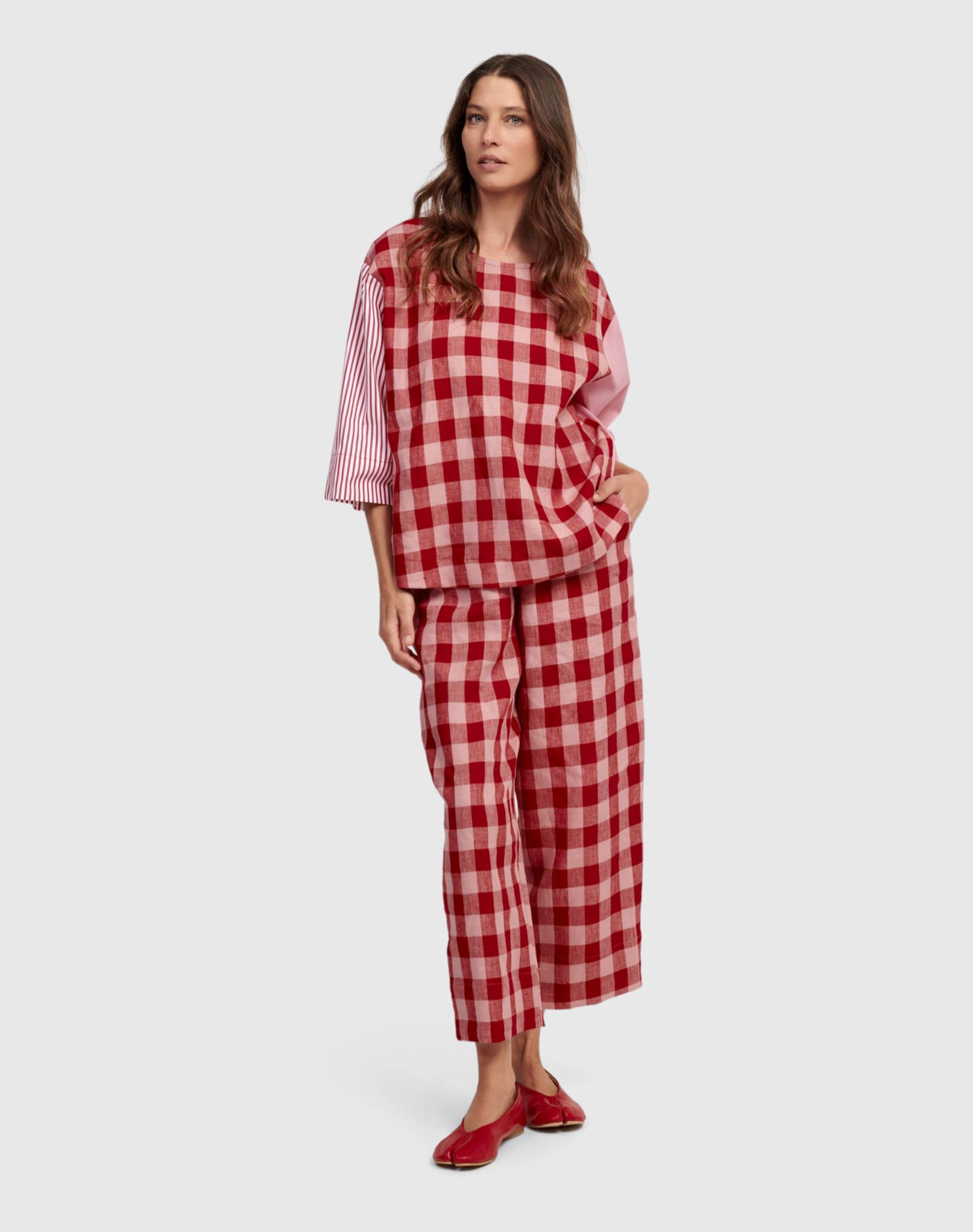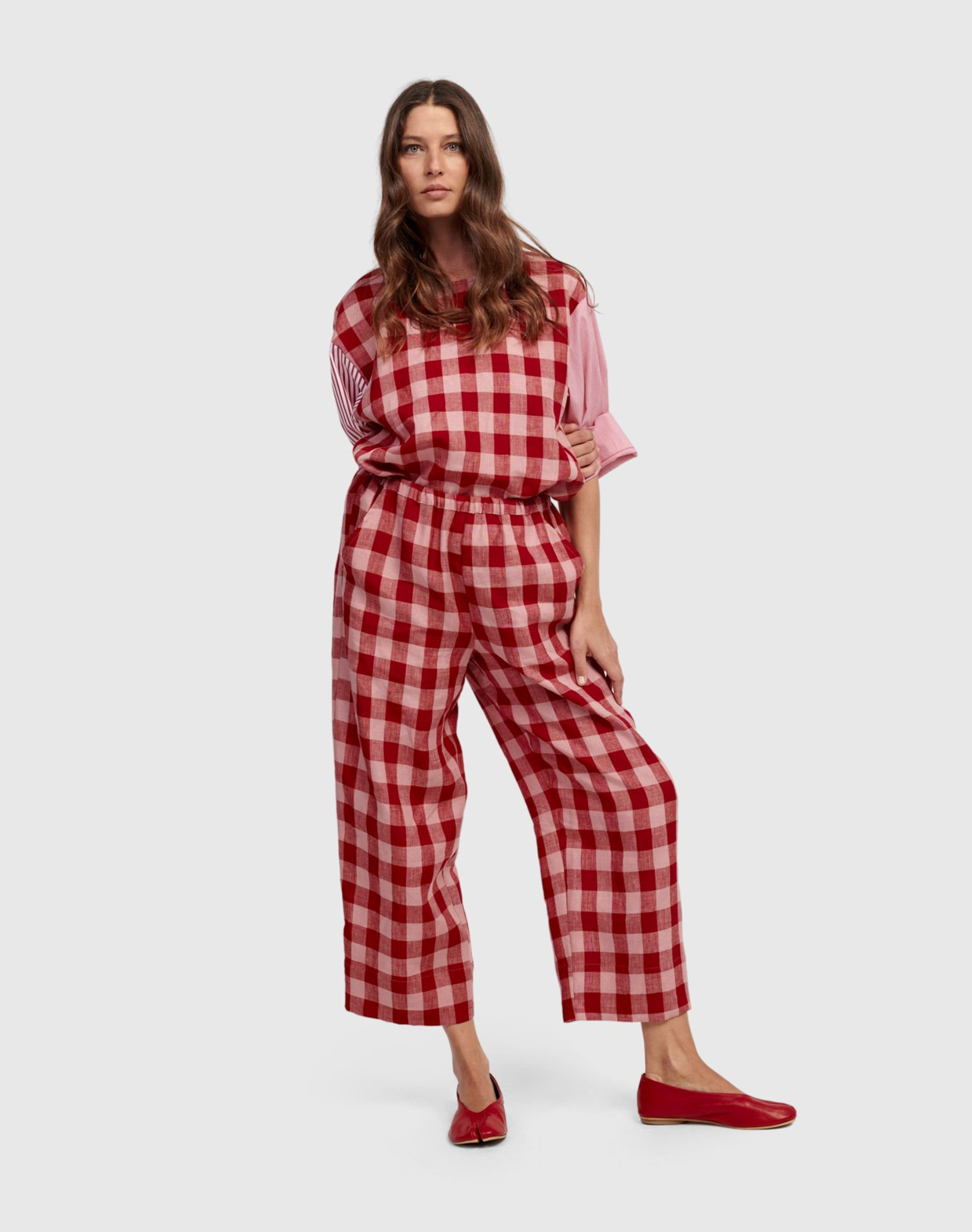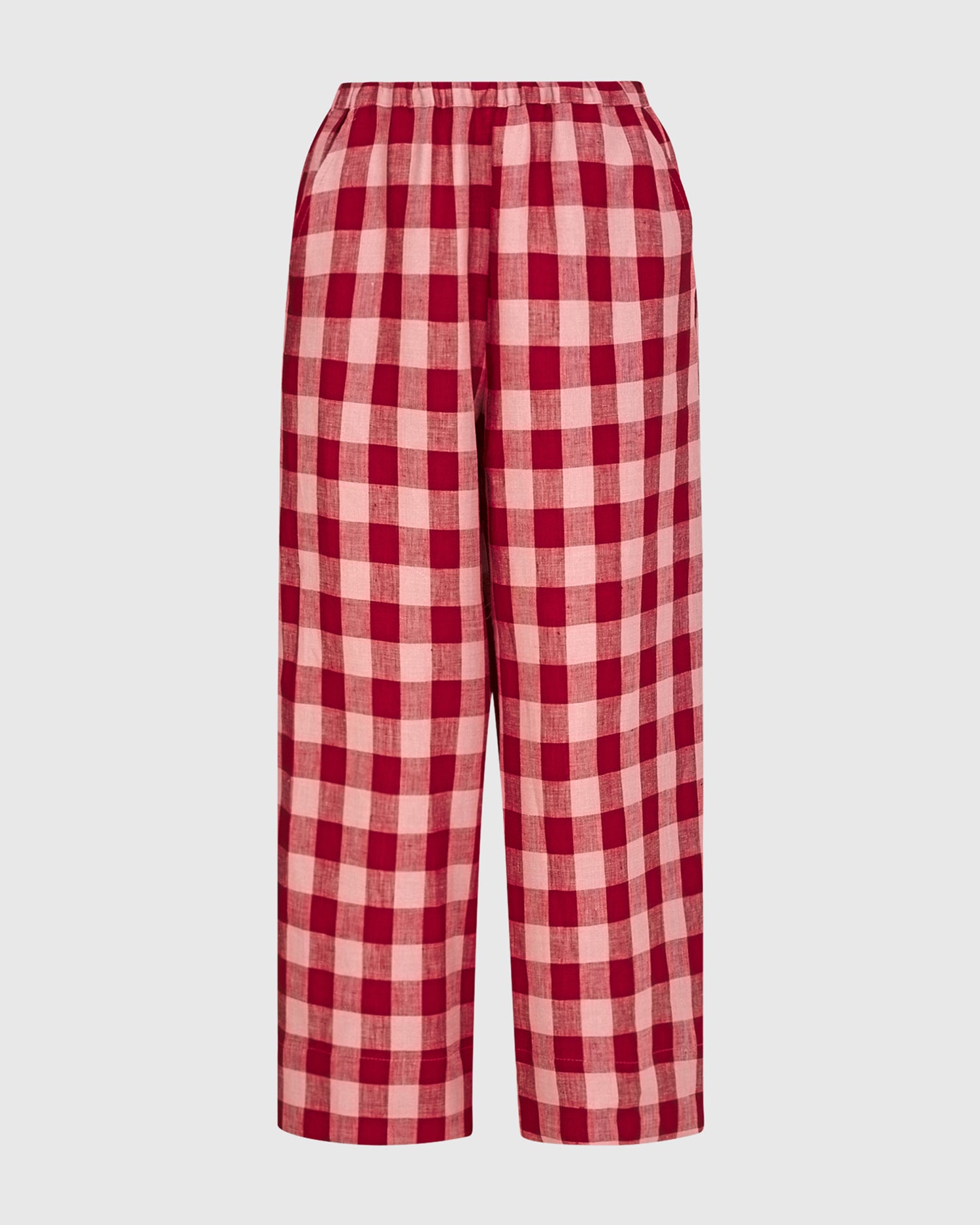 These stylish pants from Alembika offer a fresh and playful look. Featuring a relaxed fit with an elasticated waist and convenient pockets, they come in a vibrant red and pink check pattern. Crafted from breathable linen, they are ideal for warm weather. Wear them with the coordinating top for a polished outfit or pair with a white tee for a chic, casual appearance.