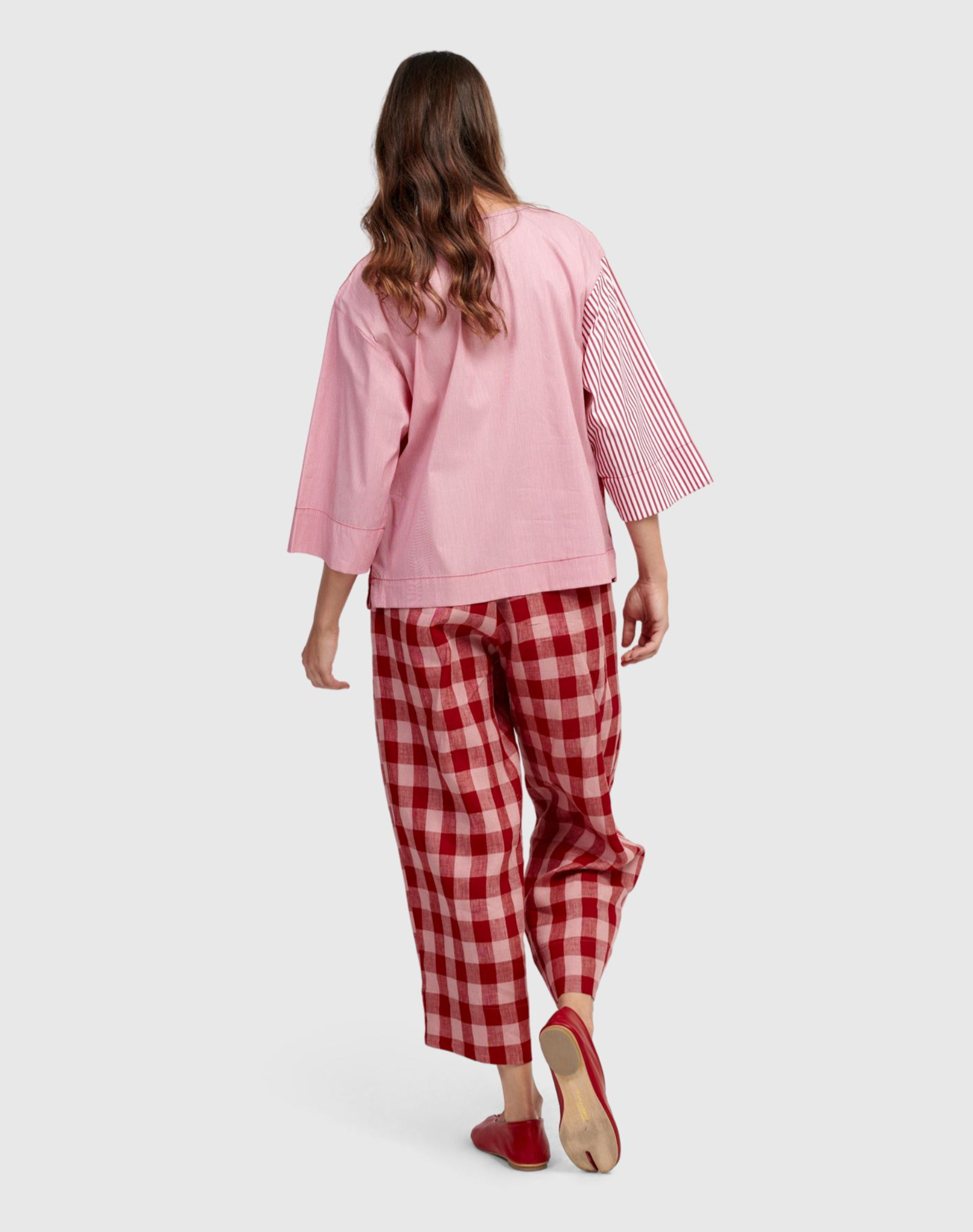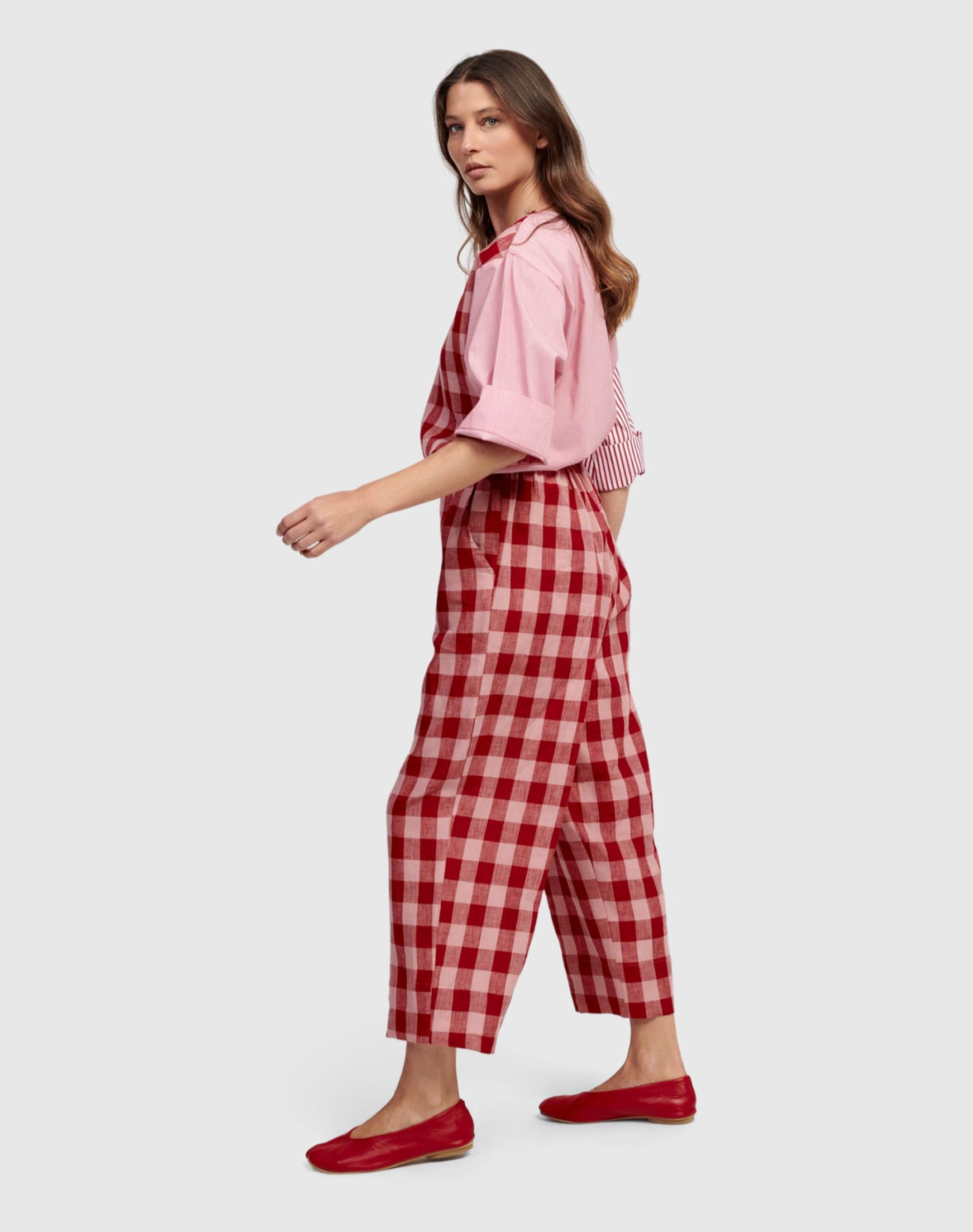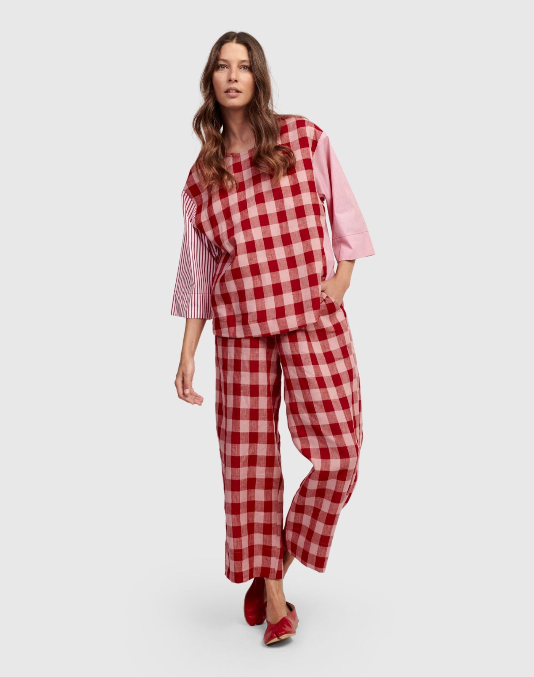 These stylish pants from Alembika offer a fresh and playful look. Featuring a relaxed fit with an elasticated waist and convenient pockets, they come in a vibrant red and pink check pattern. Crafted from breathable linen, they are ideal for warm weather. Wear them with the coordinating top for a polished outfit or pair with a white tee for a chic, casual appearance.