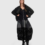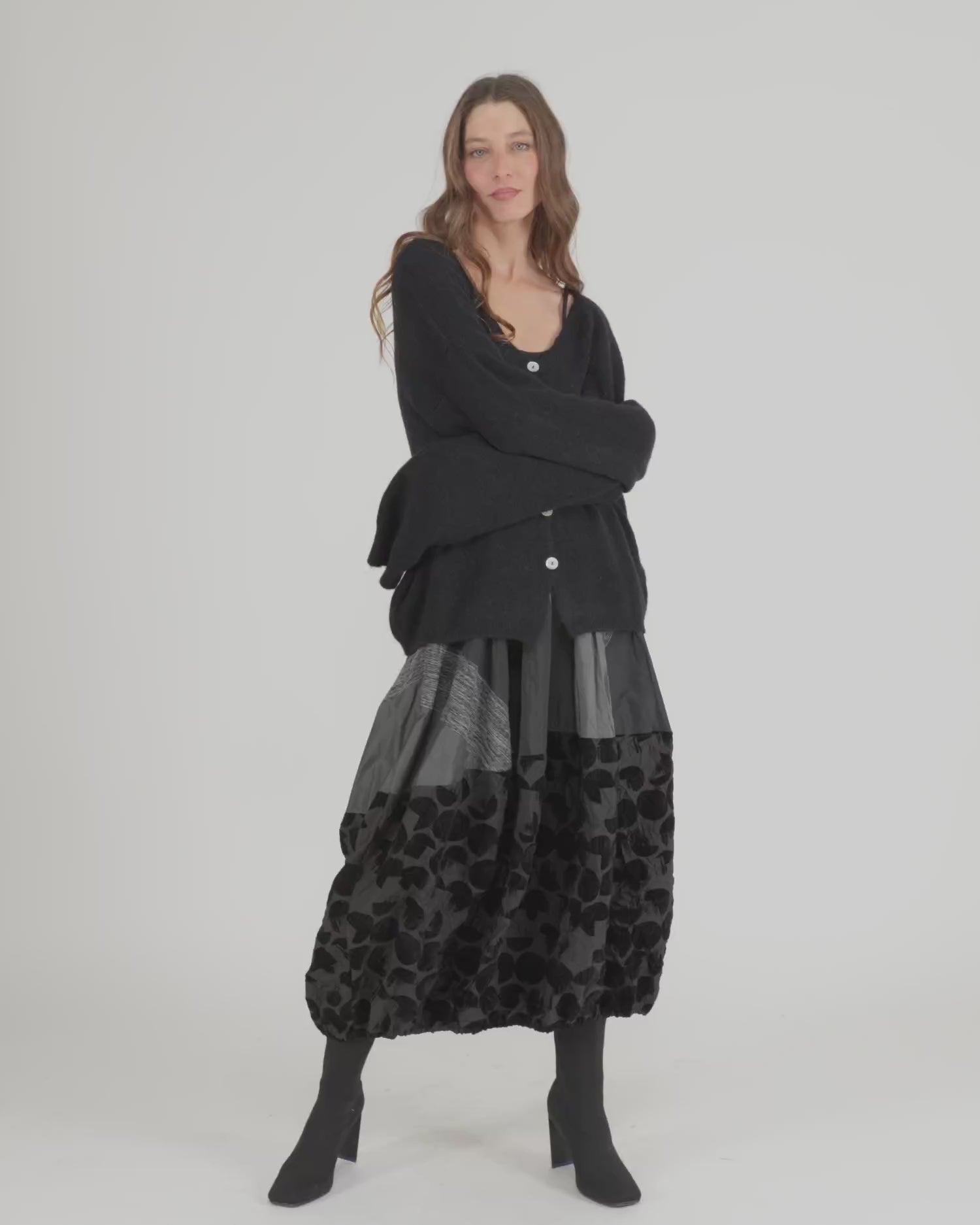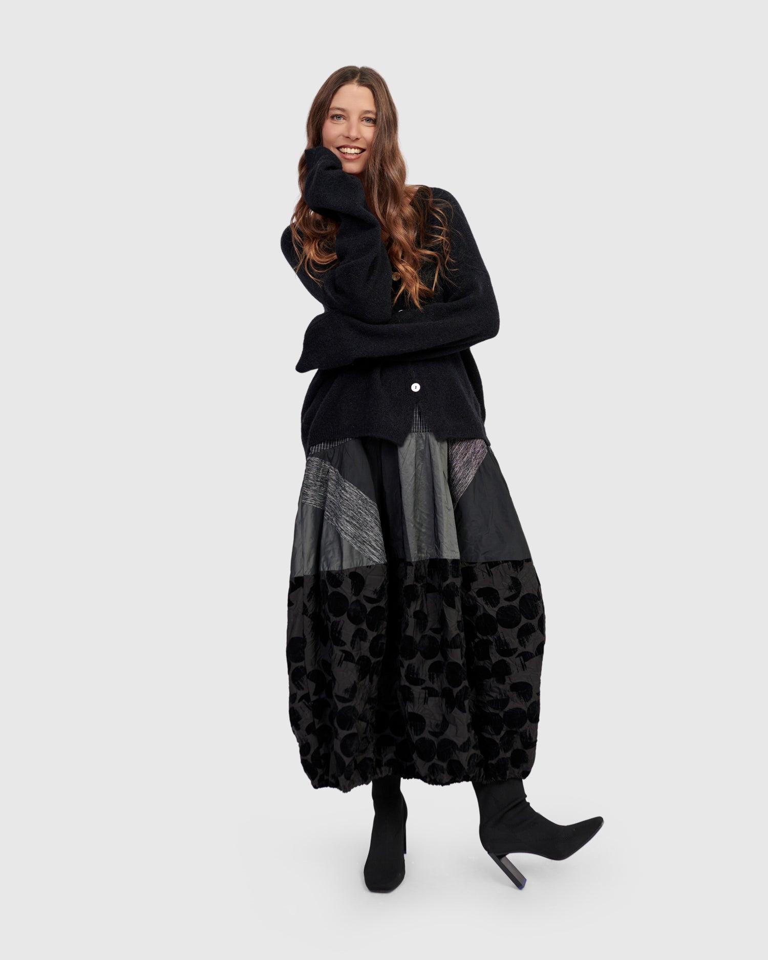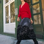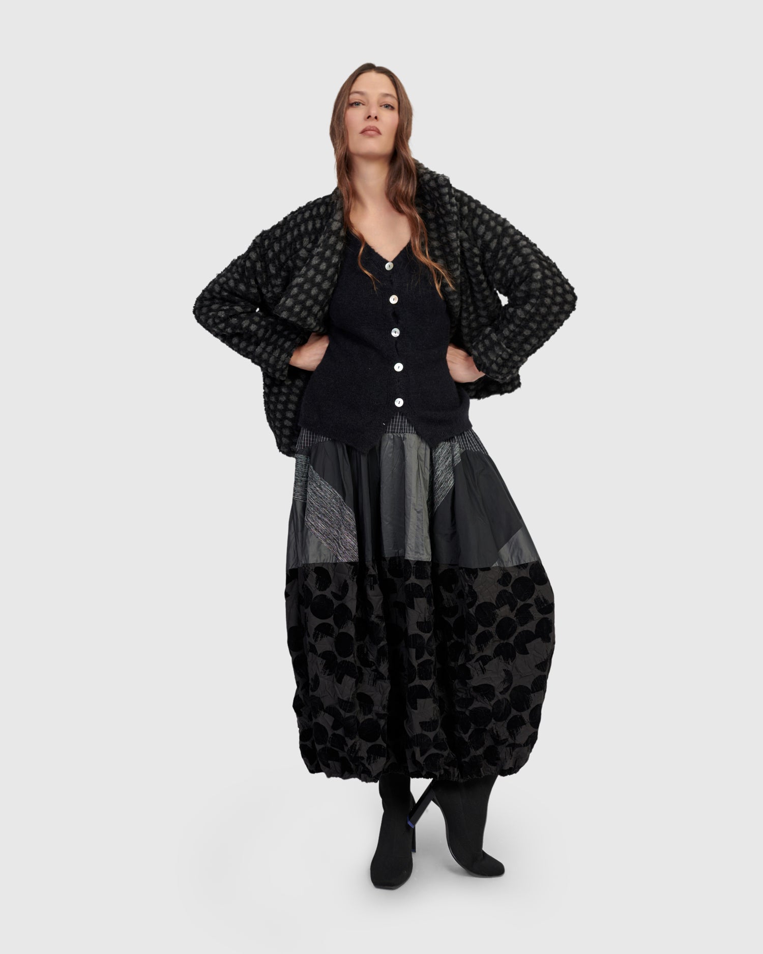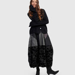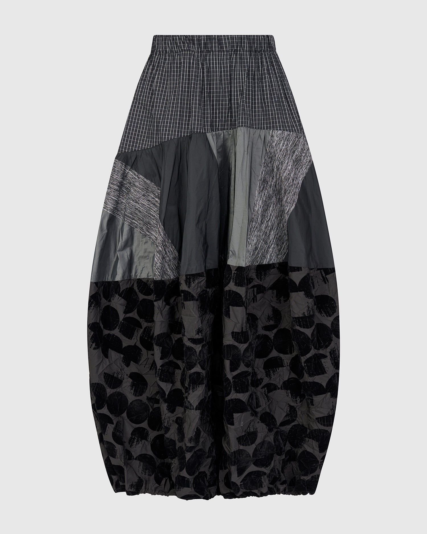 This sculptural skirt features Alembika's signature cocoon silhouette in a modern mashup of woven textures. Designed with a comfortable stretch waist and generous side pockets, it offers everyday ease with subtle drama. Pieced construction adds depth, while the maxi length provides a fluid, column-like line that flatters all heights. Effortless to style with boots or slides.